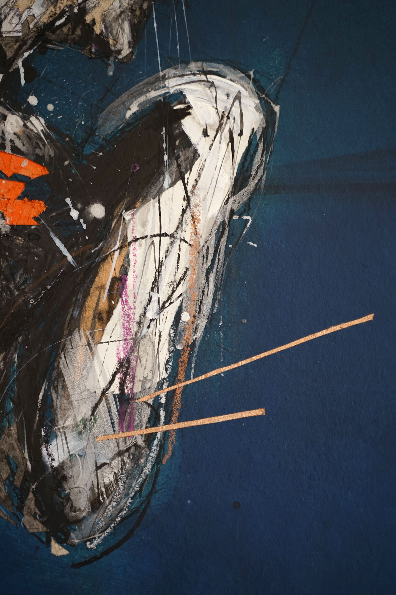 With a few colours (blue, lightened with a few colourful orange touches) and impressive technical ability, Hongyu Zhang captures the beauty and presence of this Renaissance masterpiece. By engraving, he captures the contours and volumes of the statue hollowing out the surface of its support (a cardboard panel). The line – legacy of his traditional Chinese calligraphy training – is the fundamental element of his art: it is used here to give dynamism, and even an impression of movement in his subject. The artist then applies the colours using different techniques: ink, acrylic paint and pastel.