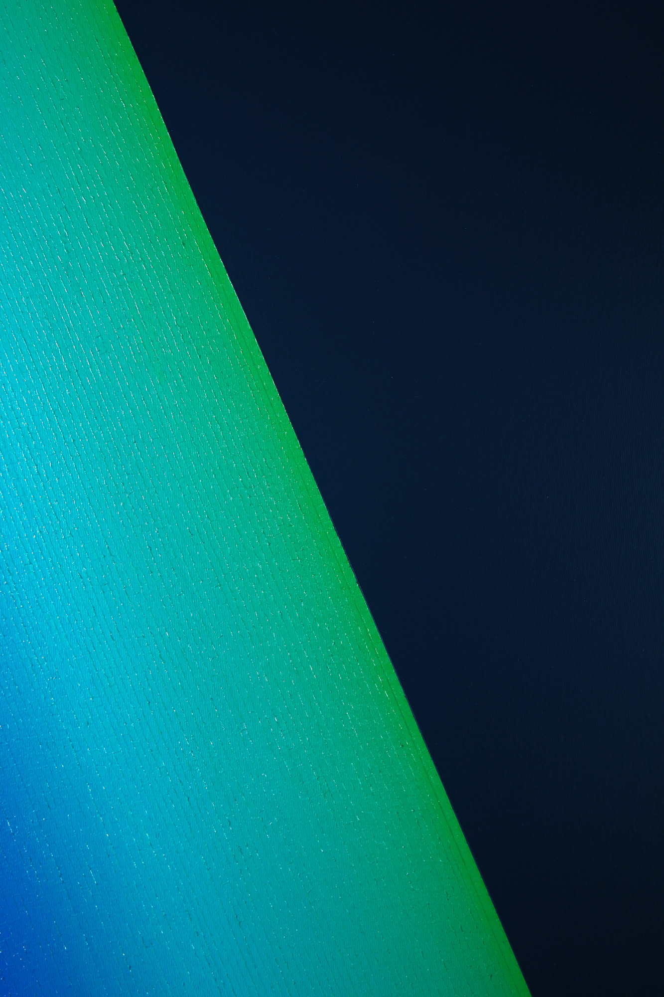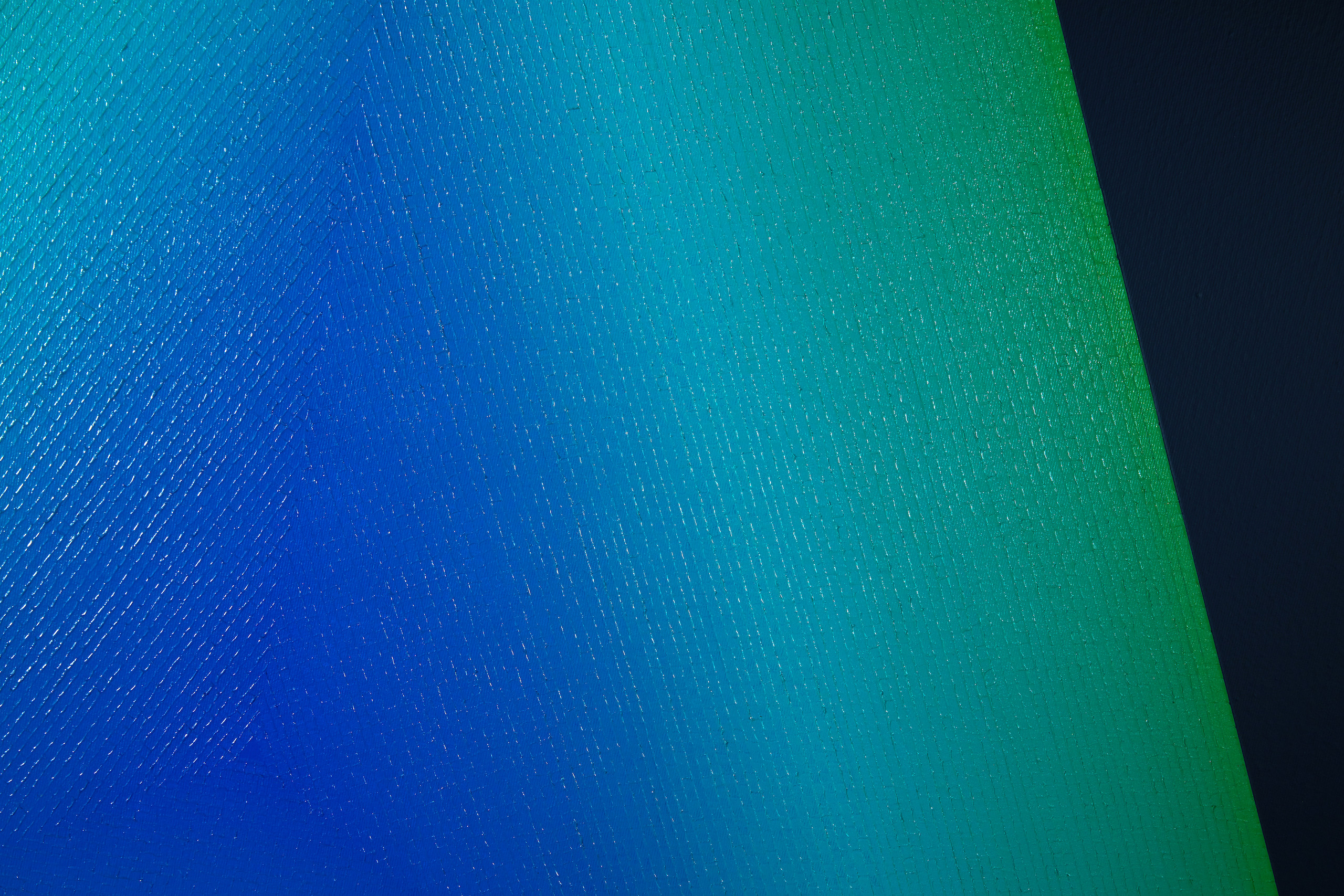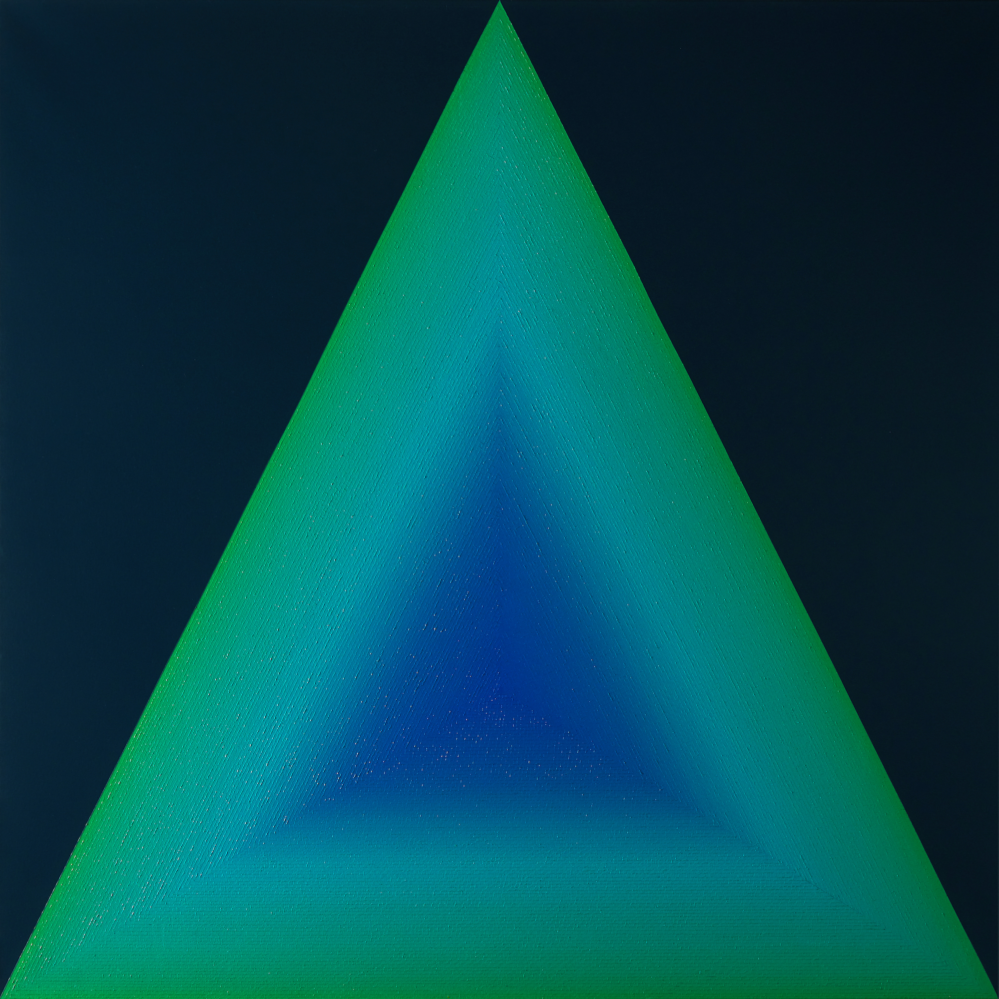 Mathieu Piffeteau works with all colours except red; for this painting, he used shades of green and blue. In this painting, we can appreciate a visual effect of intense luminous radiation, an optical illusion created by the artist using a long gradation of colours.