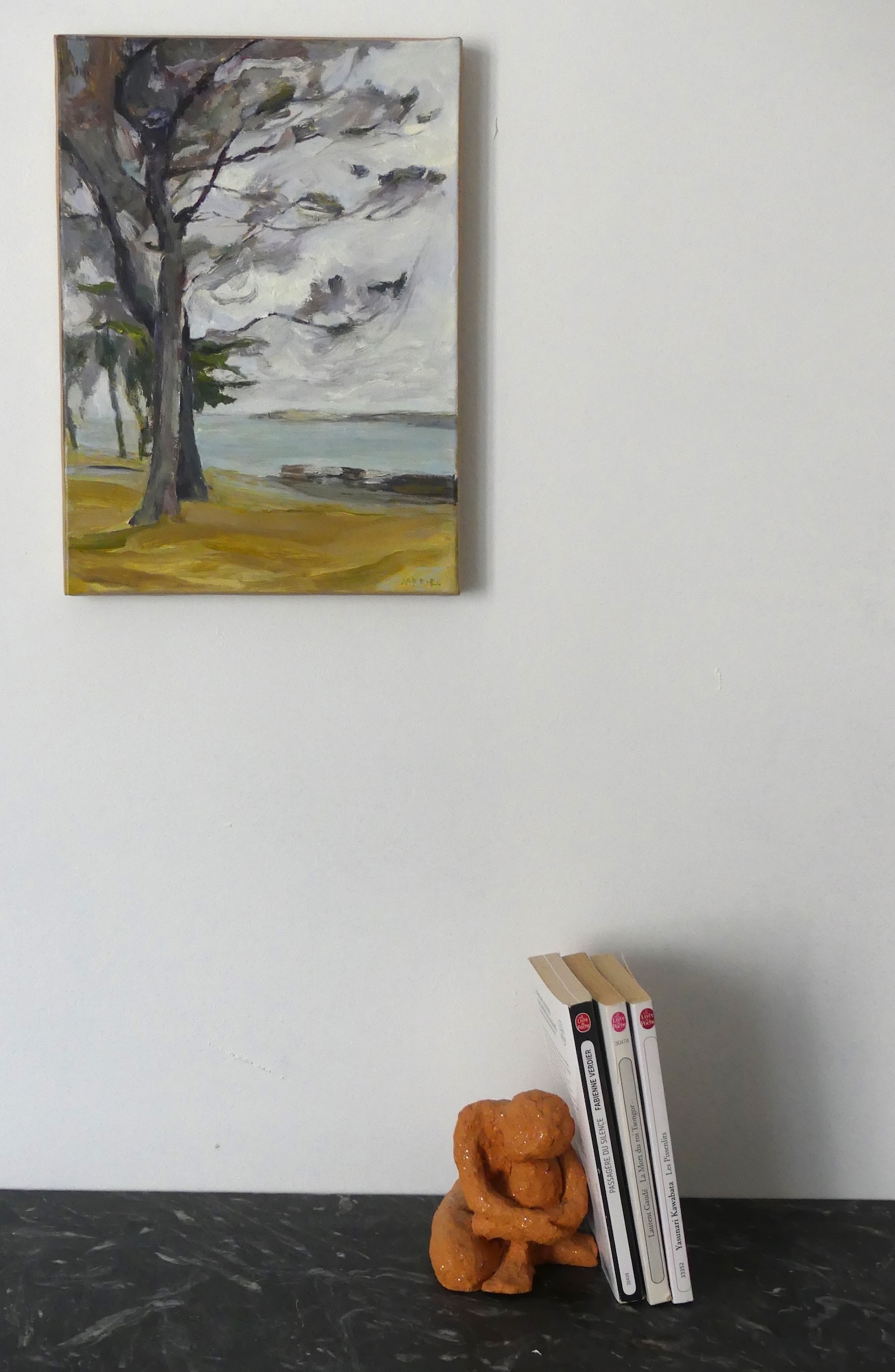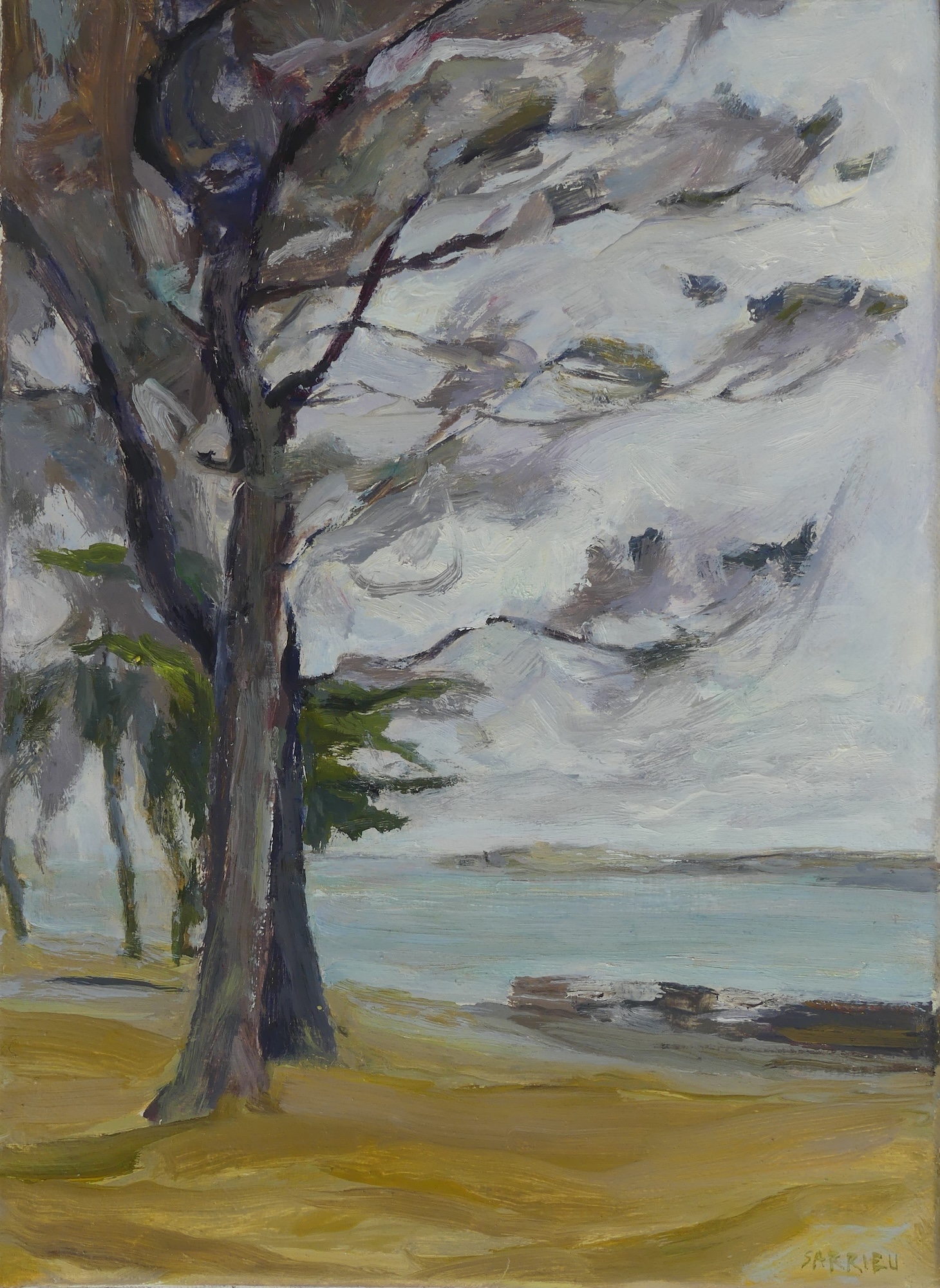 Two pines on Île Grande is a work by the artist Valerie de Sarrieu. This oil painting is part of the “En plein air” series. This painting depicts two trees by the sea in Brittany. The cold colors and the luminosity of the sky reflect the beauty of the northern seaside.