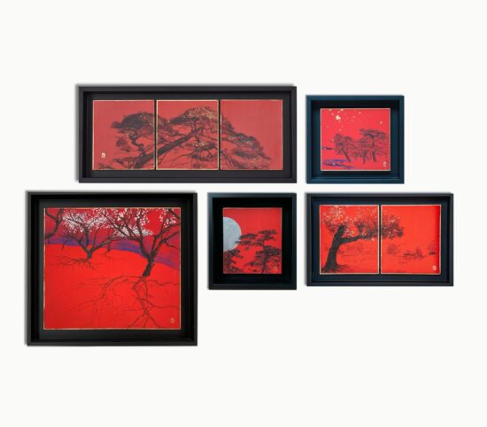 Through her paintings, the artist sublimates these places varying the seasons and times in her several depictions. Plum and cherry blossoms, pines, weeping willows, the artist places a lot of importance on nature and trees in her works of art. This series is characterized by the use of India ink combined with color and the use of gold, copper and silver leaves.