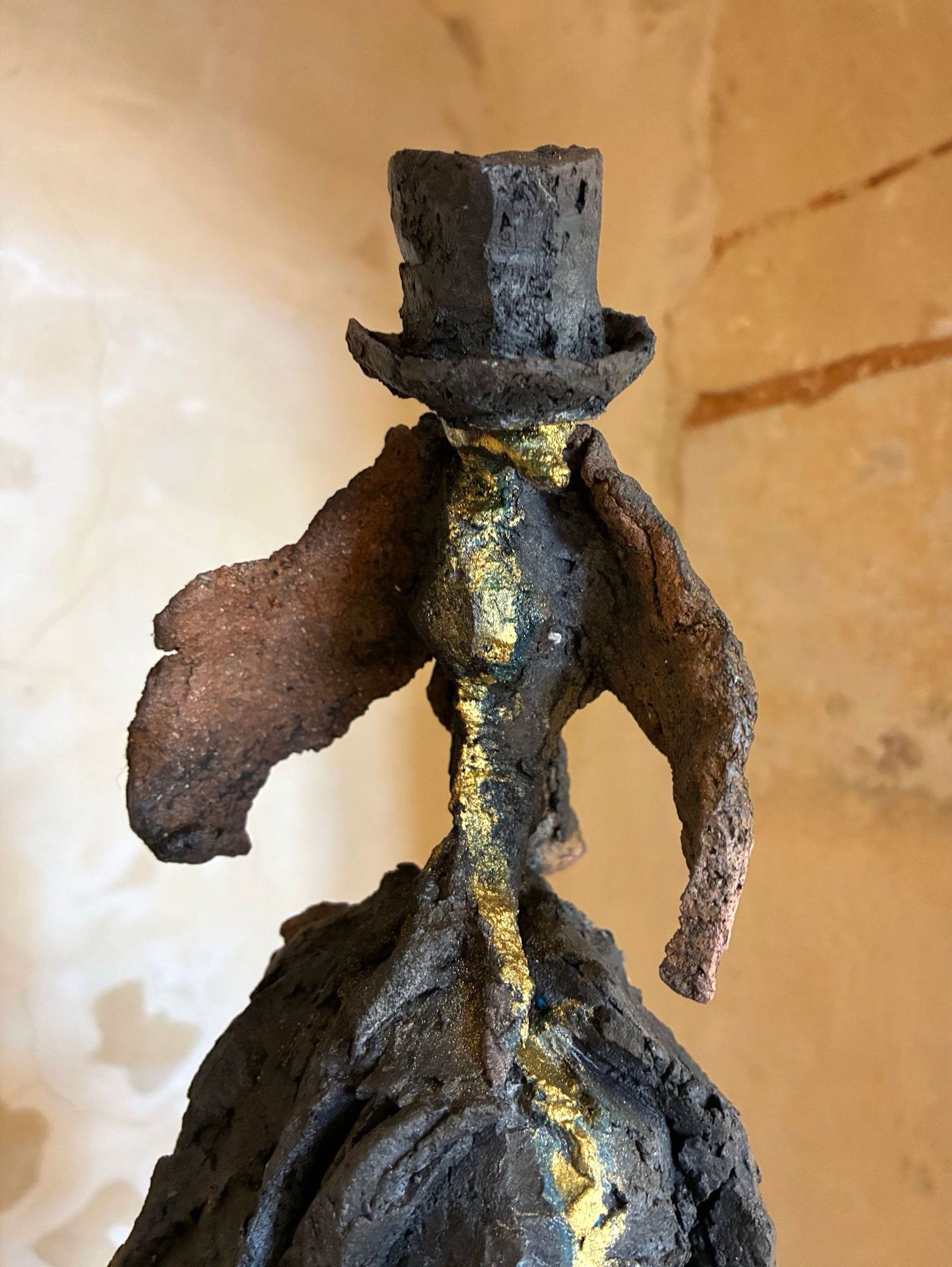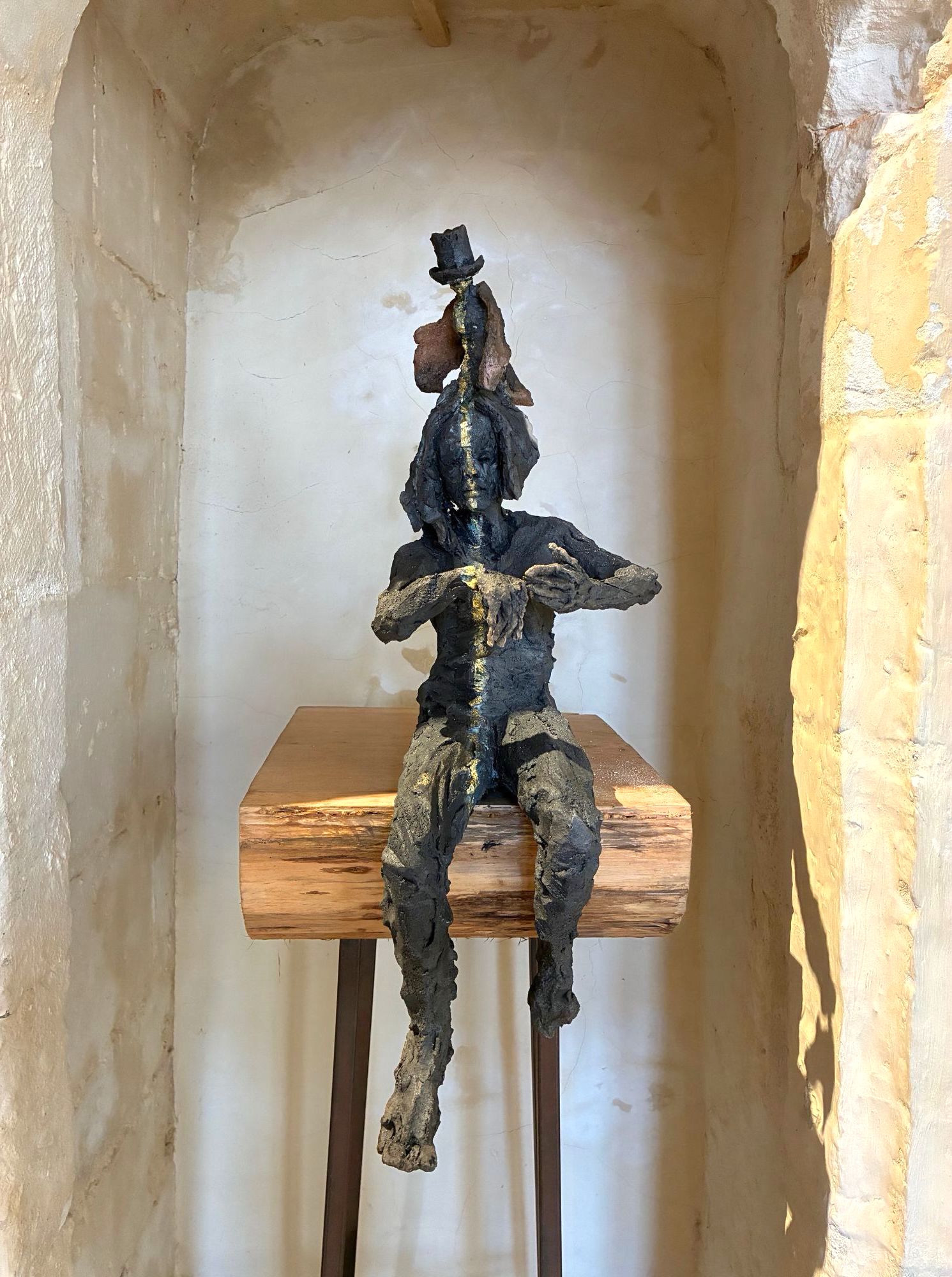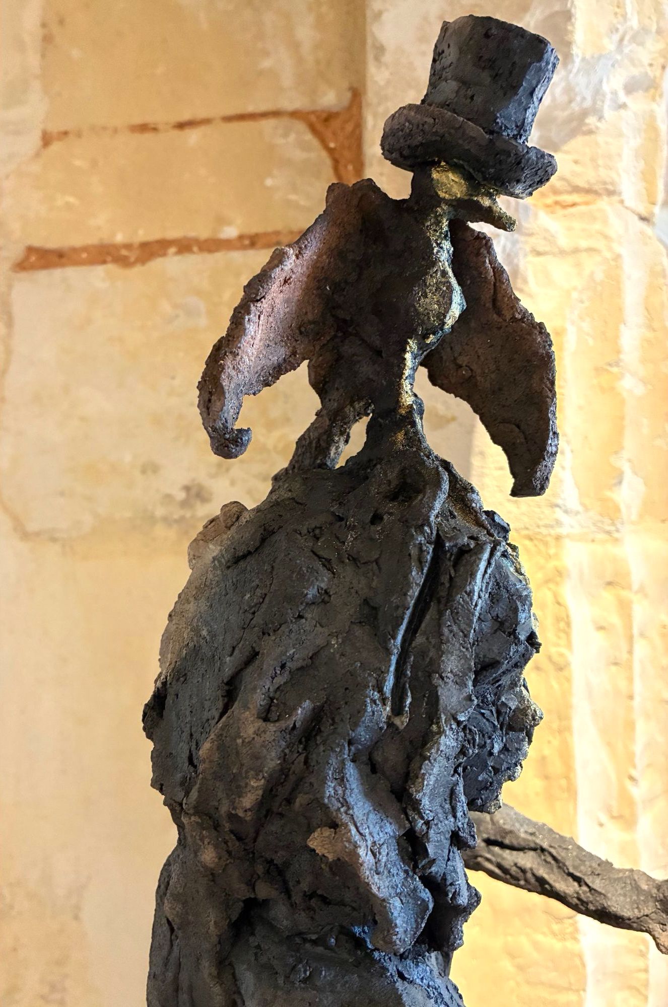 Under the hat is a smoke-fired stoneware sculpture by the contemporary French artist Cécile Raynal. This sculpture depicts a seated woman with bird wearing a hat on her head.