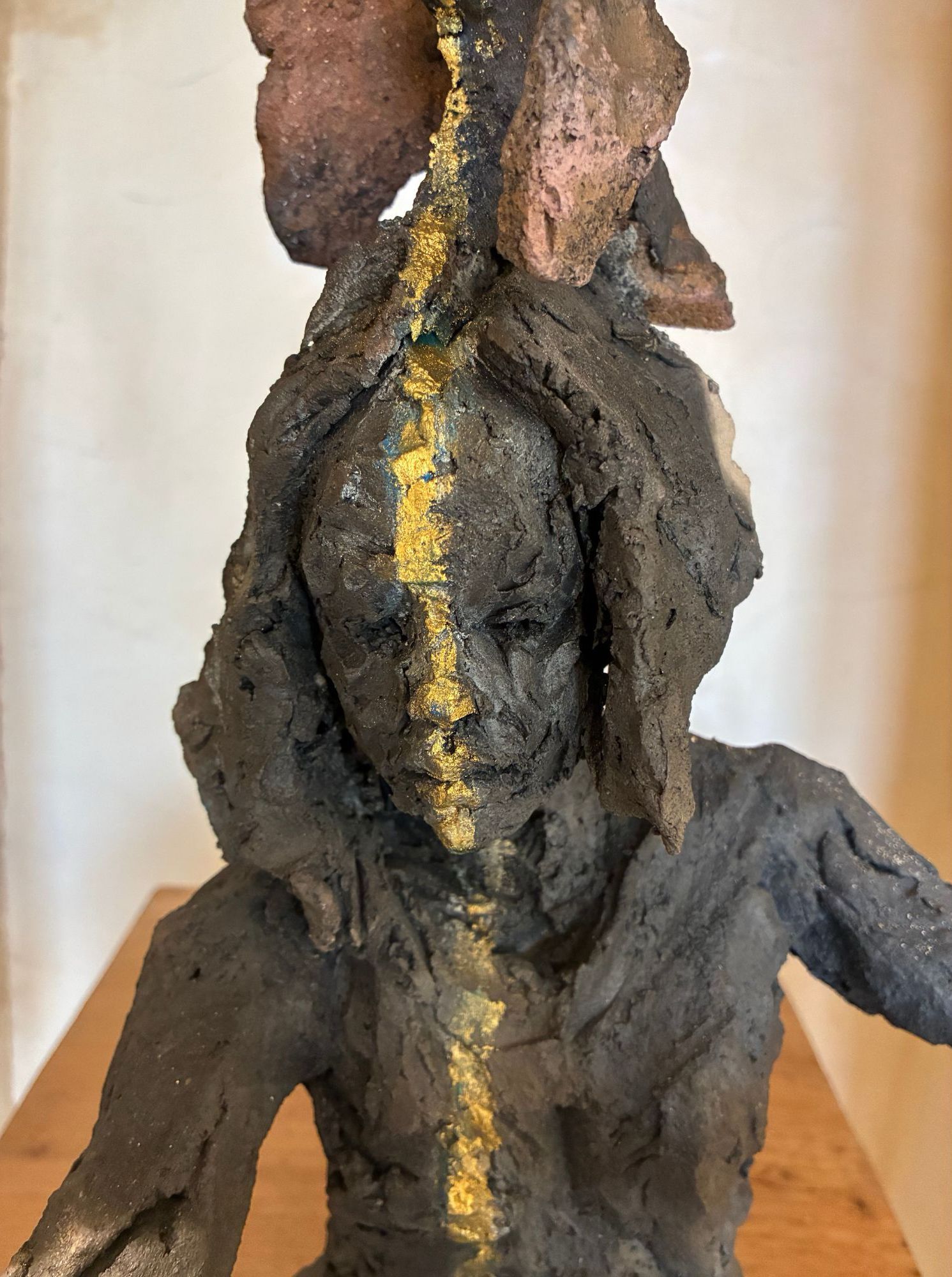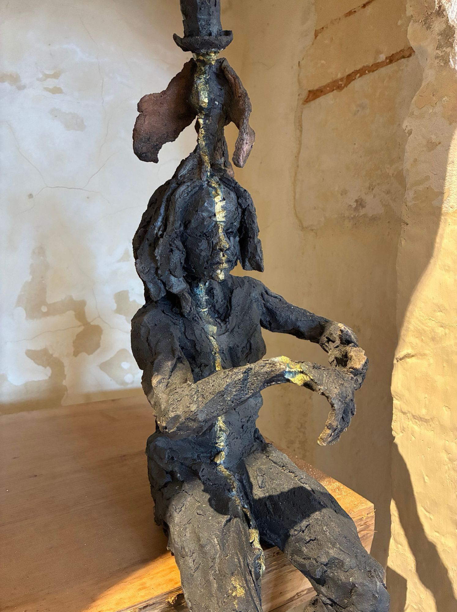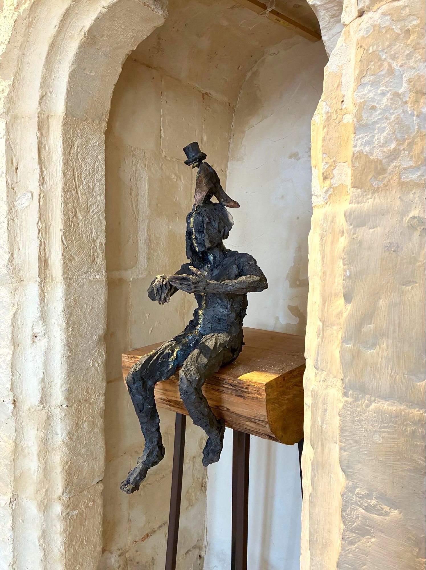 Under the hat is a smoke-fired stoneware sculpture by the contemporary French artist Cécile Raynal. This sculpture depicts a seated woman with bird wearing a hat on her head.