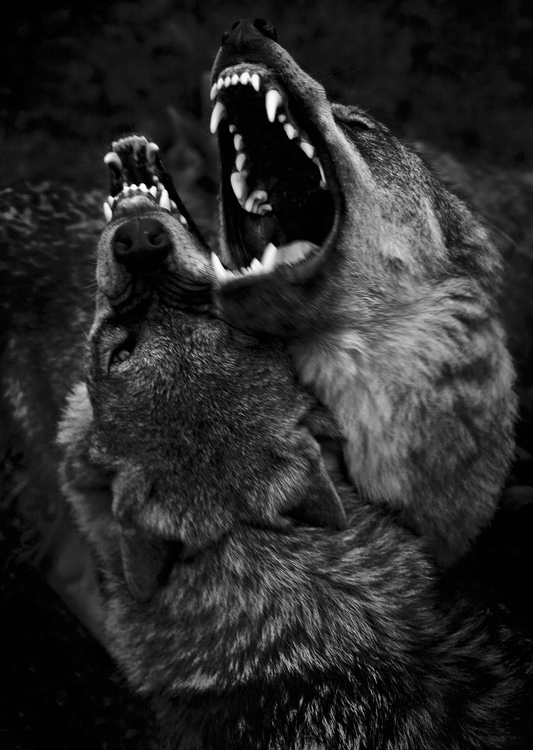 Untitled 16, Shadow Within, Norway/ USA is a work by contemporary photographer Christian Houge taken from the series Shadow Within. In this black and white photograph, a pair of wolves takes up nearly the whole composition, howling, displaying their sharp teeth. This shot seems to epitomize the whole strength of this animal, king of the forest.