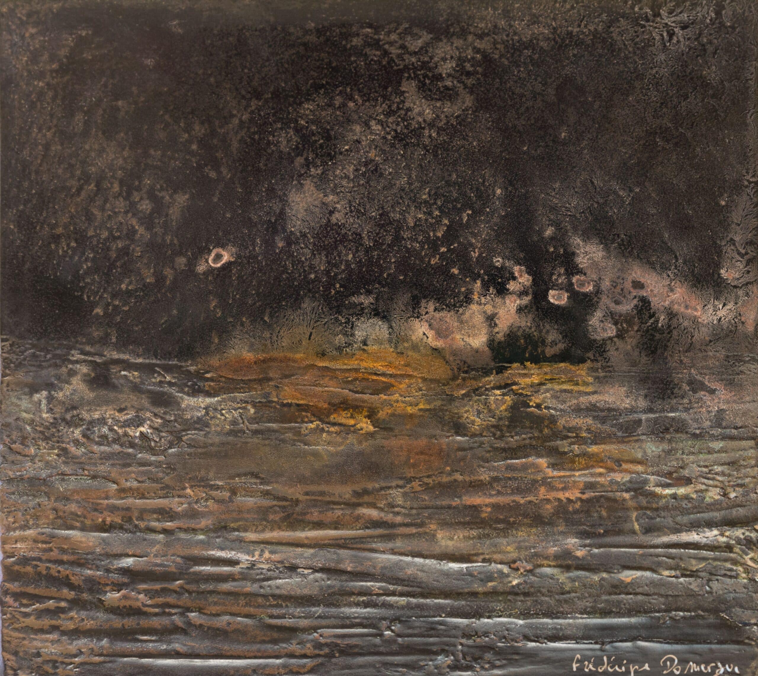 Frédérique Domergue uses thin sheets of metal applied on wood or aluminum panels. Through a patient process of polishing and oxidation the artist manages to confer a warmth and sensuality which tempts the observer to caress the oxidized surface of her paintings, now become all radiant and silky.