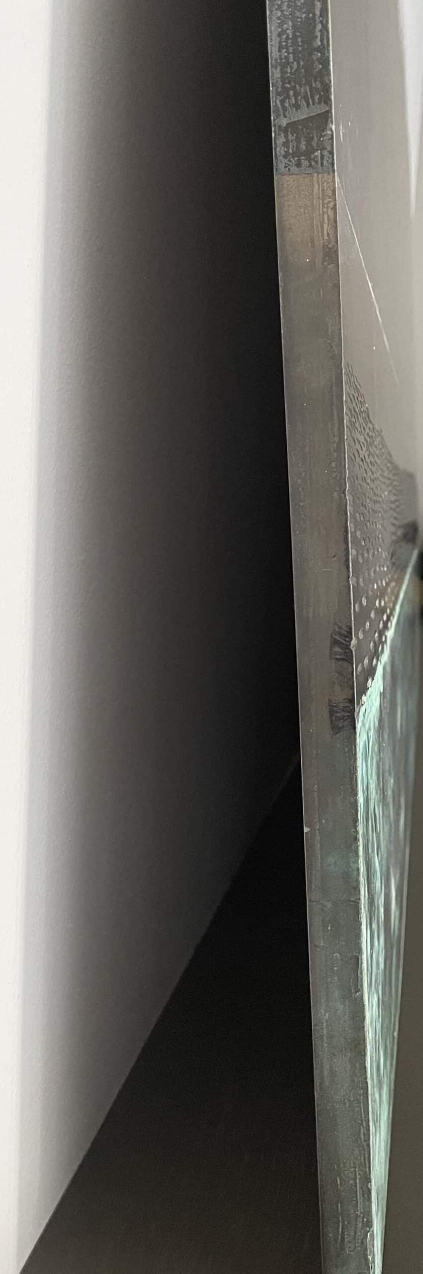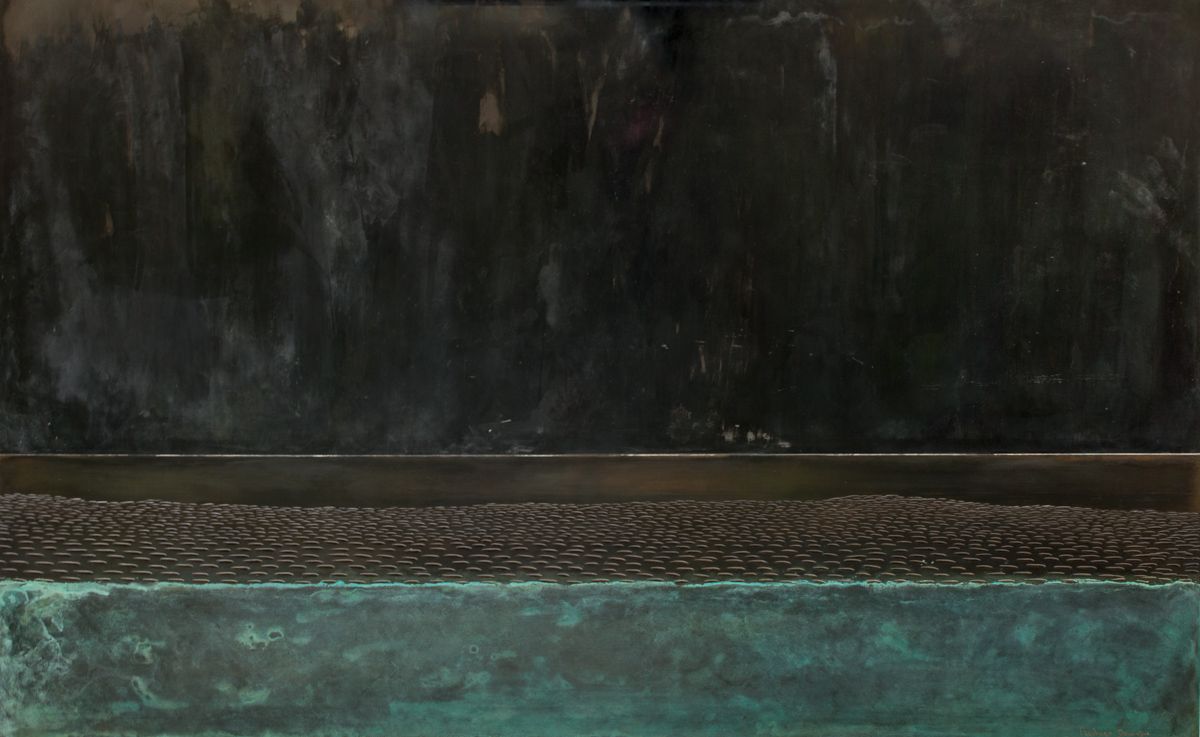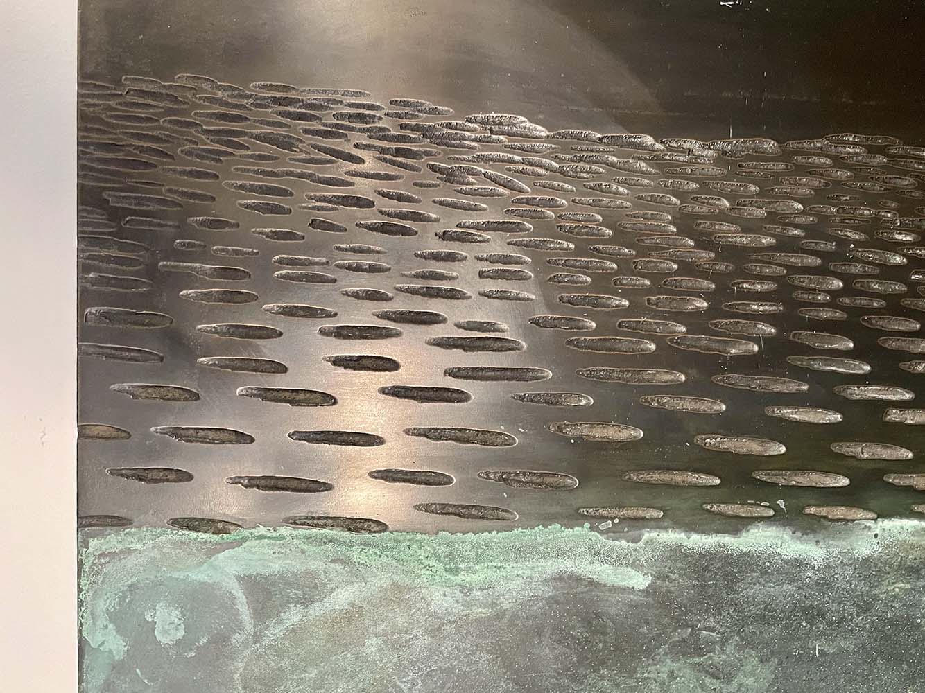 Description: Oxidized zinc and bronze leaf on wood panelling, patina fixed with beeswax polish