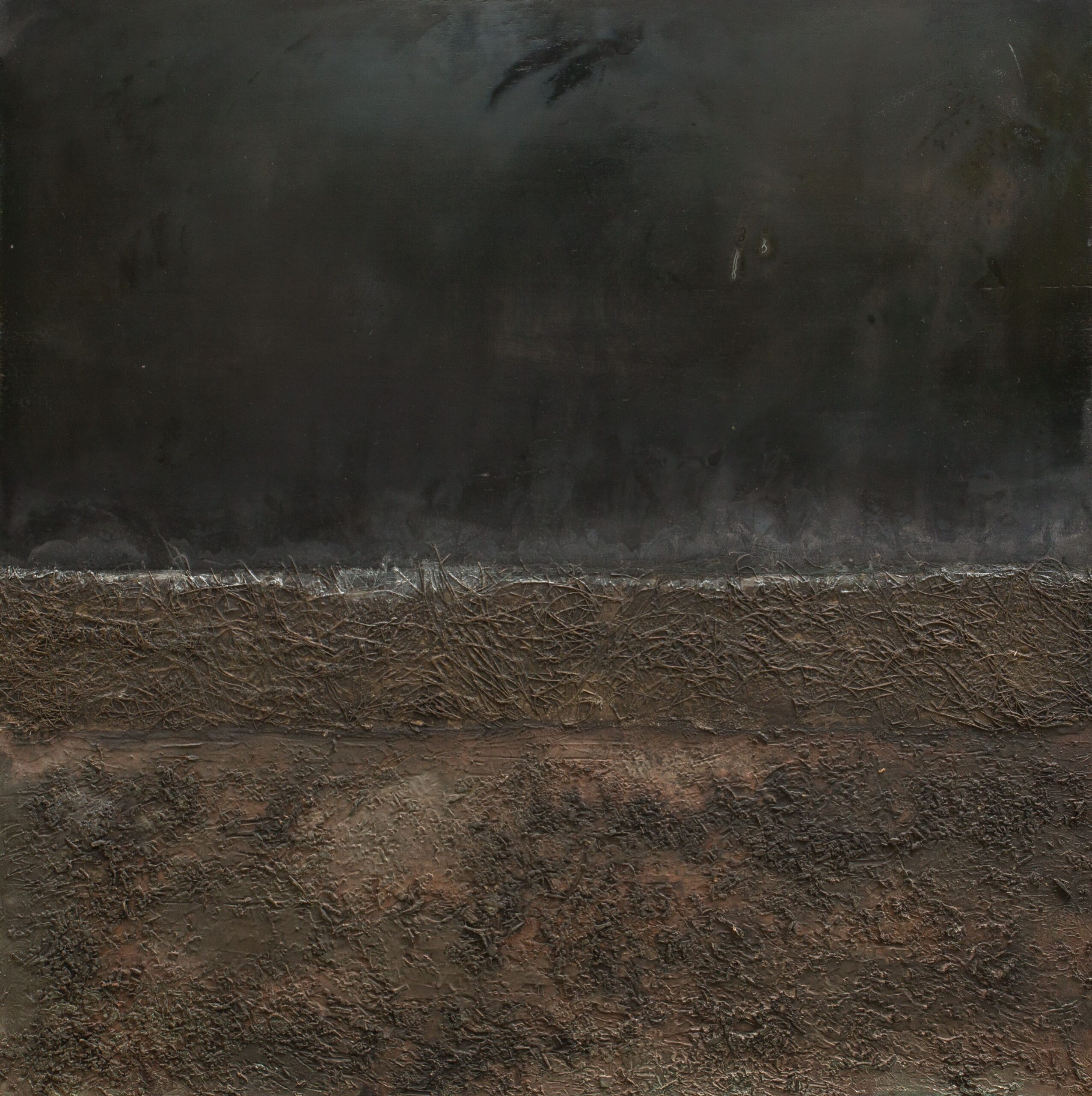 Frédérique Domergue finds her inspiration in nature and at the sea-side. Her paintings evoke landscapes, skies and seas that are sometimes calm and tranquil, sometimes turbulent, dark and ablaze. In this abstract an ochre earth meets an inky sky at the horizon in the center of the work. This line is often a feature of the artist’s work.