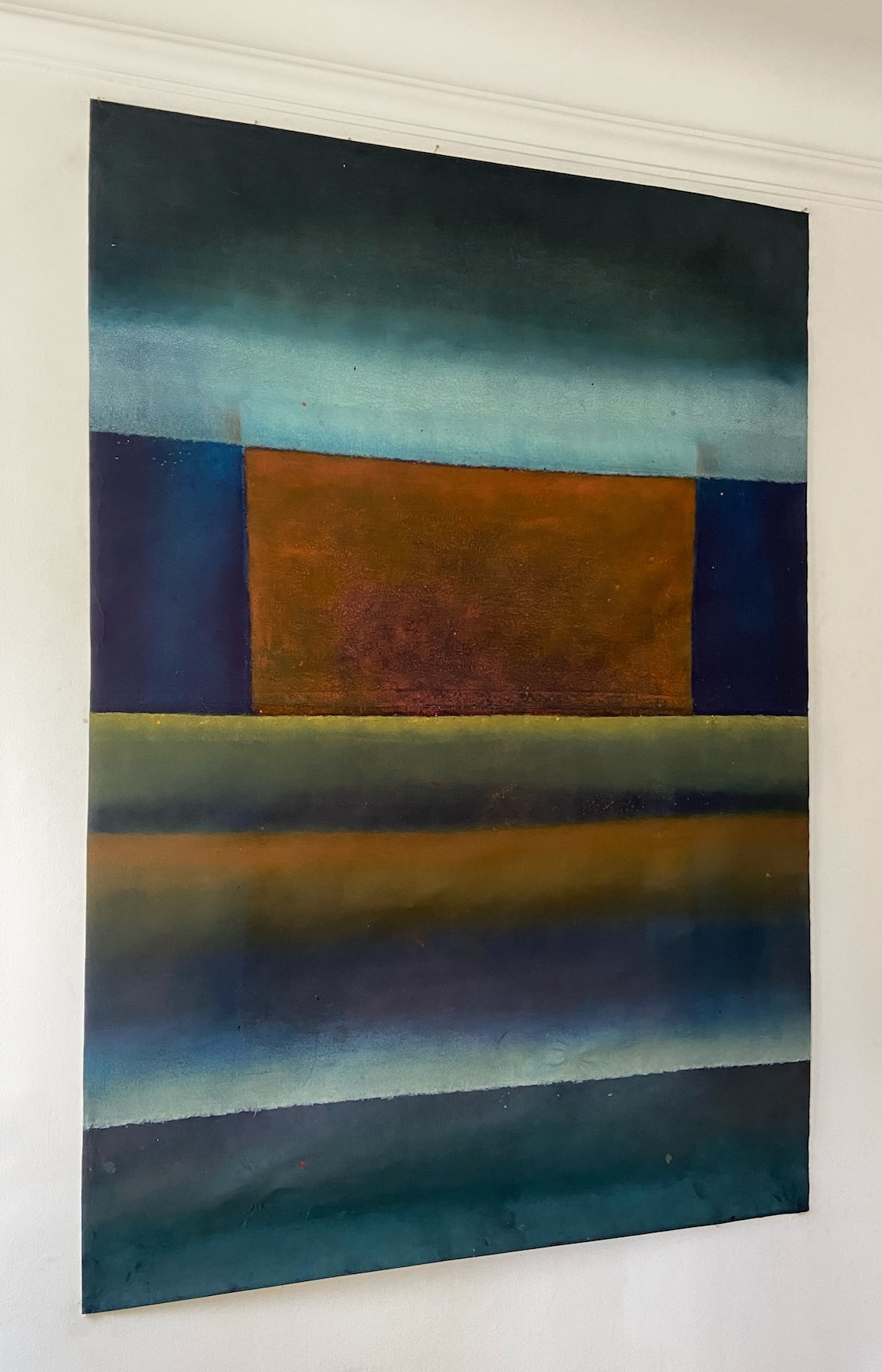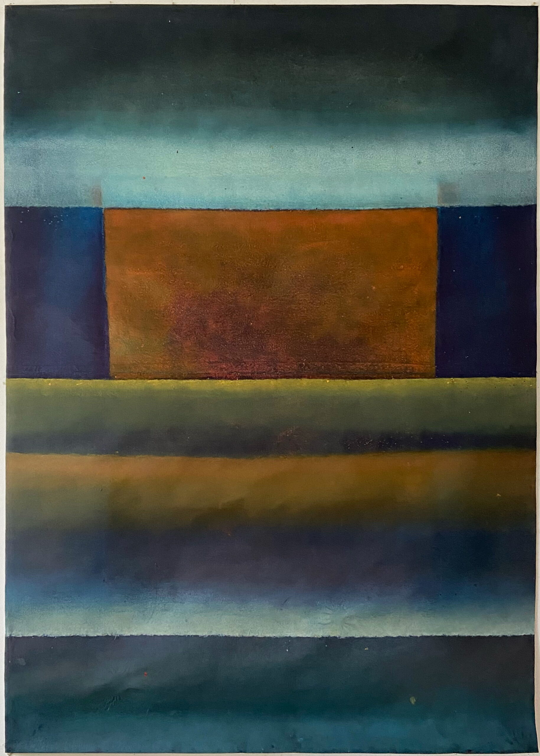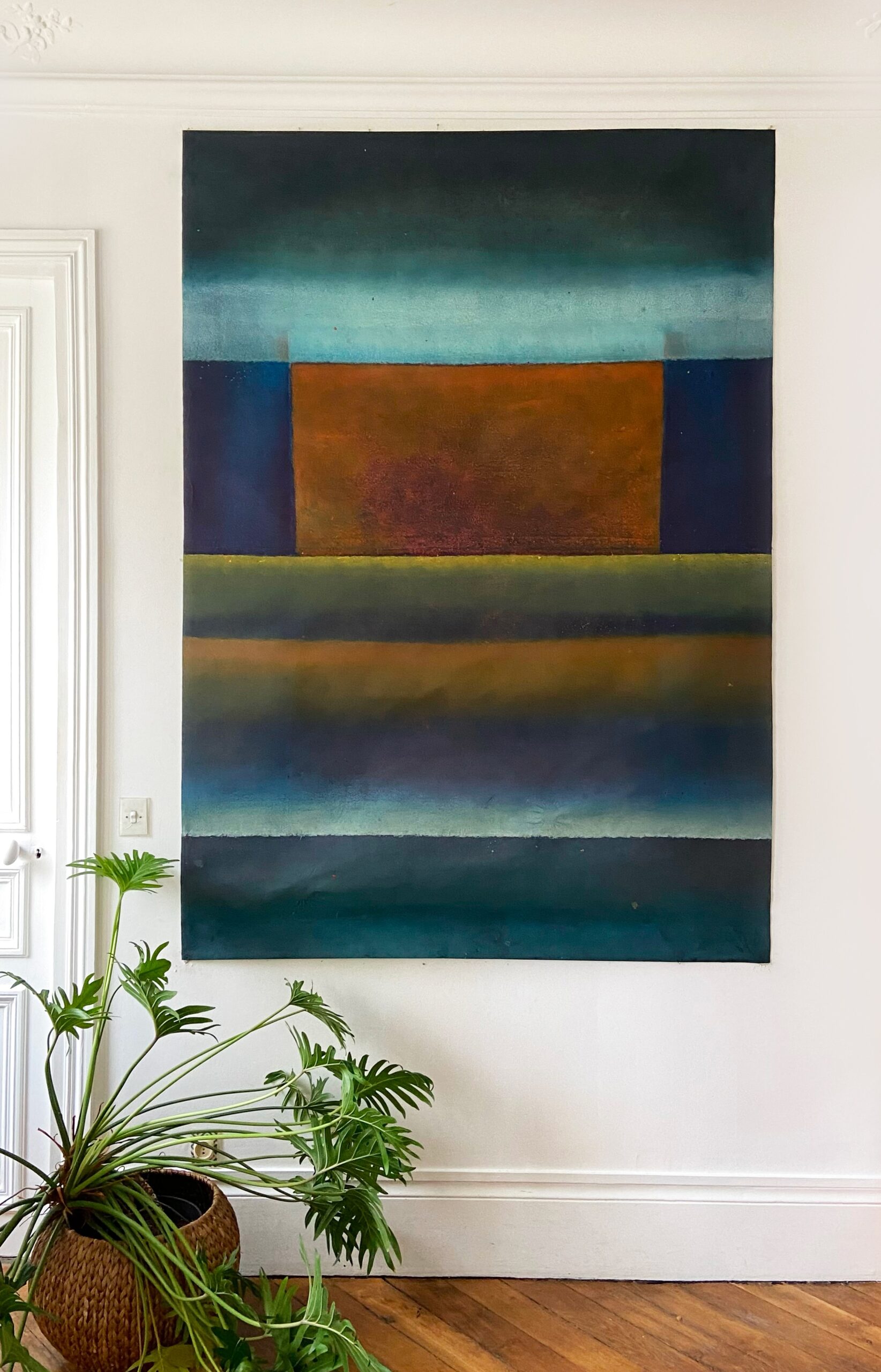 This canvas invites us to abandon any references we know to let us overwhelm by the spirituality they bear. This spirituality can seem to be in opposition with the violent gesture invested in the realization of the painting. The historian of art Emmanuel Dayde declares: ” In her work, Ferle creates new space, paints openness and doors to infinity towards a sort of spirituality out of the body itself. She opens a door leading to another space – a fourth dimension. Looking at her large color paintings, one feels close to the black hole, to physics and to the stars.” Between different varieties of colors, Ferle created a deep and harmonious rhythm which invites the viewer to meditate.