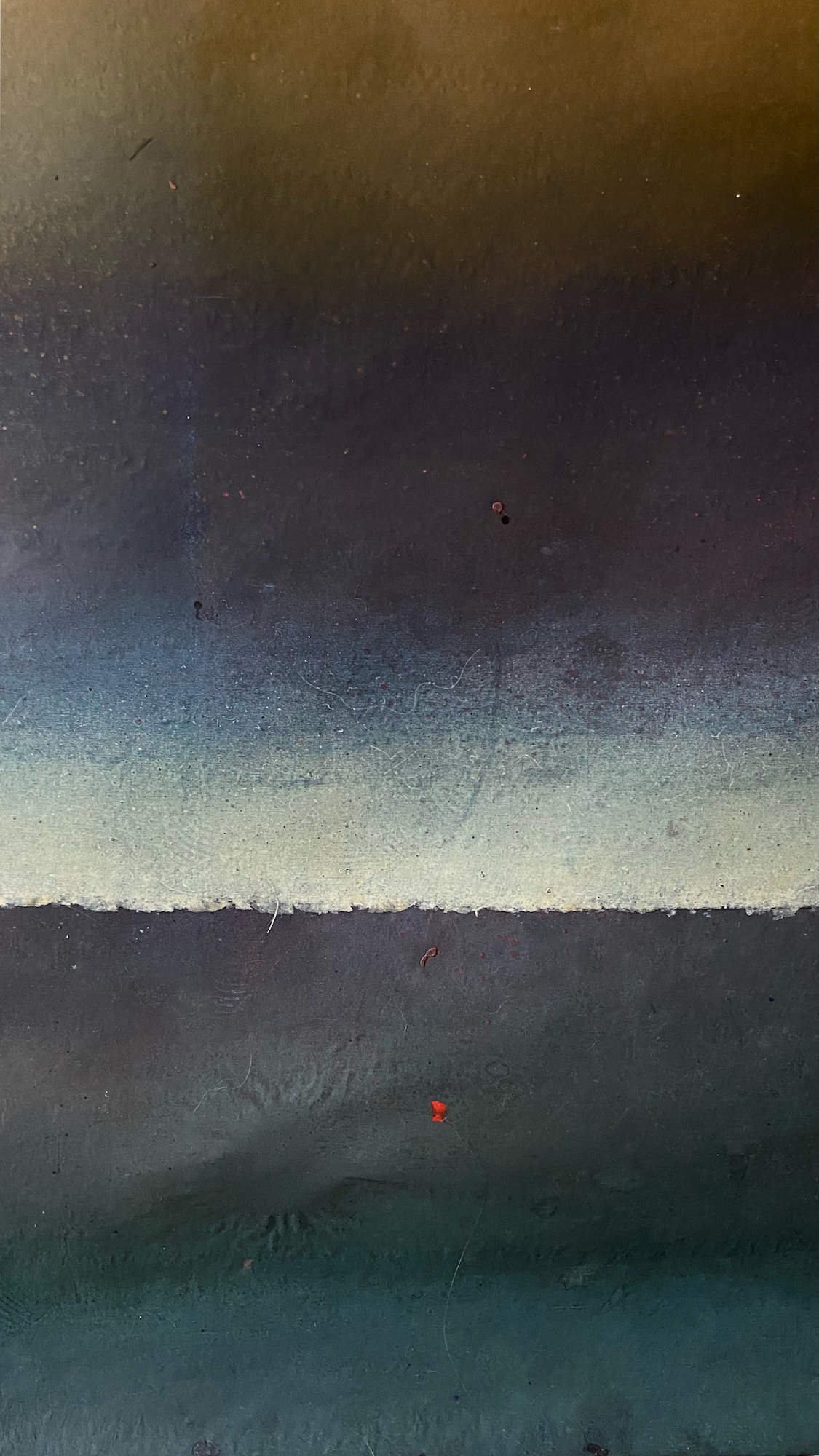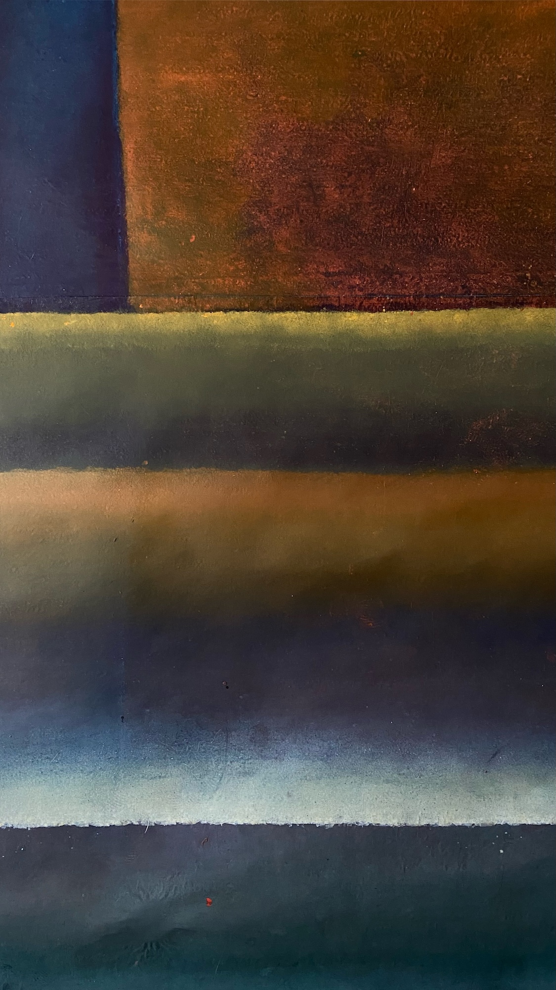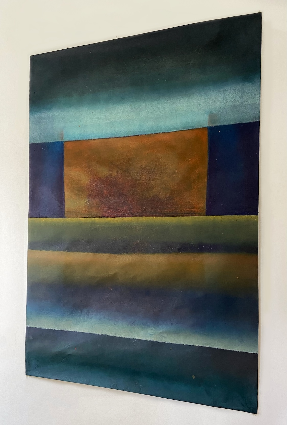This canvas invites us to abandon any references we know to let us overwhelm by the spirituality they bear. This spirituality can seem to be in opposition with the violent gesture invested in the realization of the painting. The historian of art Emmanuel Dayde declares: ” In her work, Ferle creates new space, paints openness and doors to infinity towards a sort of spirituality out of the body itself. She opens a door leading to another space – a fourth dimension. Looking at her large color paintings, one feels close to the black hole, to physics and to the stars.” Between different varieties of colors, Ferle created a deep and harmonious rhythm which invites the viewer to meditate.