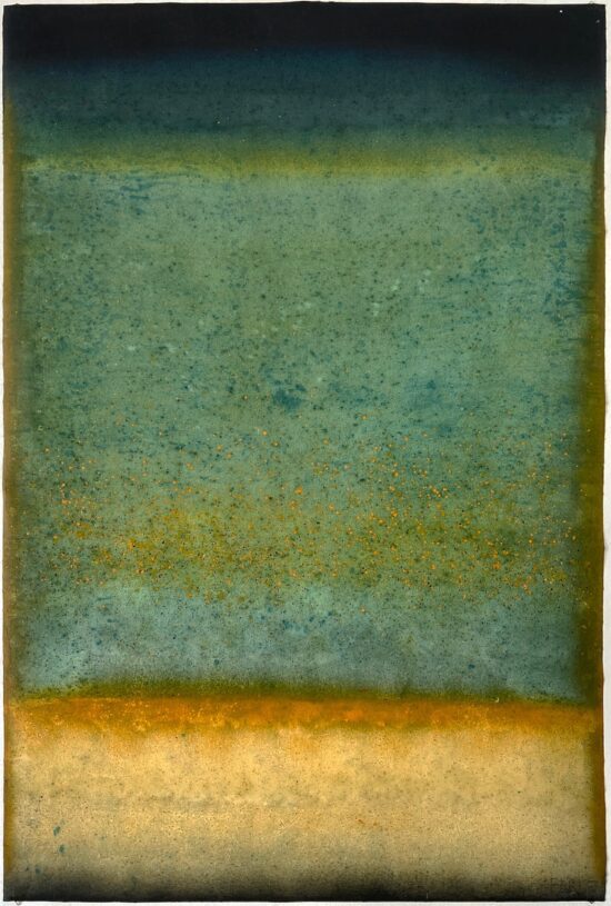 In standing in front of this abstract painting, influenced by Minimalism and Abstract Expressionism, a viewer would look to establish similarities before simply letting themselves carry on the journey, guided by the energy that appears on the canvas. Horizontal lines of different colours stand out on this richly toned blue and green background.