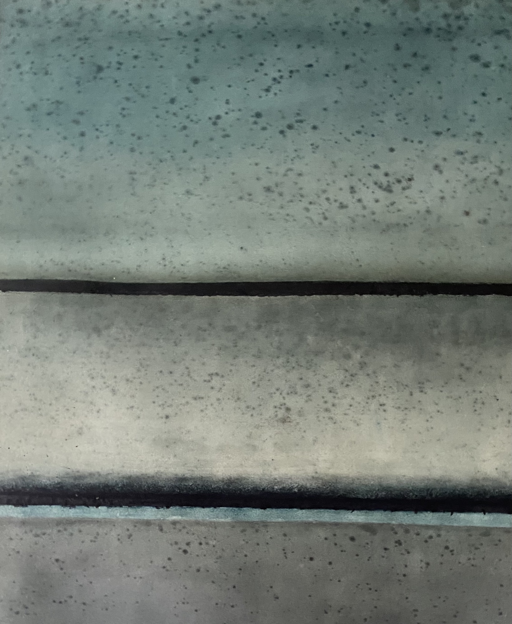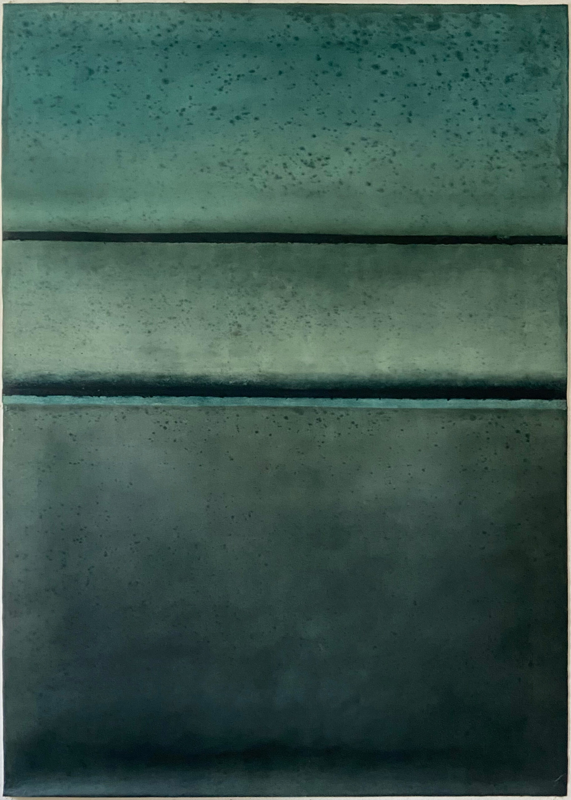 Untitled LXXXVI is an oil painting on canvas by the contemporary French artist Ferle. The work presents different hues of turquoise, separated by black lines which structure the composition.