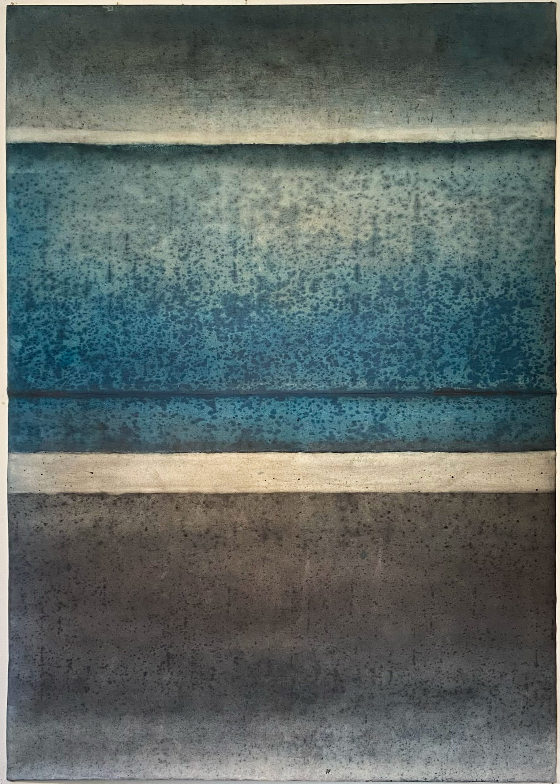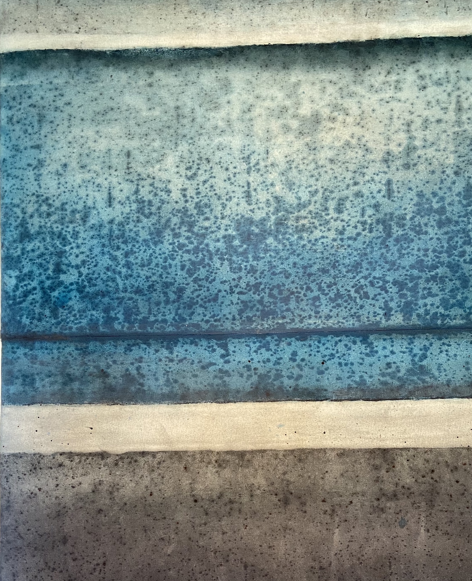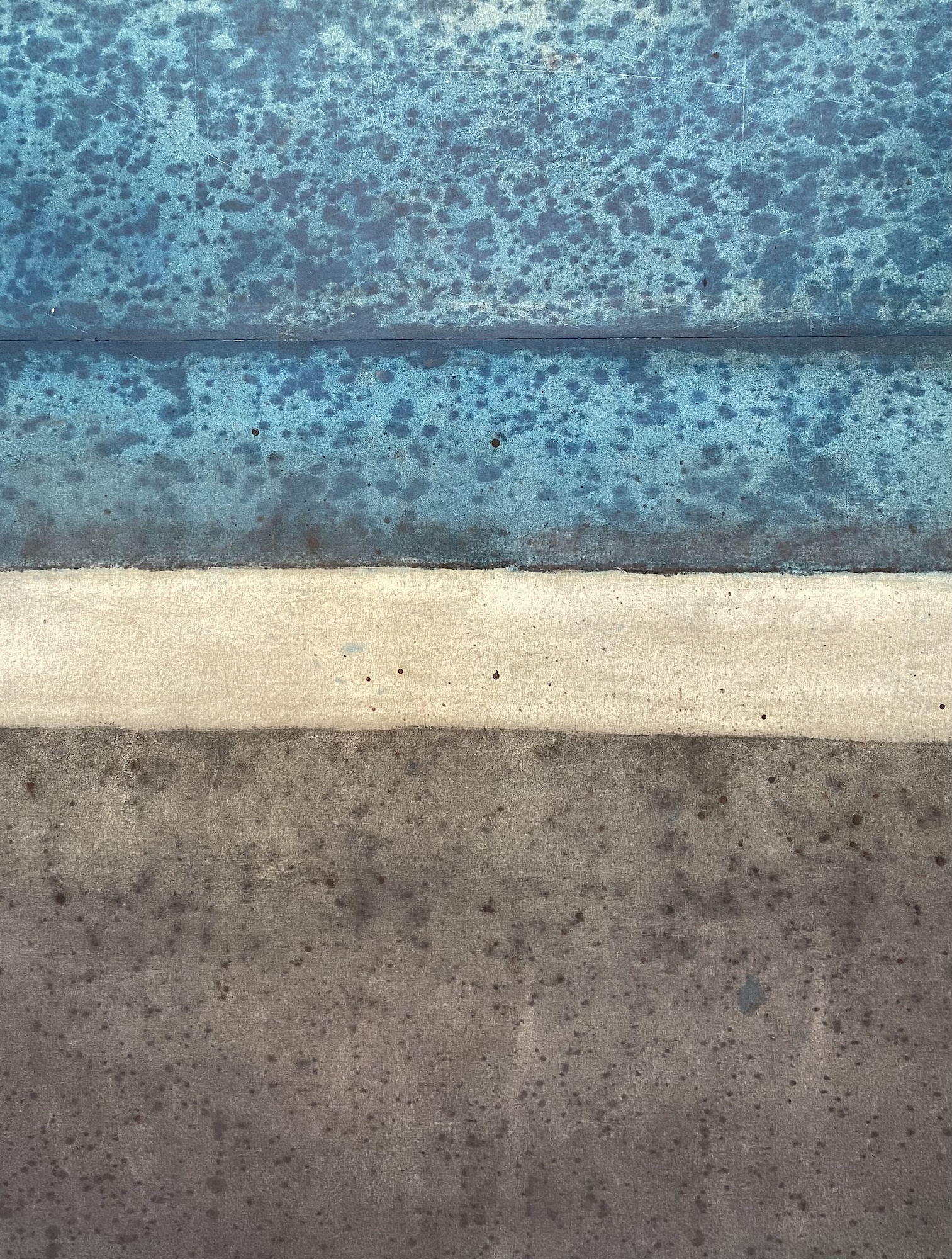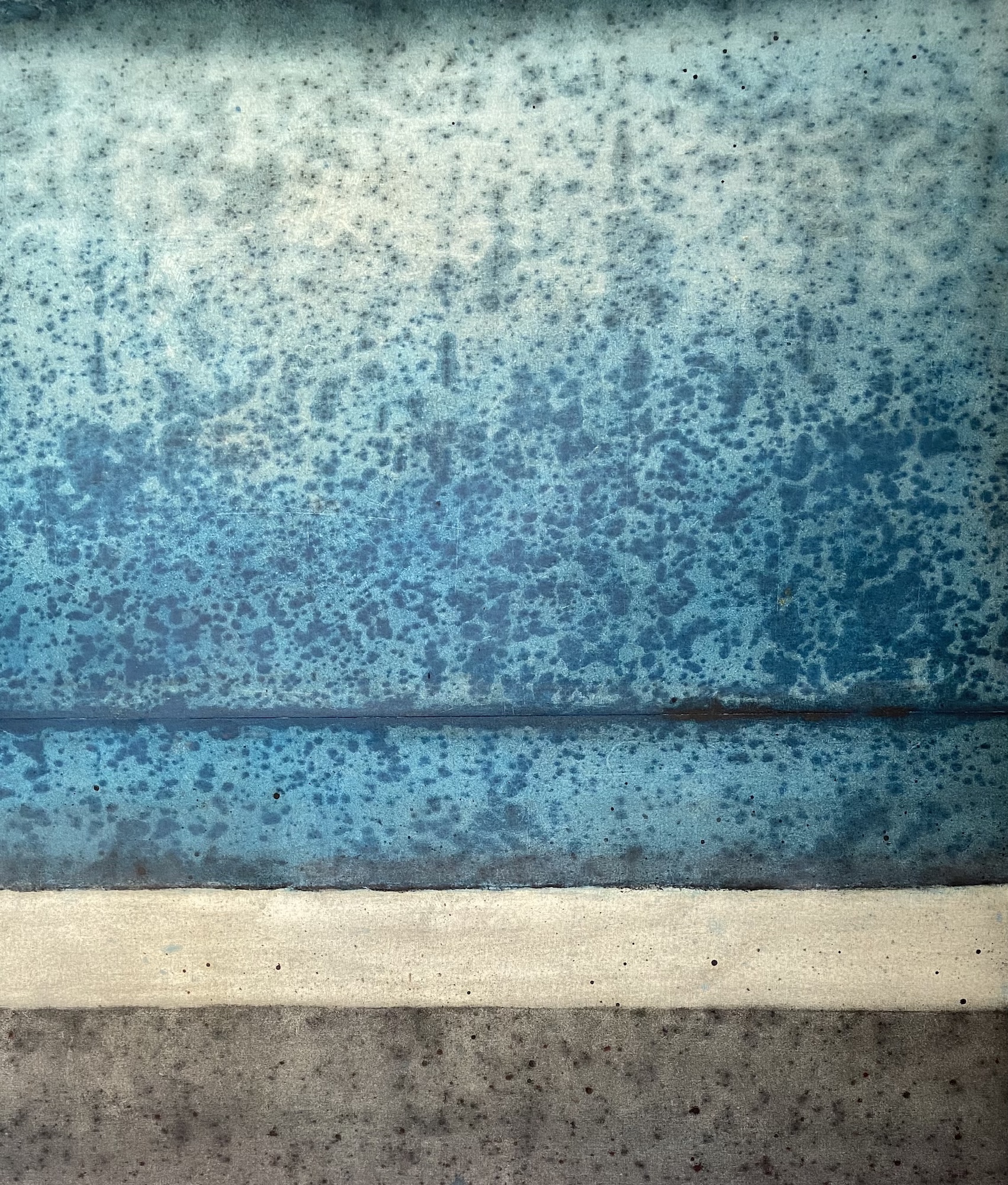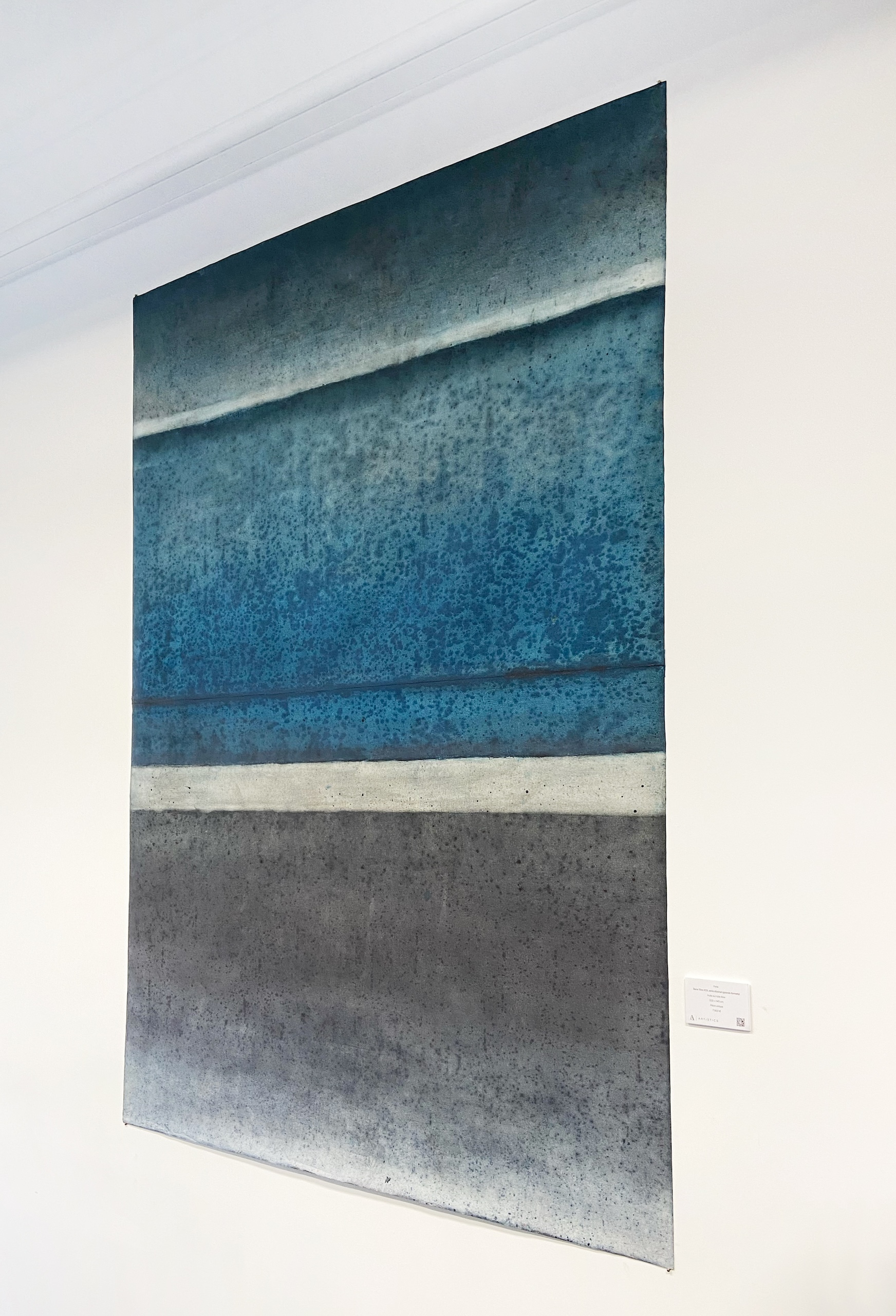 Untitled XCII is an oil painting on canvas by the contemporary French artist Ferle. The work is centred around dominant colours blue and grey, which structure the composition and give it visual balance.
