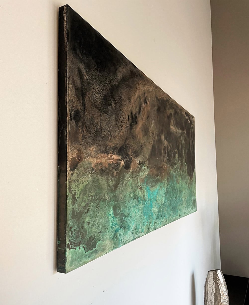 | Description | Oxidized zinc and bronze leaves on aluminum panel, patina fixed with beeswax polish |