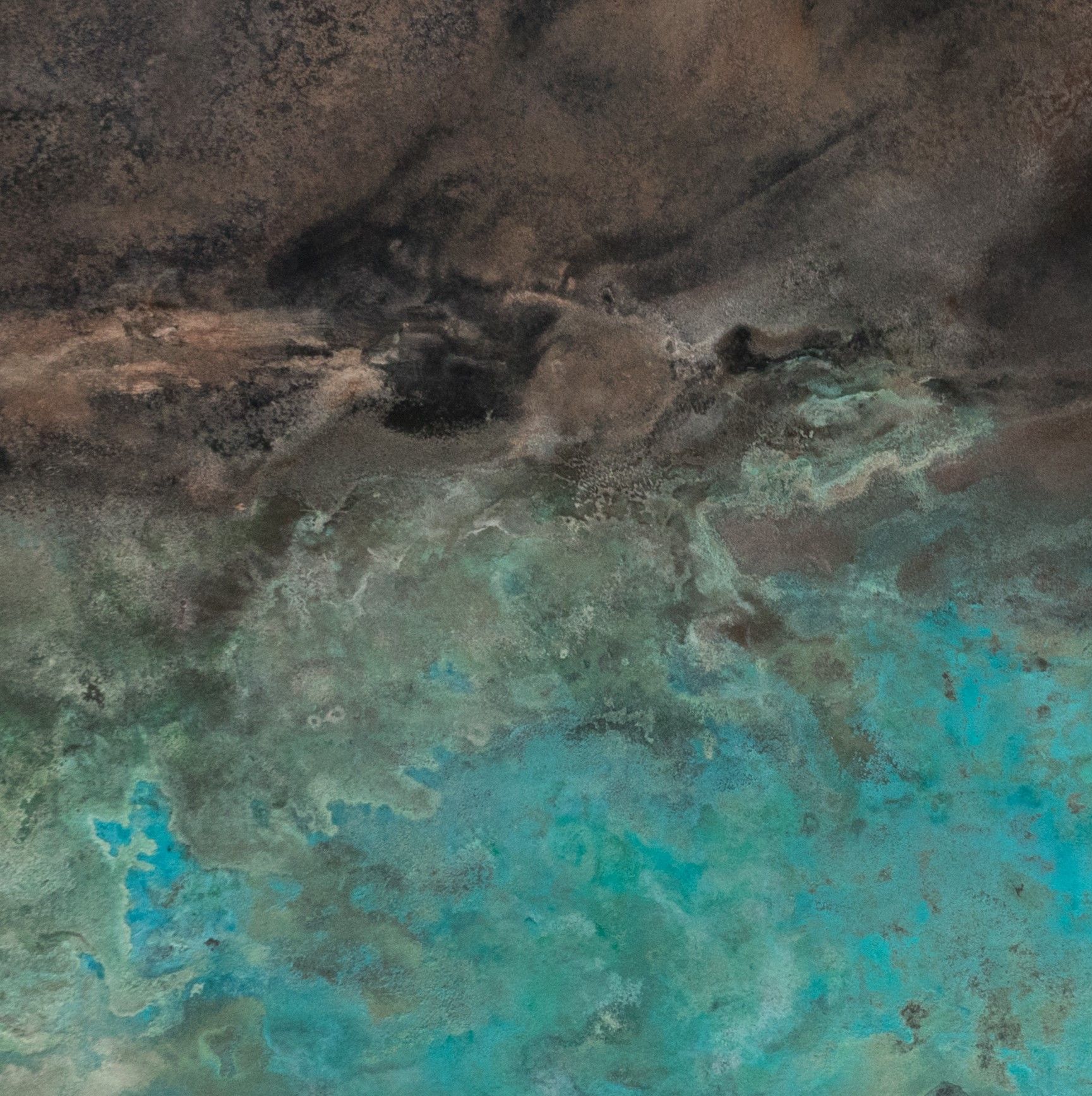 Frédérique Domergue’s work is abstract, she gets her inspiration from natural landscapes, particularly the seaside. Here, the blue of the sea flows alongside the darker colours of upper part of the artwork. In this dynamic piece the different elements seem to meld together in a turmoil.