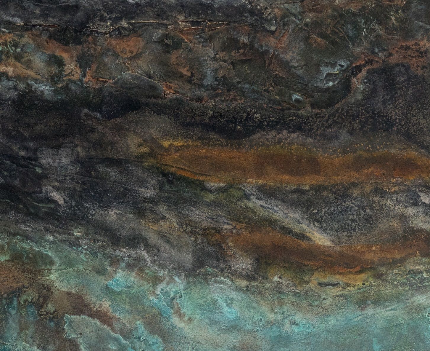 Untitled XIX-XXV is an abstract painting by French contemporary artist Frédérique Domergue. This piece is very representative of the artist’s pictorial technique. The variety of the sombre colours and of the light ones, as well as the impression of relief created by the oxidation of the metal makes for a truly original composition.