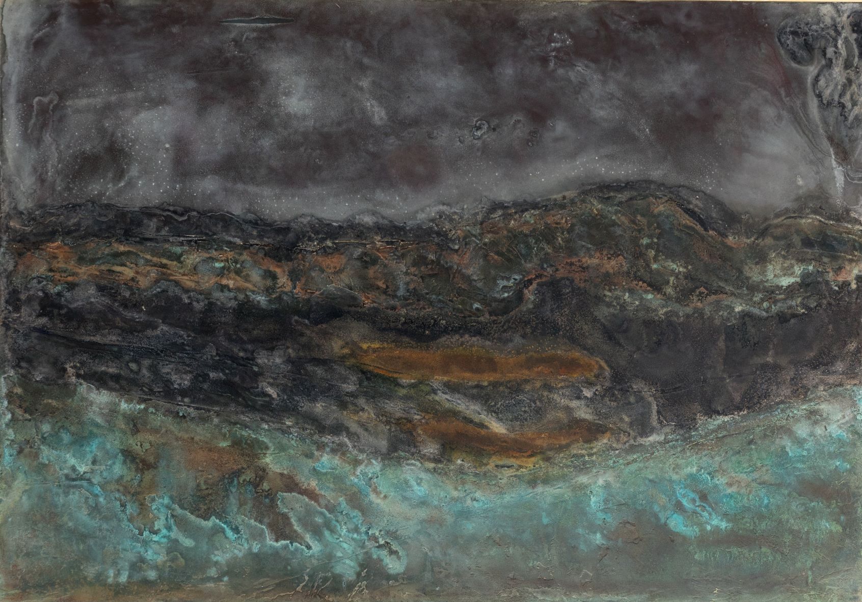 Frédérique Domergue uses thin sheets of metal applied on wood or aluminum panels. Through a patient process of polishing and oxidation the artist manages to confer a warmth and sensuality which tempts the observer to caress the oxidized surface of her paintings, now become all radiant and silky.