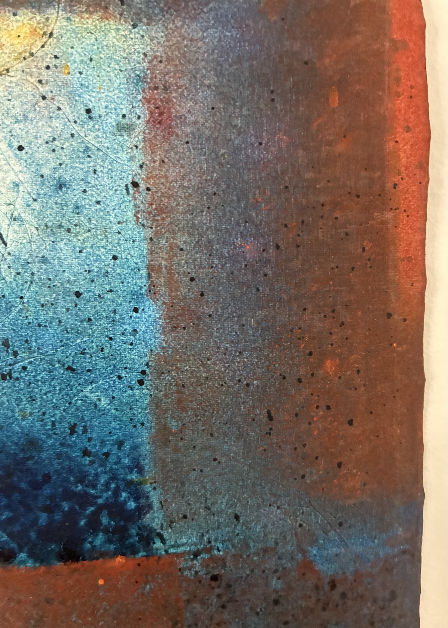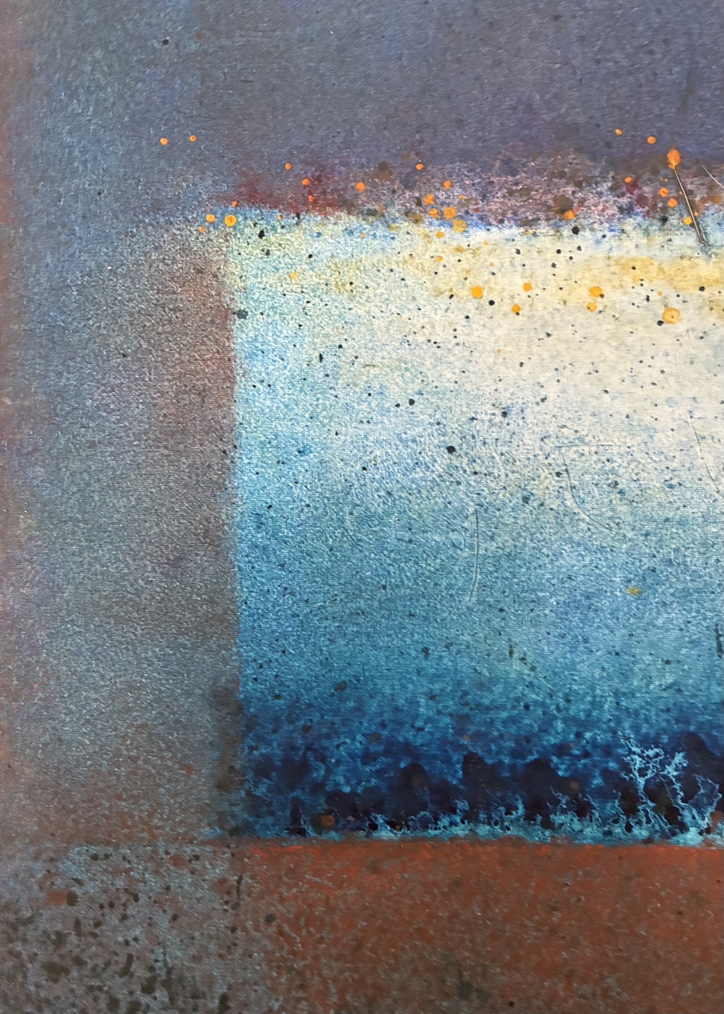 This canvas invites us to abandon any references we know to let us overwhelm by the spirituality they bear. This spirituality can seem to be in opposition with the violent gesture invested in the realization of the painting. The historian of art Emmanuel Dayde declares: “In her work, Ferle creates new space, paints openness and doors to infinity towards a sort of spirituality out of the body itself. She opens a door leading to another space – a fourth dimension. Looking at her large colour paintings, one feels close to the black hole, to physics and to the stars.” Between different varieties of colours, Ferle created a deep and harmonious rhythm which invites the viewer to meditate.