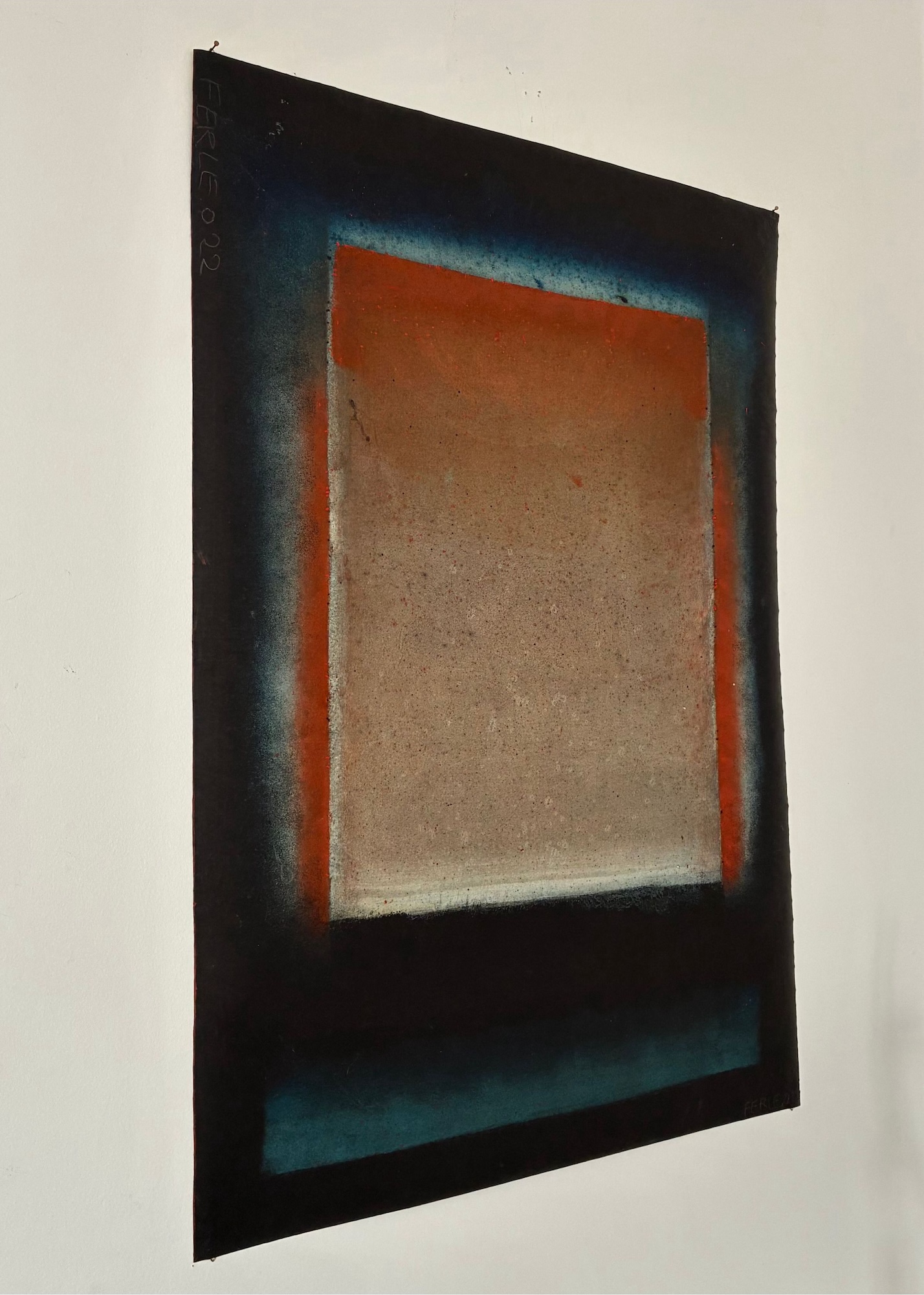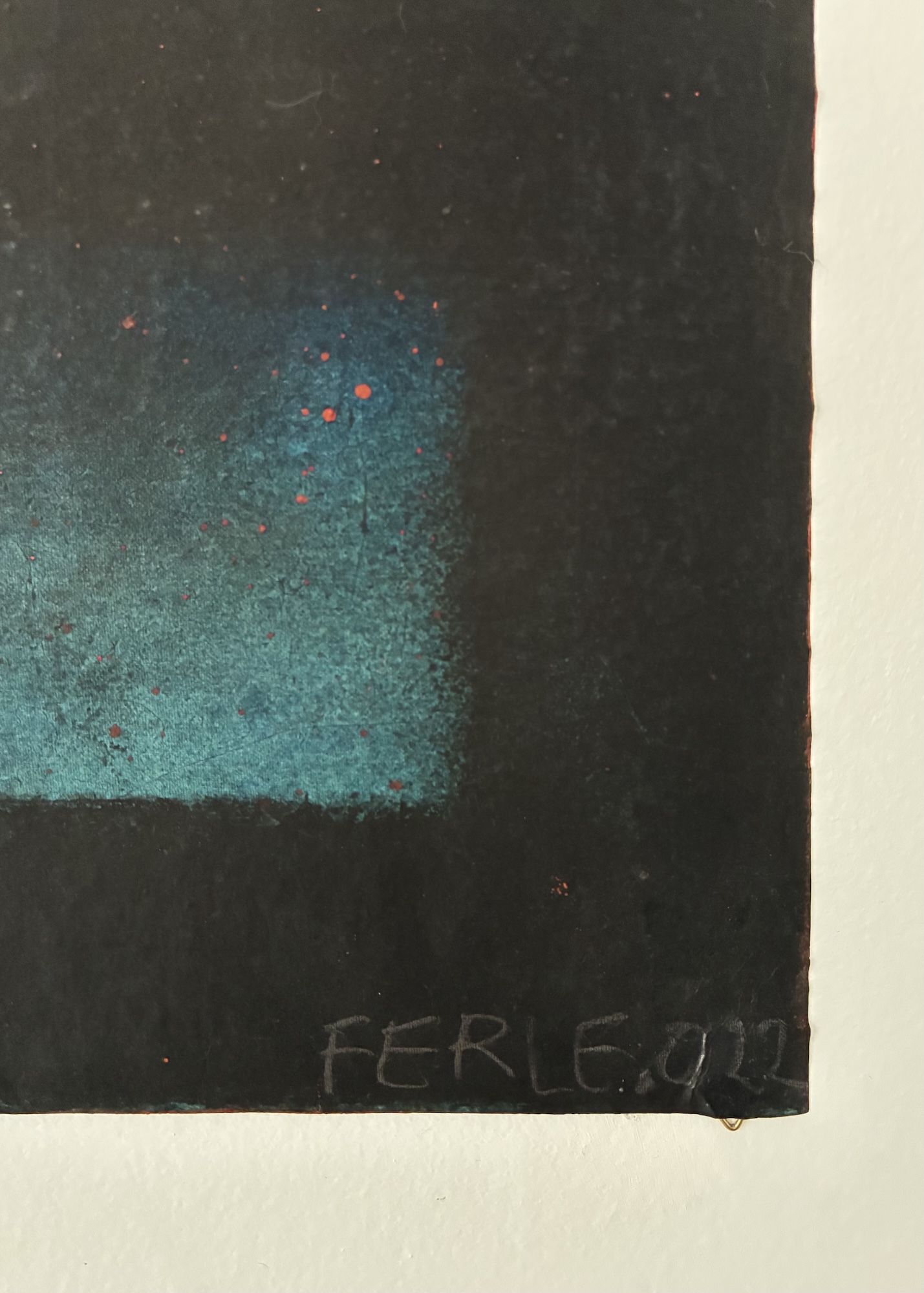 This canvas invites us to abandon any references we know to let us overwhelm by the spirituality they bear. This spirituality can seem to be in opposition with the violent gesture invested in the realization of the painting. The historian of art Emmanuel Dayde declares: “In her work, Ferle creates new space, paints openness and doors to infinity towards a sort of spirituality out of the body itself. She opens a door leading to another space – a fourth dimension. Looking at her large colour paintings, one feels close to the black hole, to physics and to the stars.” Between different varieties of colours, Ferle created a deep and harmonious rhythm which invites the viewer to meditate.