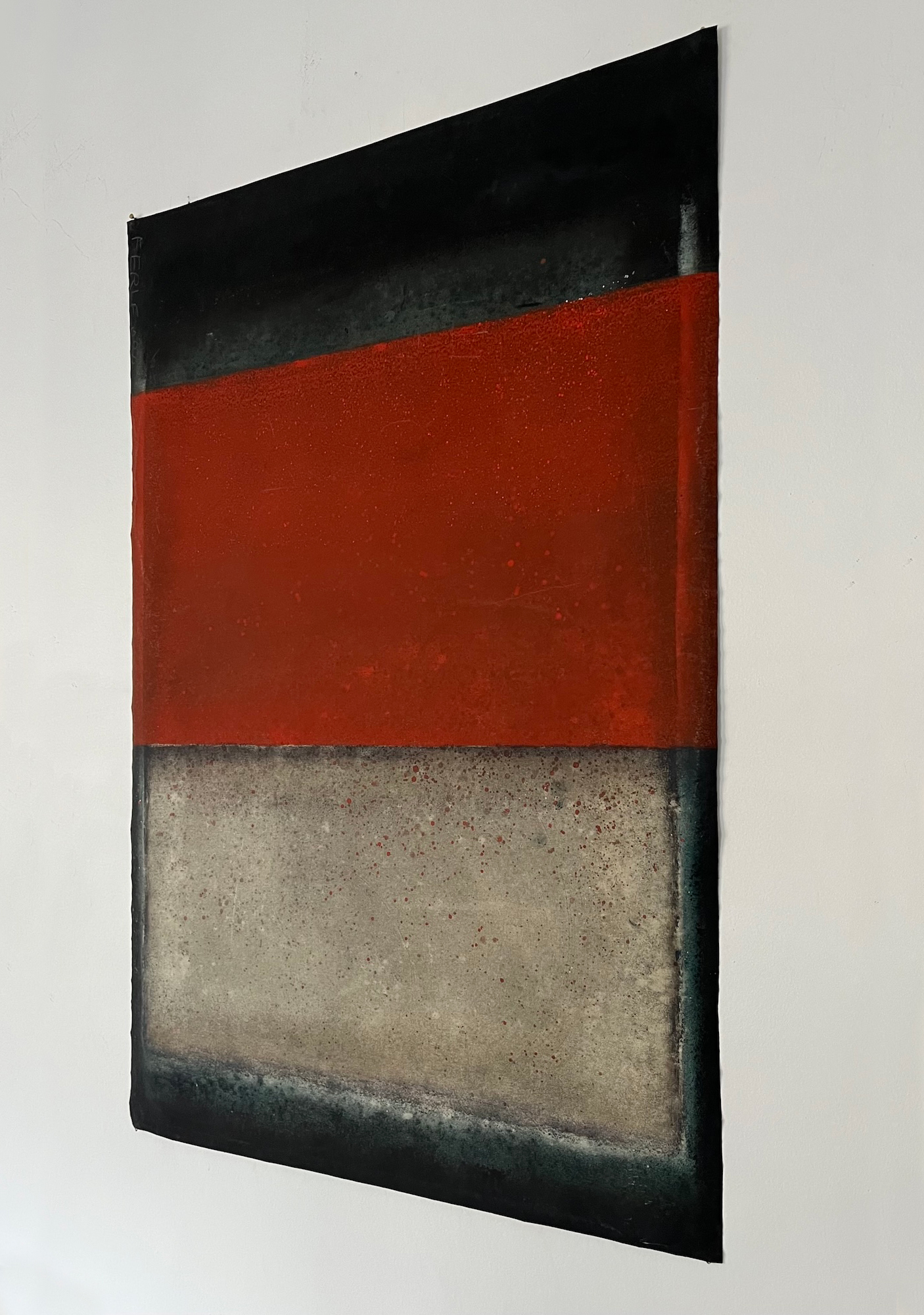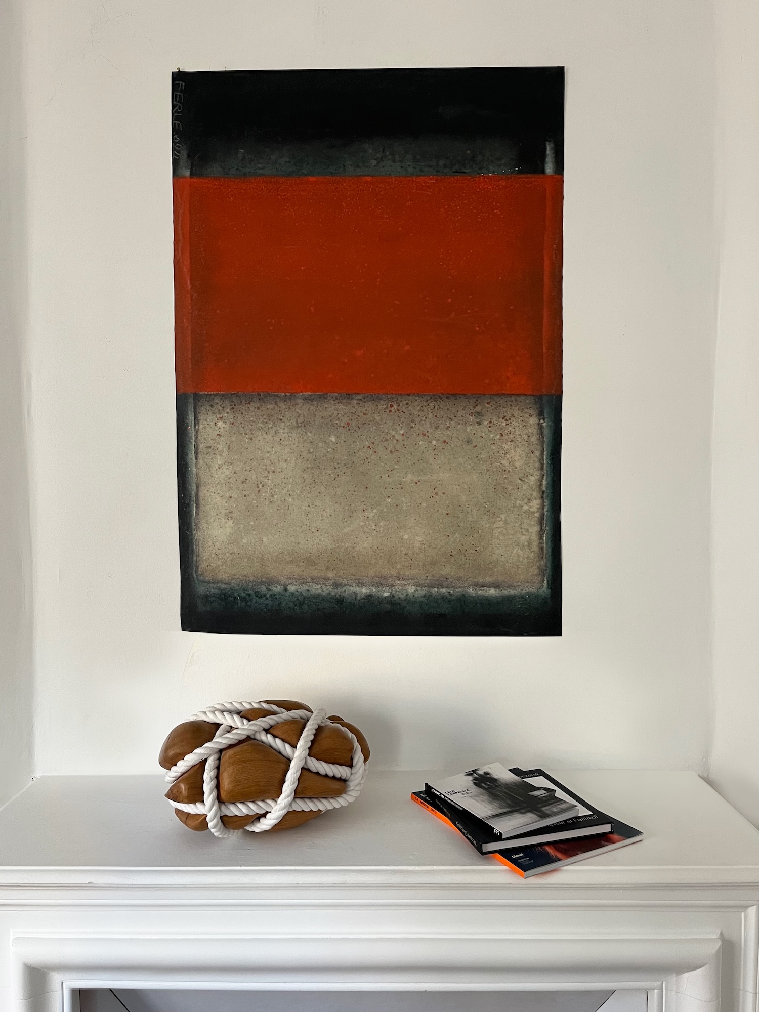 This canvas invites us to abandon any references we know to let us overwhelm by the spirituality they bear. This spirituality can seem to be in opposition with the violent gesture invested in the realization of the painting. The historian of art Emmanuel Dayde declares: “In her work, Ferle creates new space, paints openness and doors to infinity towards a sort of spirituality out of the body itself. She opens a door leading to another space – a fourth dimension. Looking at her large colour paintings, one feels close to the black hole, to physics and to the stars.” Between different varieties of colours, Ferle created a deep and harmonious rhythm which invites the viewer to meditate.