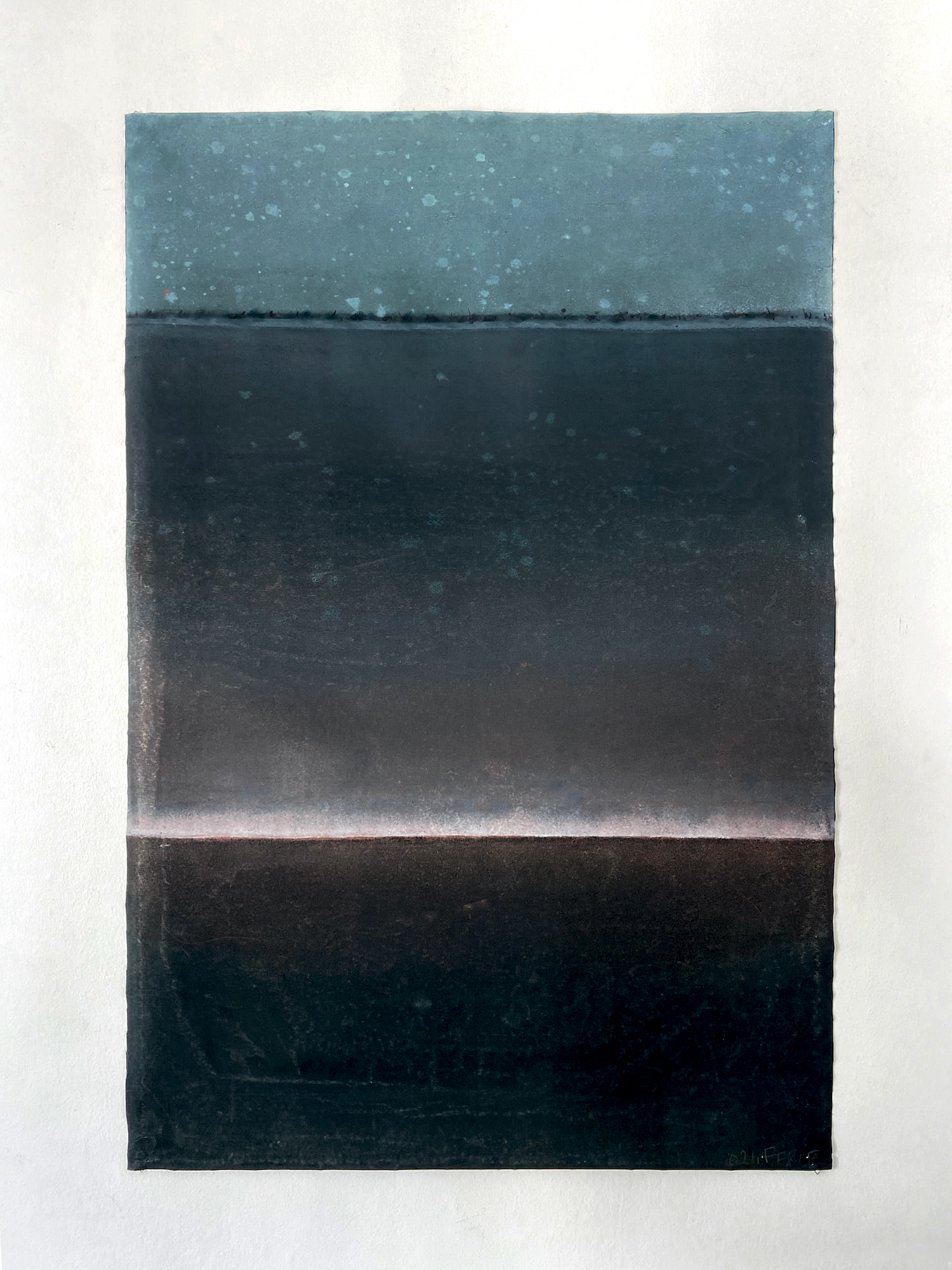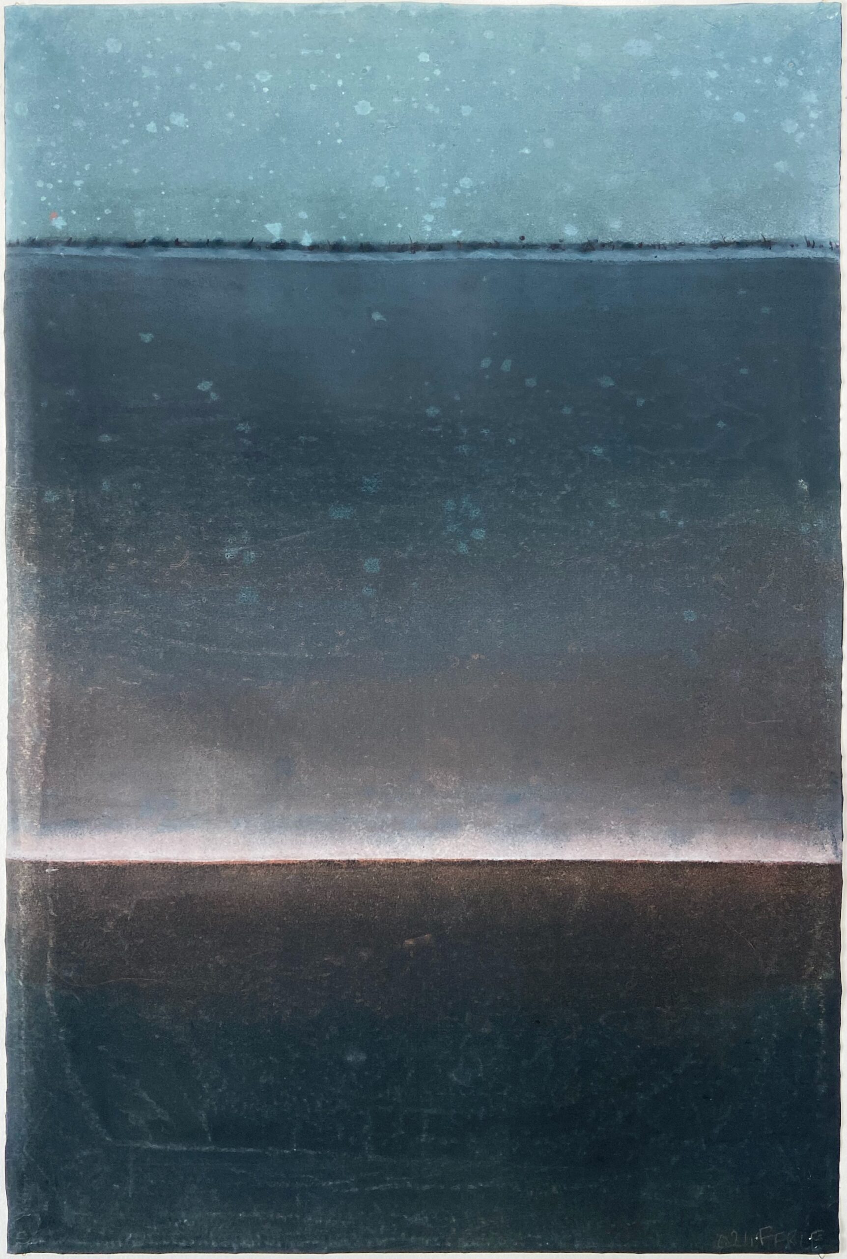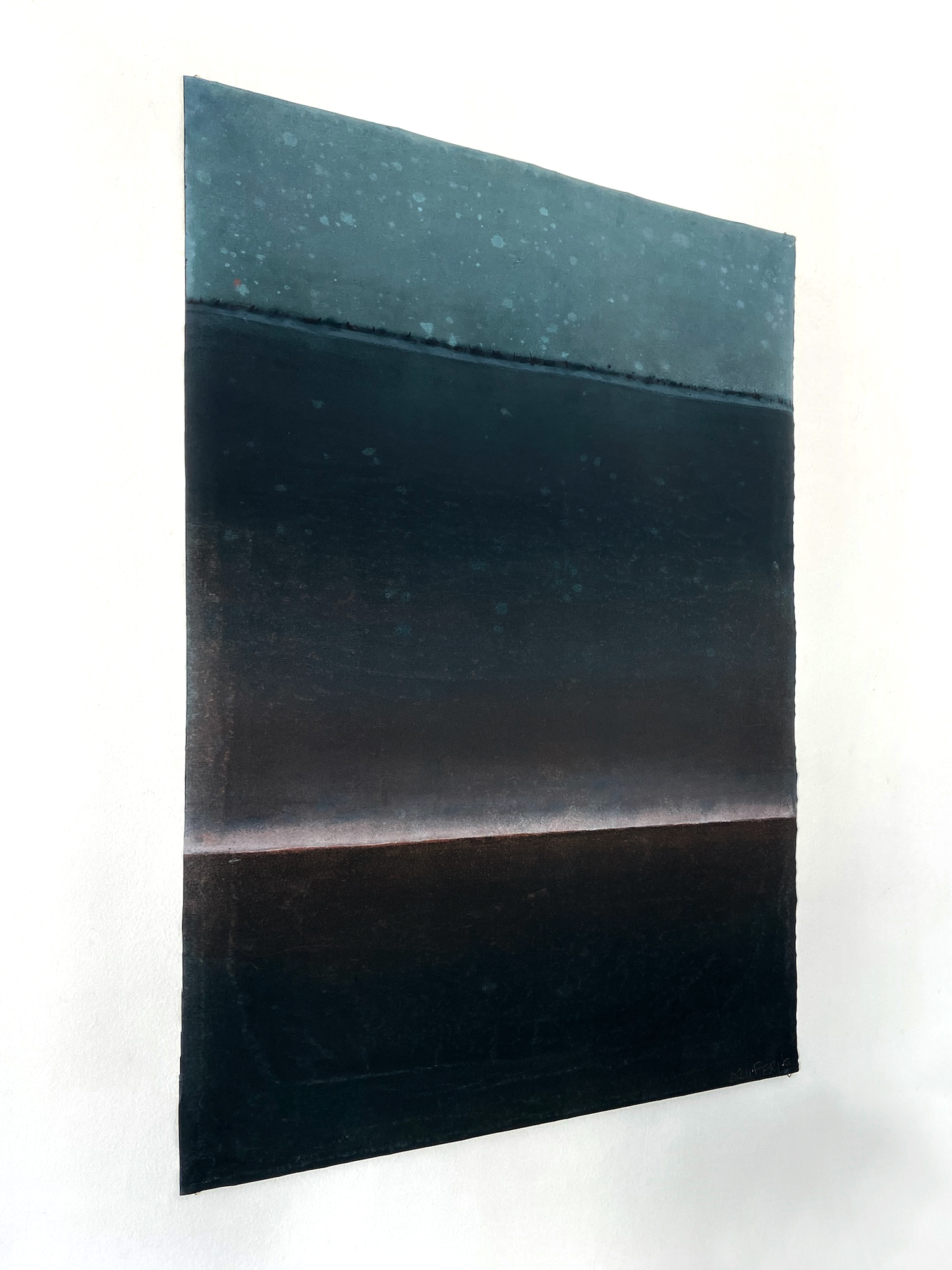 Untitled XXXIV is a oil on canvas painting by the French contemporary artist, Ferle. This painting is composed of two main colors: blue and grey. Blending gradients with horizontal lines, this abstract piece captivates with the depth of its colors.