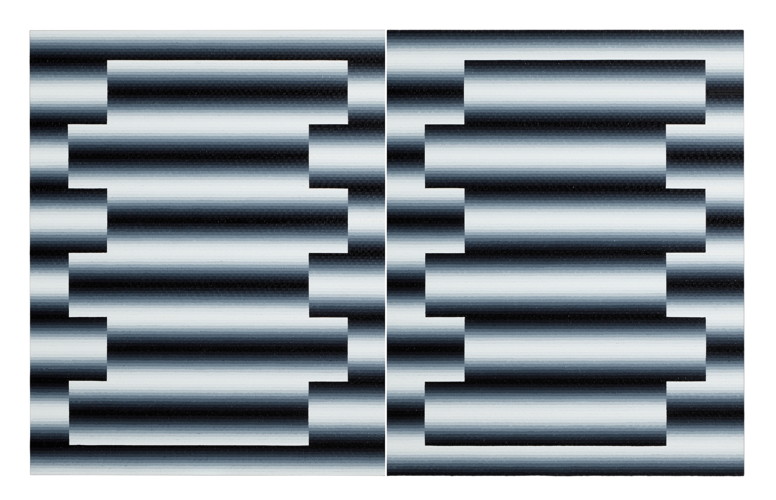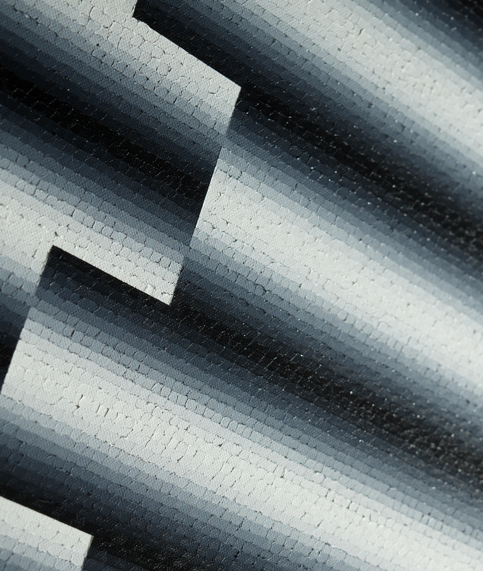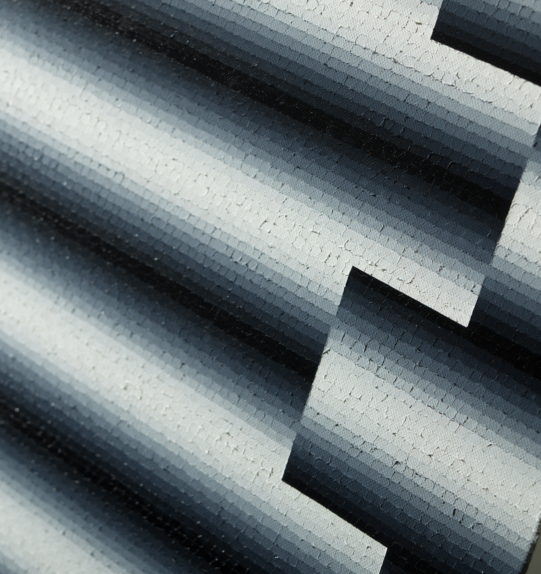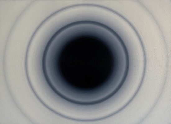 Mathieu Piffeteau works with all colours except red; for this paintings, he used shades of black and white. In this paintings, it is possible to appreciate a visual effect of luminous ‘blur’, an optical illusion created by the artist using a short gradation of colours. The viewer may have the impression that an artificial light, such as neon or a lightbox, is illuminating the painting.