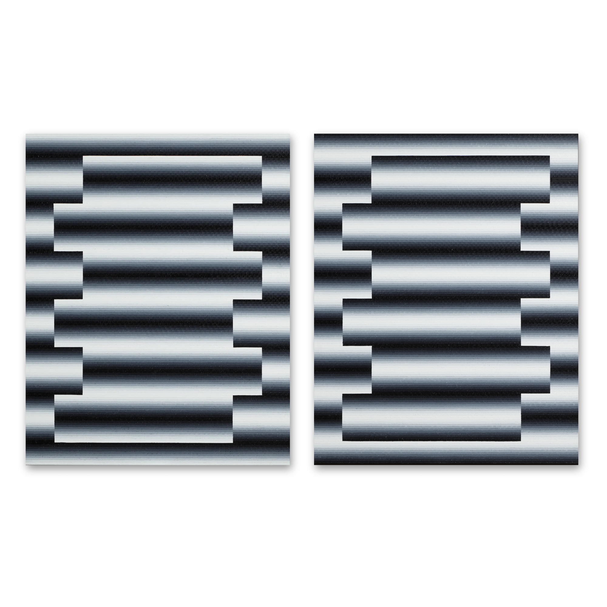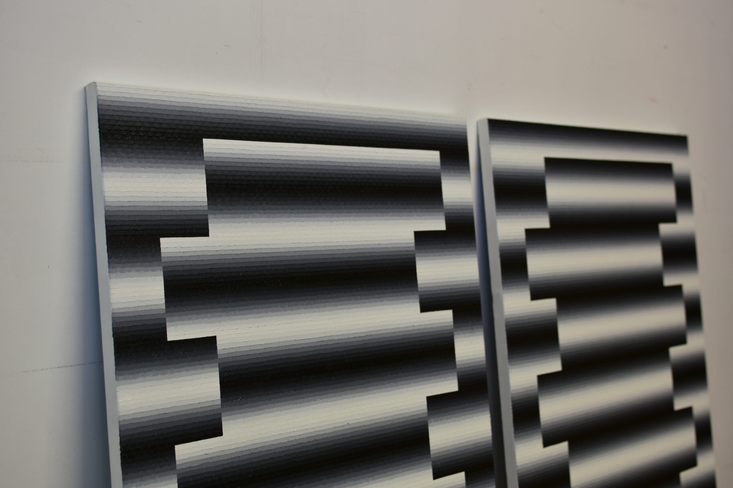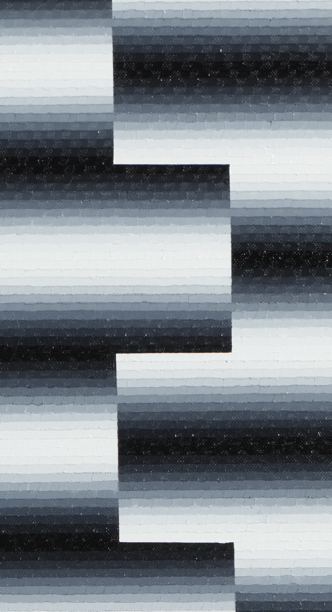 Mathieu Piffeteau works with all colours except red; for this paintings, he used shades of black and white. In this paintings, it is possible to appreciate a visual effect of luminous ‘blur’, an optical illusion created by the artist using a short gradation of colours. The viewer may have the impression that an artificial light, such as neon or a lightbox, is illuminating the painting.