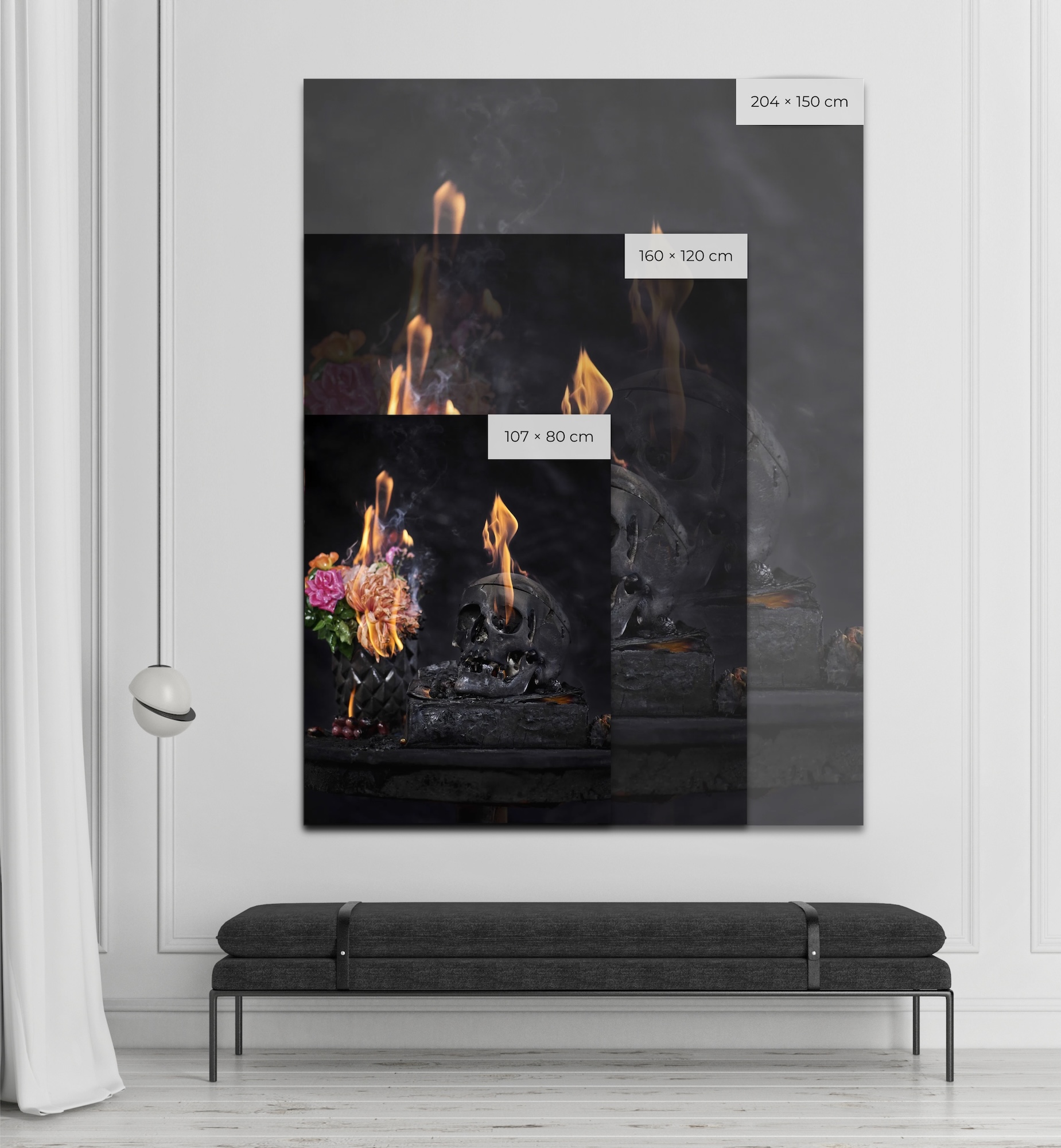 At the heart of his compositions, the artist places the skull – a universal symbol that spans the ages, cultures and disciplines – but he introduces an unexpected element to the traditional iconography of the Vanitas: fire. An ambivalent element, at once destructive and purifying, fire enriches the work with multiple layers of interpretation: it embodies the destruction of contemporary culture centred on the ego and the digital image while at the same time effecting a metamorphosis of the skull and the identities it represents throughout the artistic process.