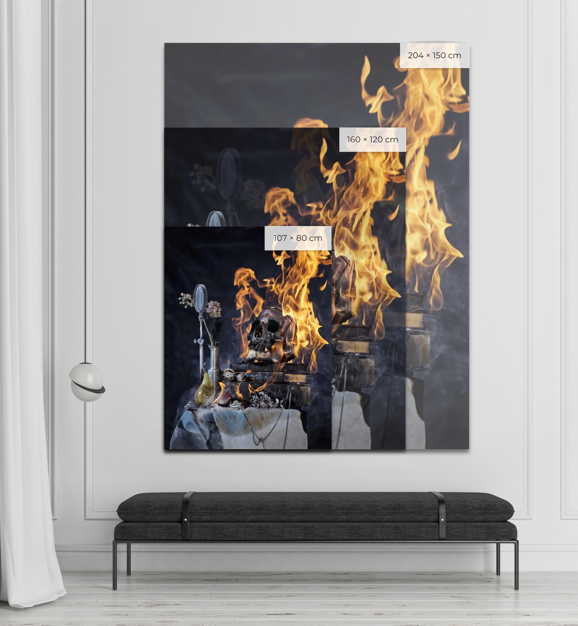 At the heart of his compositions, the artist places the skull – a universal symbol that spans the ages, cultures and disciplines – but he introduces an unexpected element to the traditional iconography of the Vanitas: fire. An ambivalent element, at once destructive and purifying, fire enriches the work with multiple layers of interpretation: it embodies the destruction of contemporary culture centred on the ego and the digital image while at the same time effecting a metamorphosis of the skull and the identities it represents throughout the artistic process.