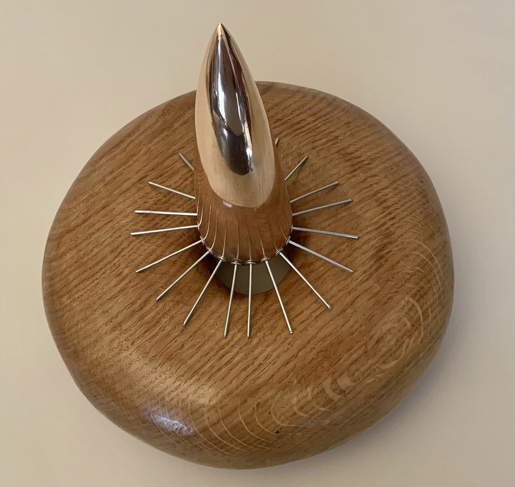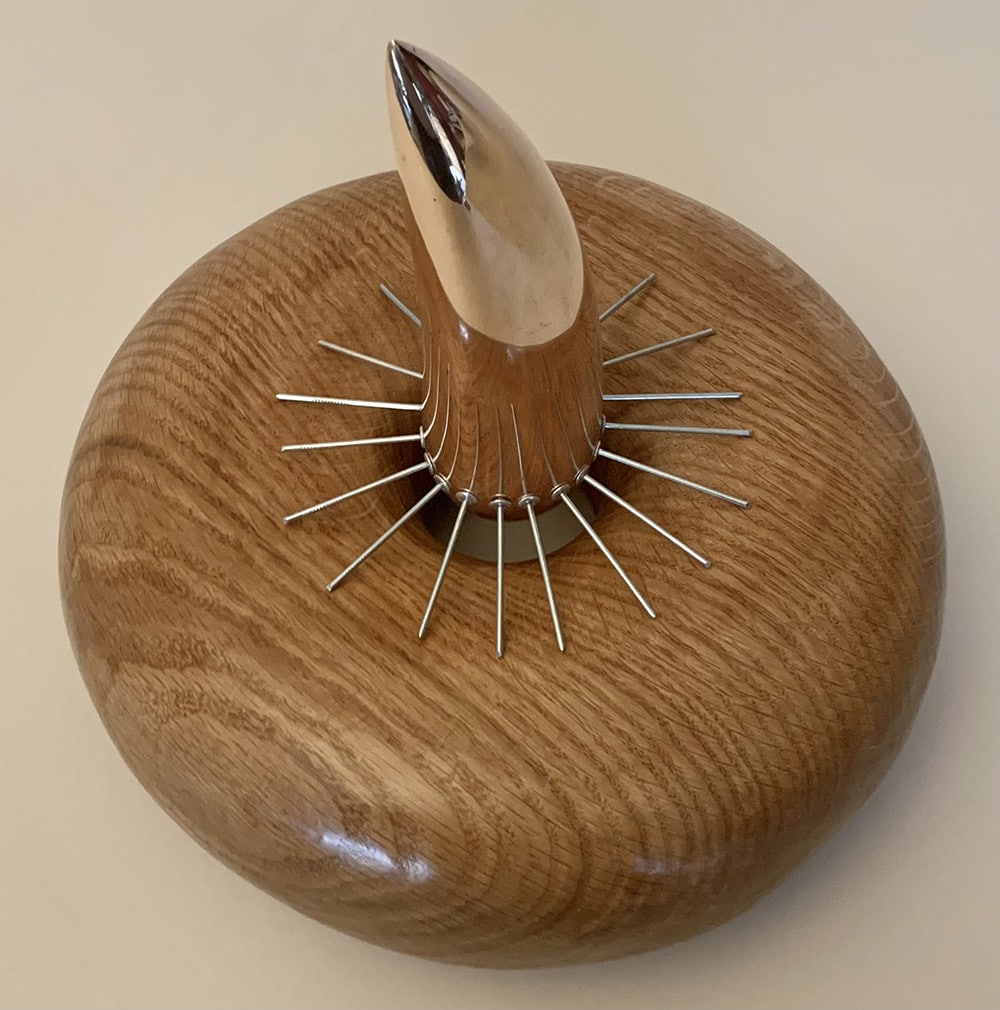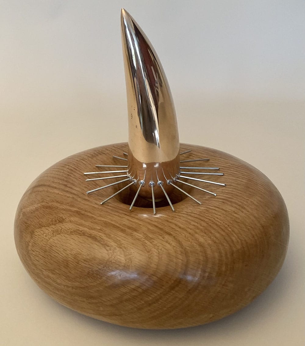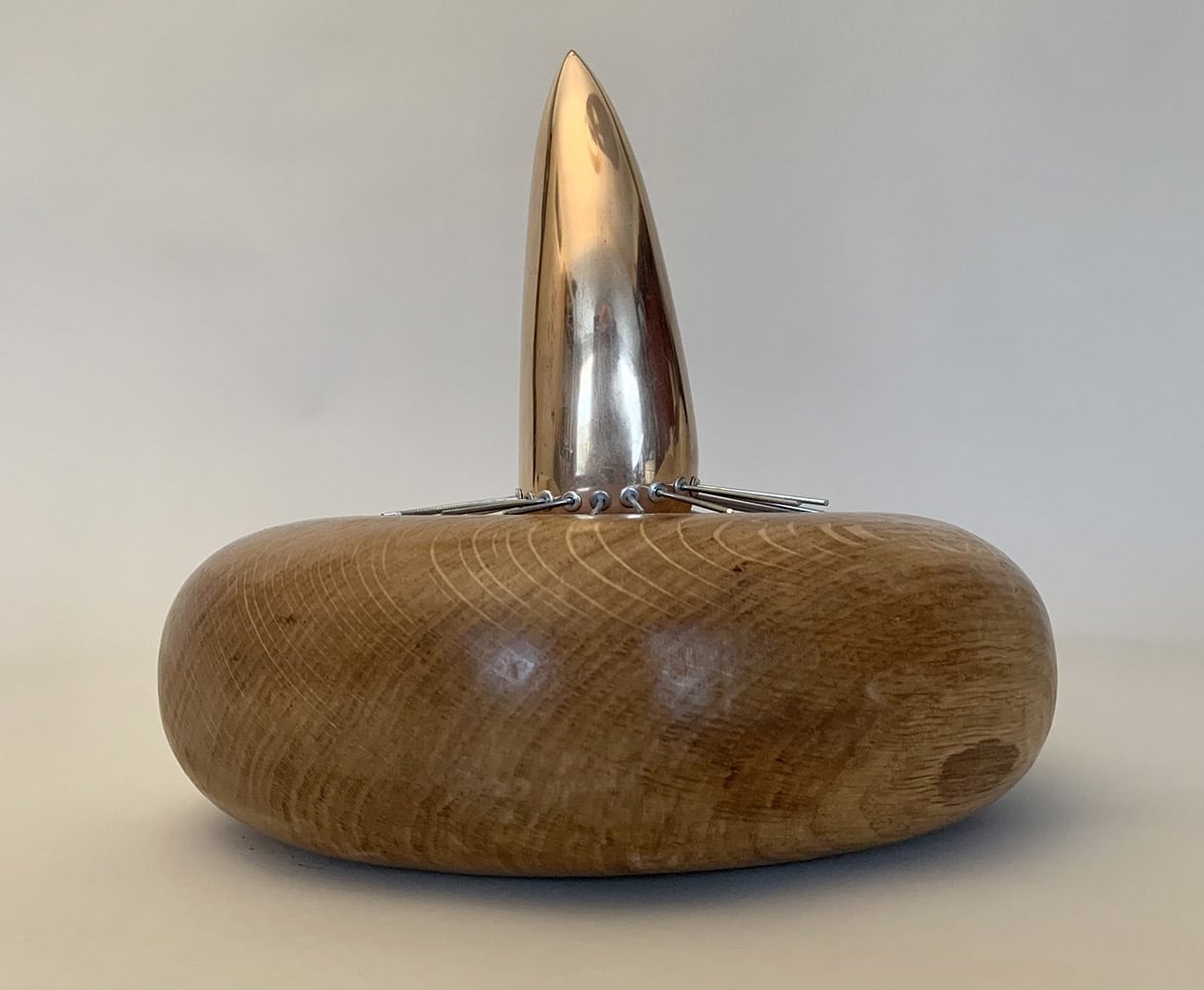 Variation on a theme II : Avoidance is a sculpture by contemporary British artist Peter Brooke-Ball. This piece in oak wood, steel and bronze is quite unusual for the artist and differs from his other artworks, particularly with the materials used and shapes, reminding one of a big cat’s paw. The wood with its soft and curved lines contrasts with the extremely sharp metal, that gives the sculpture a dangerous look.
