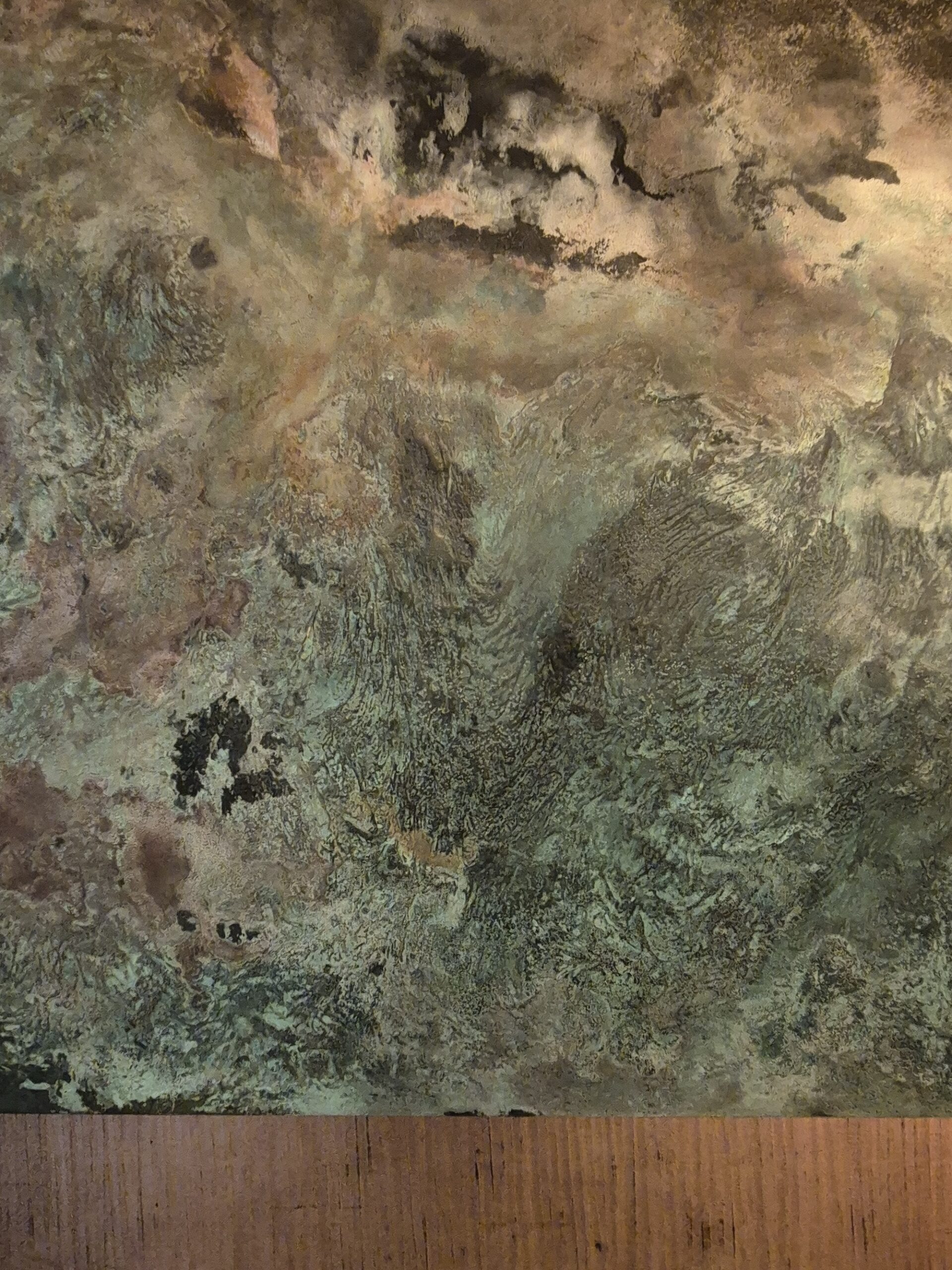 Description: Oxidized zinc and bronze leaves on aluminum panel, patina fixed with beeswax polish