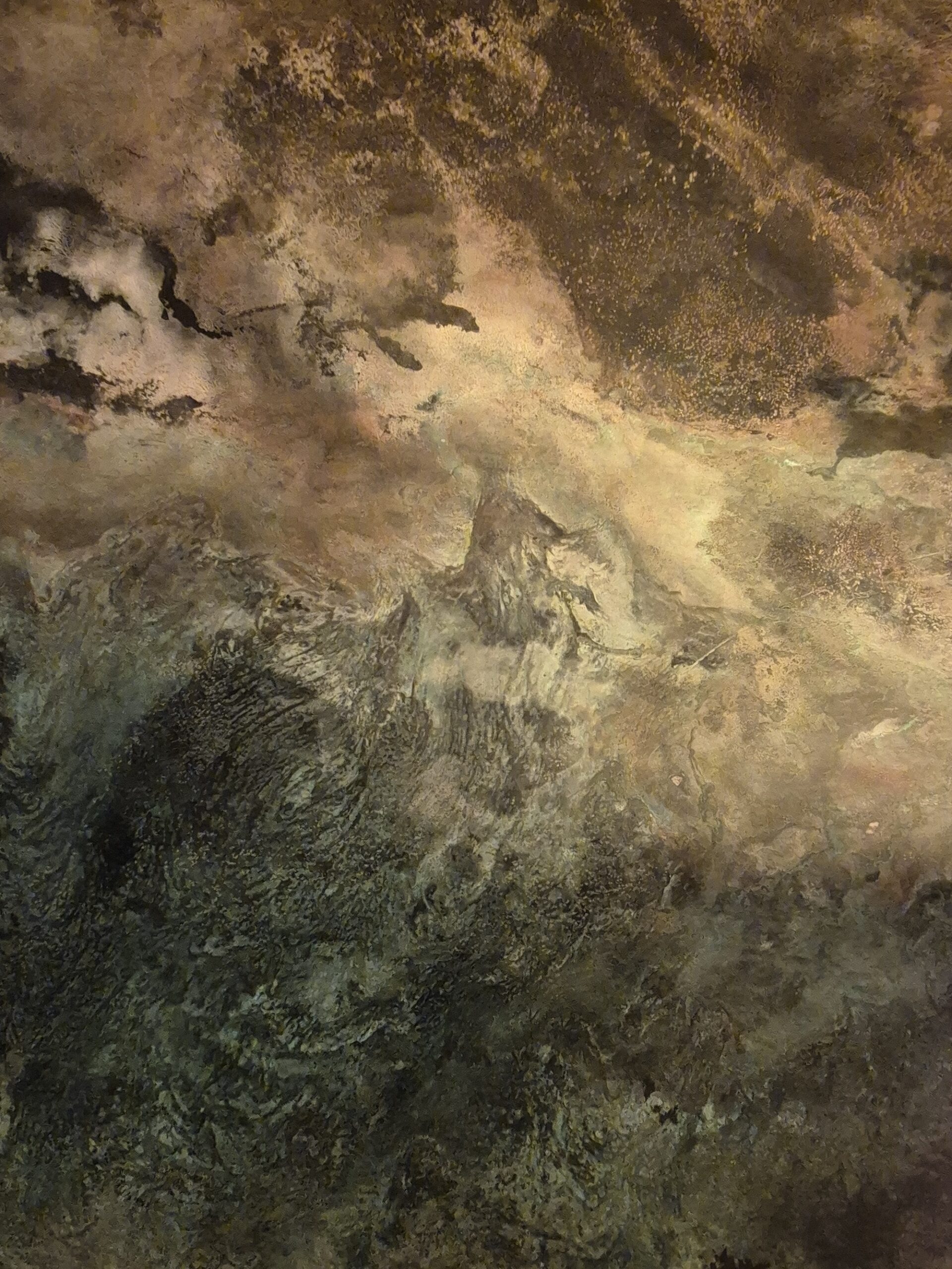 Frédérique Domergue uses thin sheets of metal applied on wood or aluminum panels. Through a patient process of polishing and oxidation the artist manages to confer a warmth and sensuality which tempts the observer to caress the oxidized surface of her paintings, now become all radiant and silky.