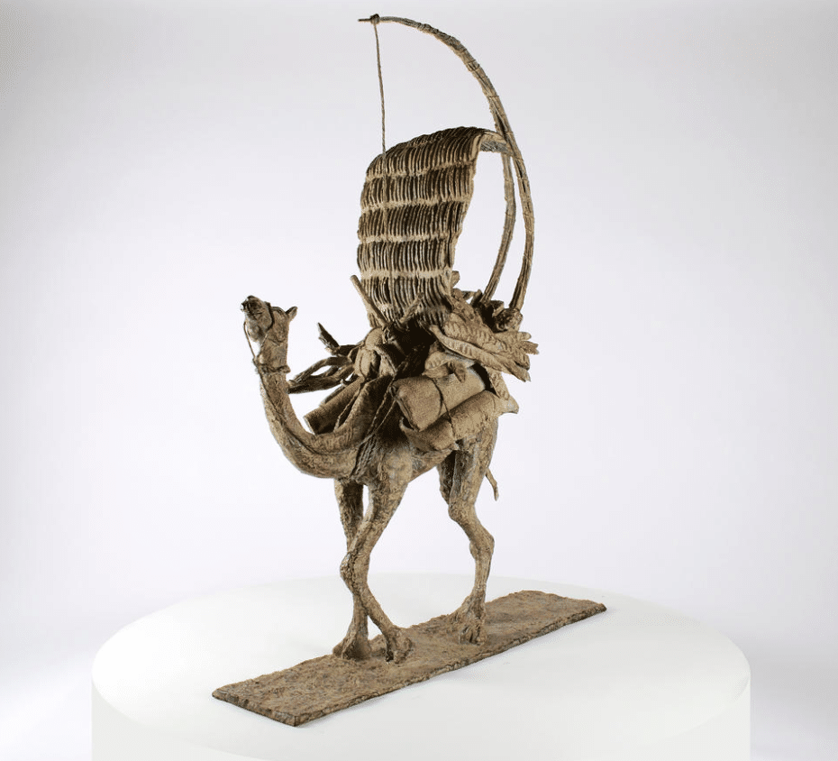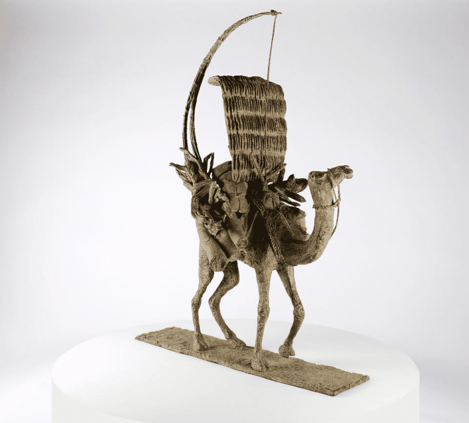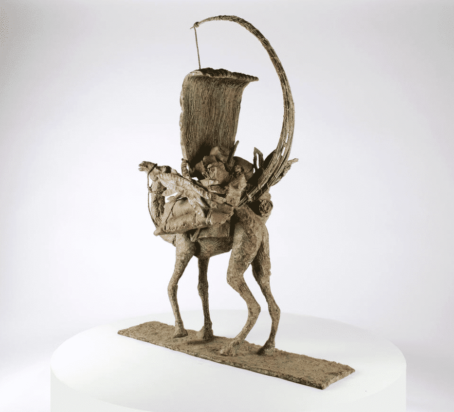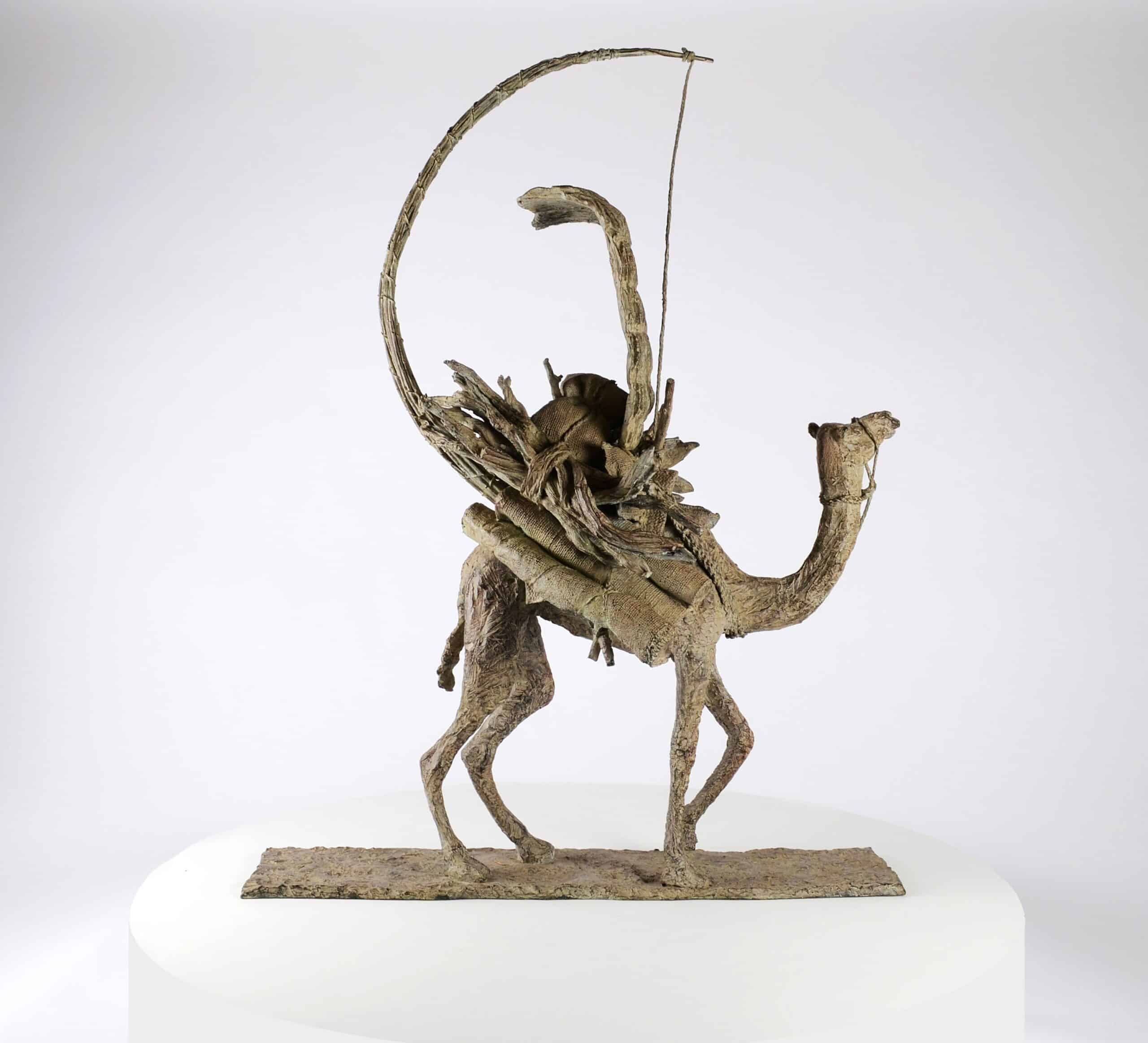The Vessel of the Desert (Le vaisseau du désert) is an artwork by French contemporary sculptor Marine de Soos. This bronze sculpture is from the “Animals” series. This figurative artwork is of a camel walking, its back loaded with rugs, wood and bags. The artist gets her inspiration from real or imaginary scenes. This bronze sculpture could be placed in an outside setting.