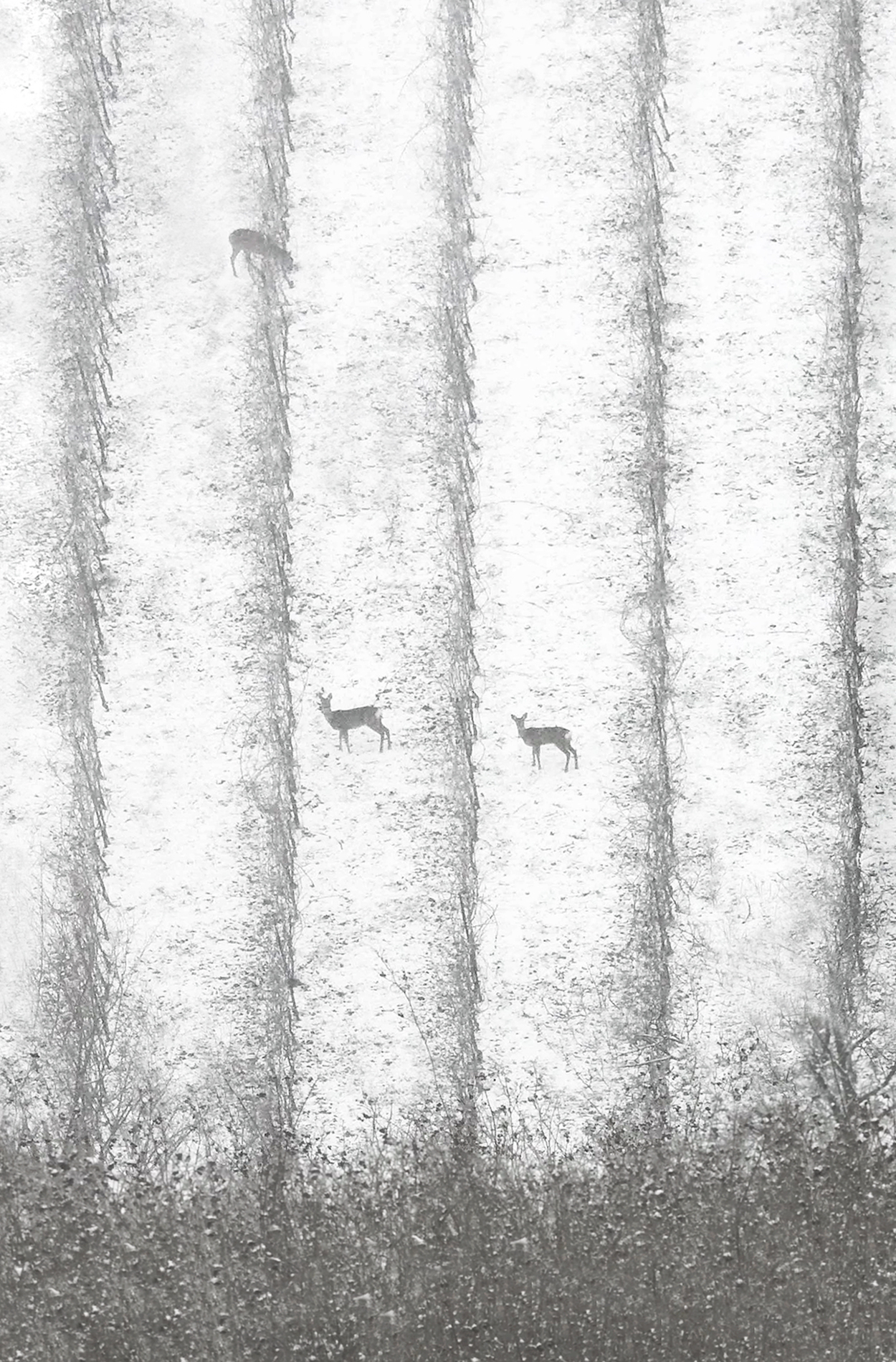 In this series, the winter landscapes of the Po Valley, imbued with peace and quiet, are shown under snow and, at times, in fog. Leafless trees and the silhouettes of distant animals stand out against the silent white expanse, creating delicate, graphic patterns. In some photographs, a turquoise-colored flat area resembling a water surface can be seen in the foreground; in reality, it’s the window of the photographer’s car. As is often the case in Riccardo Varini’s work, we find the concept of the ‘threshold’, a point of view that allows us to look beyond, to contemplate the silence, establishing a respect for the landscape.