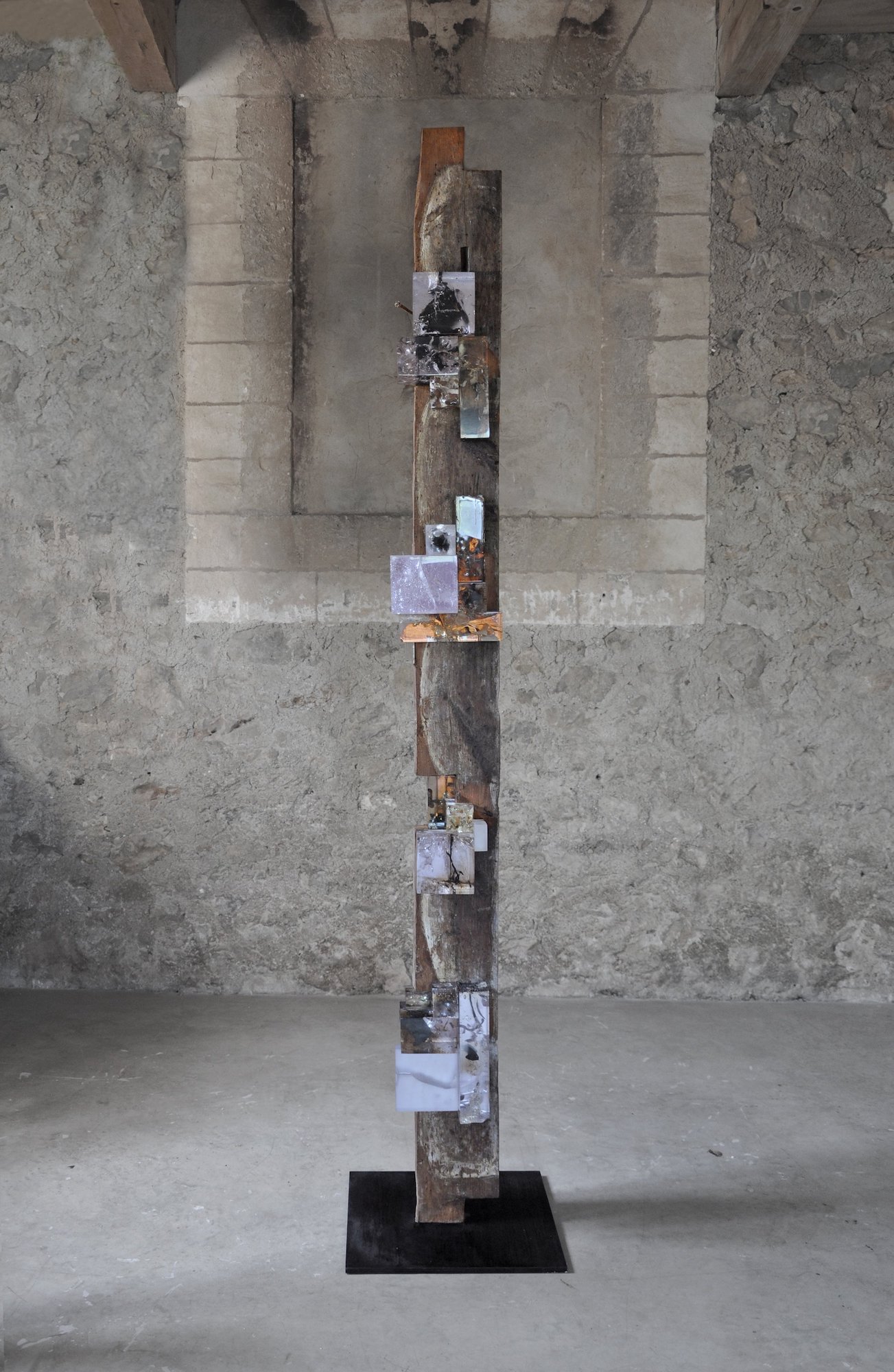 “Encrusted with synthetic mineral-like growths, they are a palimpsest of human industry through the ages. The notches carved to accommodate other beams; the old, twisted nails; the splashes of paint; the insect boreholes and worn-down ends, all hint at a rich history of utilitarian function and the many lives lived beneath them. They are a record of human construction from a time before plastics were invented, when everything would have been built and carved by hand. […] I imagined a future where these beams might reemerge – a time where our present era would be ancient history and all the material innovations of our time had become assimilated with and indistinguishable from nature. A flattening of human history into a single era – the Anthropocene – where synthetic minerals and inorganic deposits grow in and on natural materials. The Viga sculptures are an amalgam of the natural and the manmade, their totemic appearance dispassionately assessing the legacy of the human epoch.” Tom Price