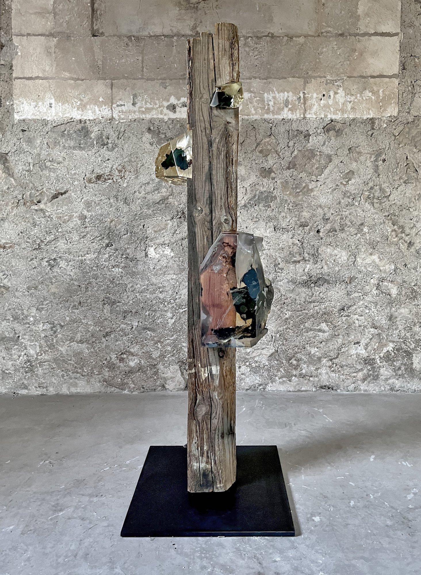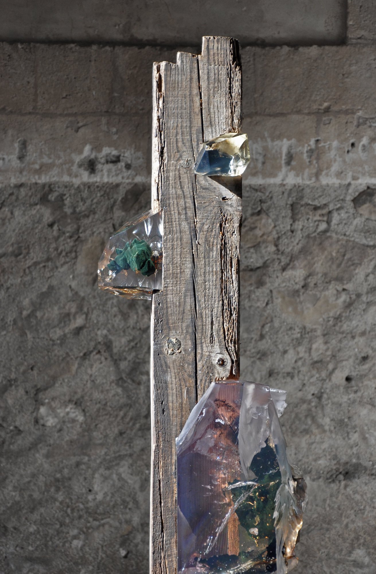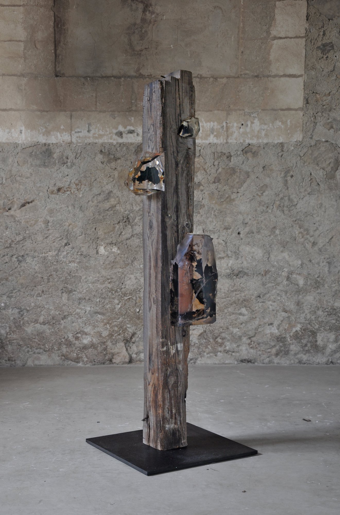 “Encrusted with synthetic mineral-like growths, they are a palimpsest of human industry through the ages. The notches carved to accommodate other beams; the old, twisted nails; the splashes of paint; the insect boreholes and worn-down ends, all hint at a rich history of utilitarian function and the many lives lived beneath them. They are a record of human construction from a time before plastics were invented, when everything would have been built and carved by hand. […] I imagined a future where these beams might reemerge – a time where our present era would be ancient history and all the material innovations of our time had become assimilated with and indistinguishable from nature. A flattening of human history into a single era – the Anthropocene – where synthetic minerals and inorganic deposits grow in and on natural materials. The Viga sculptures are an amalgam of the natural and the manmade, their totemic appearance dispassionately assessing the legacy of the human epoch.” Tom Price