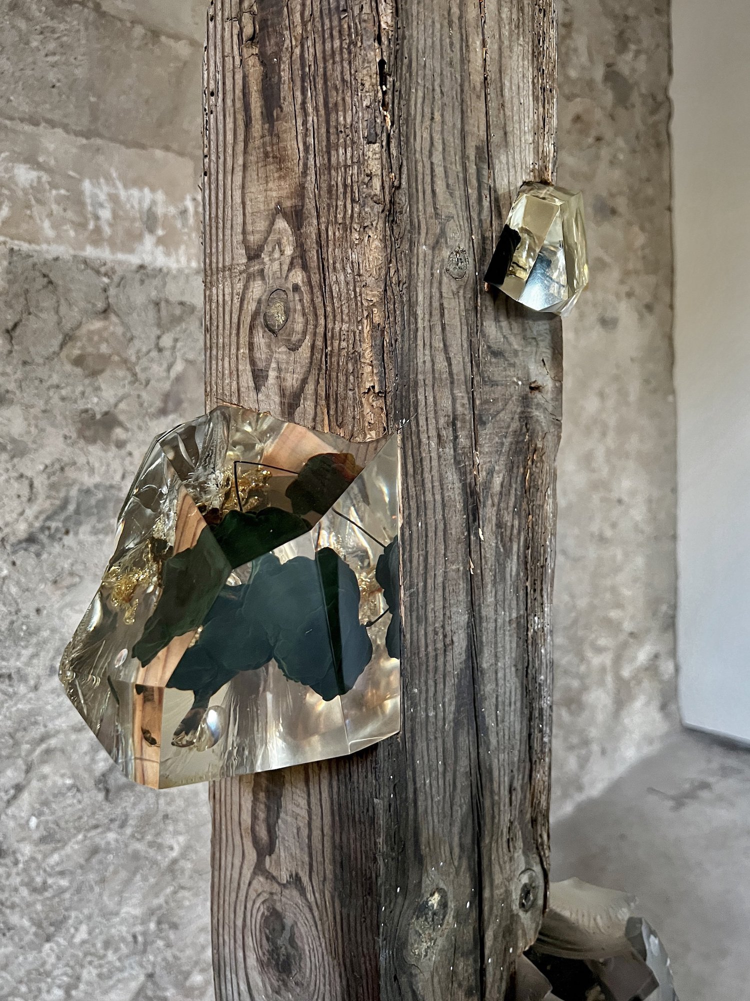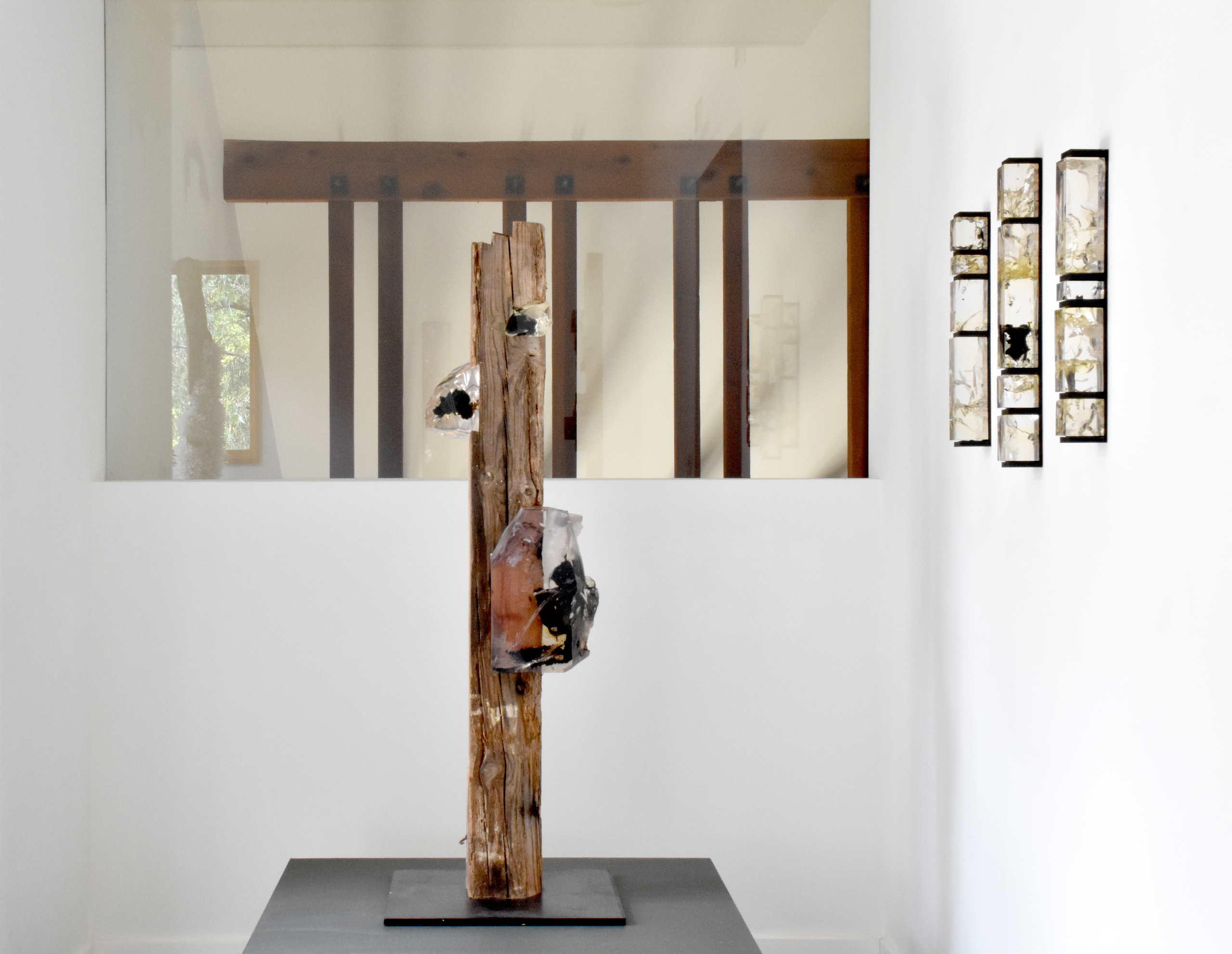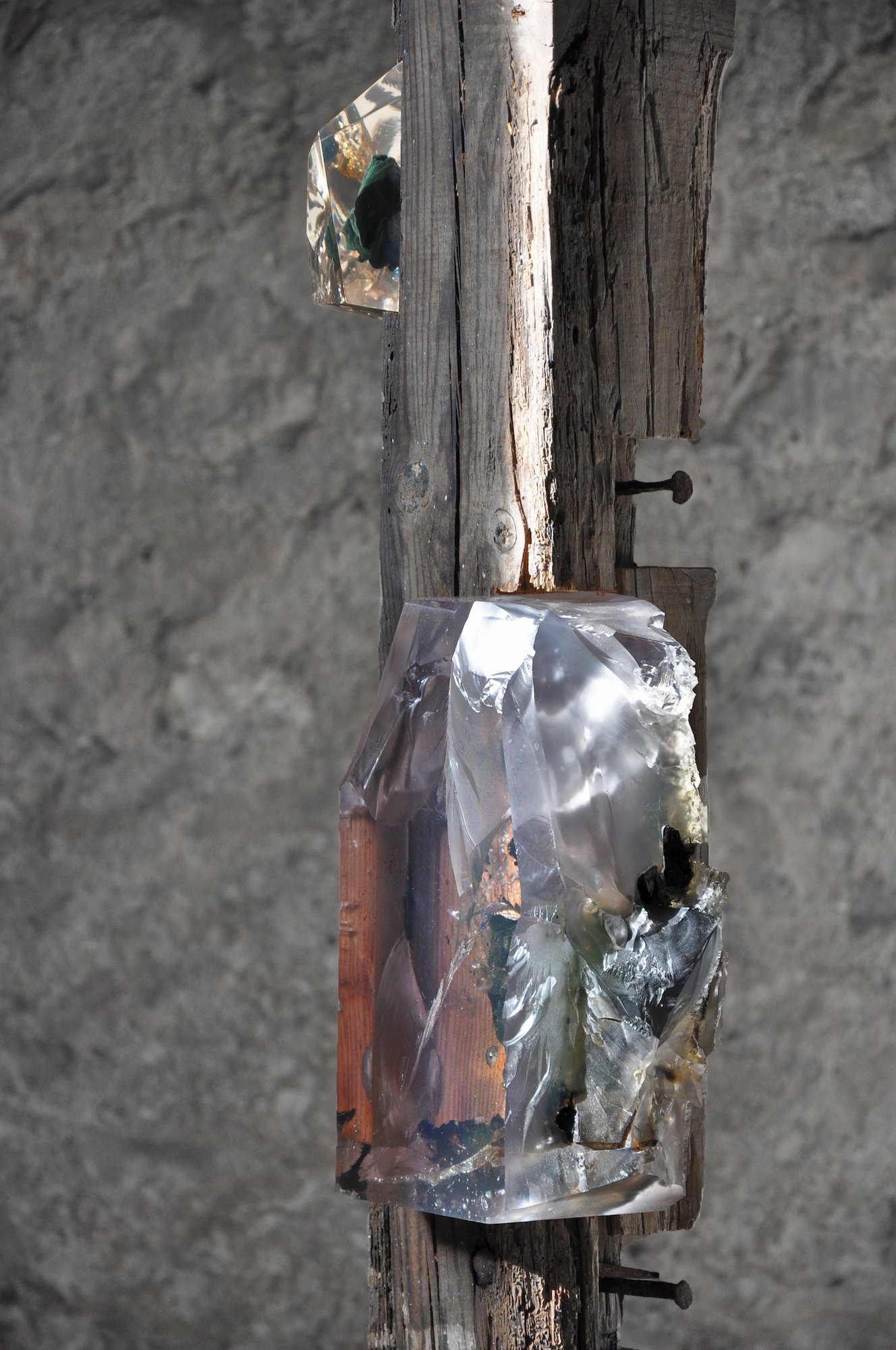“Encrusted with synthetic mineral-like growths, they are a palimpsest of human industry through the ages. The notches carved to accommodate other beams; the old, twisted nails; the splashes of paint; the insect boreholes and worn-down ends, all hint at a rich history of utilitarian function and the many lives lived beneath them. They are a record of human construction from a time before plastics were invented, when everything would have been built and carved by hand. […] I imagined a future where these beams might reemerge – a time where our present era would be ancient history and all the material innovations of our time had become assimilated with and indistinguishable from nature. A flattening of human history into a single era – the Anthropocene – where synthetic minerals and inorganic deposits grow in and on natural materials. The Viga sculptures are an amalgam of the natural and the manmade, their totemic appearance dispassionately assessing the legacy of the human epoch.” Tom Price