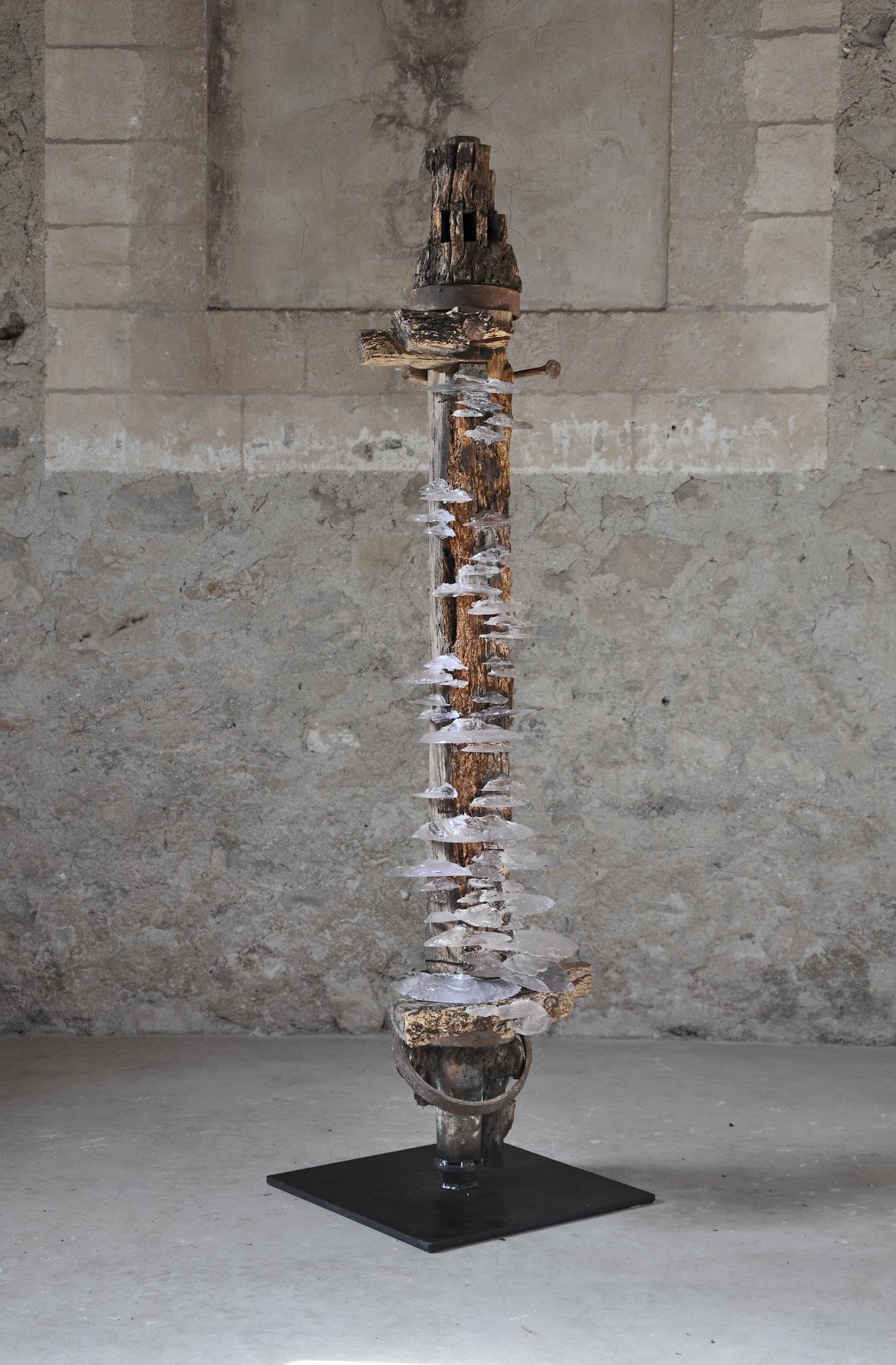 “Encrusted with synthetic mineral-like growths, they are a palimpsest of human industry through the ages. The notches carved to accommodate other beams; the old, twisted nails; the splashes of paint; the insect boreholes and worn-down ends, all hint at a rich history of utilitarian function and the many lives lived beneath them. They are a record of human construction from a time before plastics were invented, when everything would have been built and carved by hand. […] I imagined a future where these beams might reemerge – a time where our present era would be ancient history and all the material innovations of our time had become assimilated with and indistinguishable from nature. A flattening of human history into a single era – the Anthropocene – where synthetic minerals and inorganic deposits grow in and on natural materials. The Viga sculptures are an amalgam of the natural and the manmade, their totemic appearance dispassionately assessing the legacy of the human epoch.” Tom Price