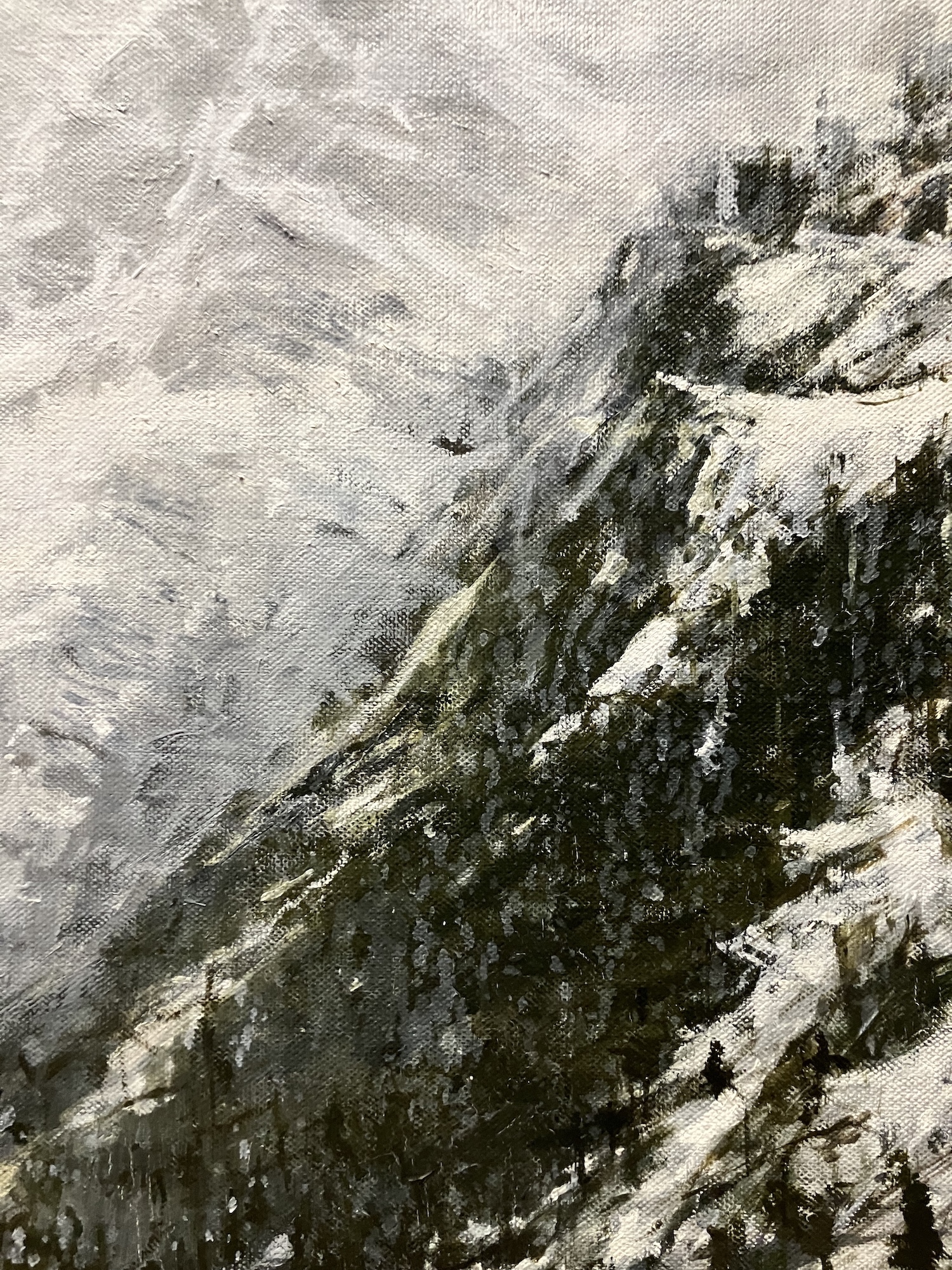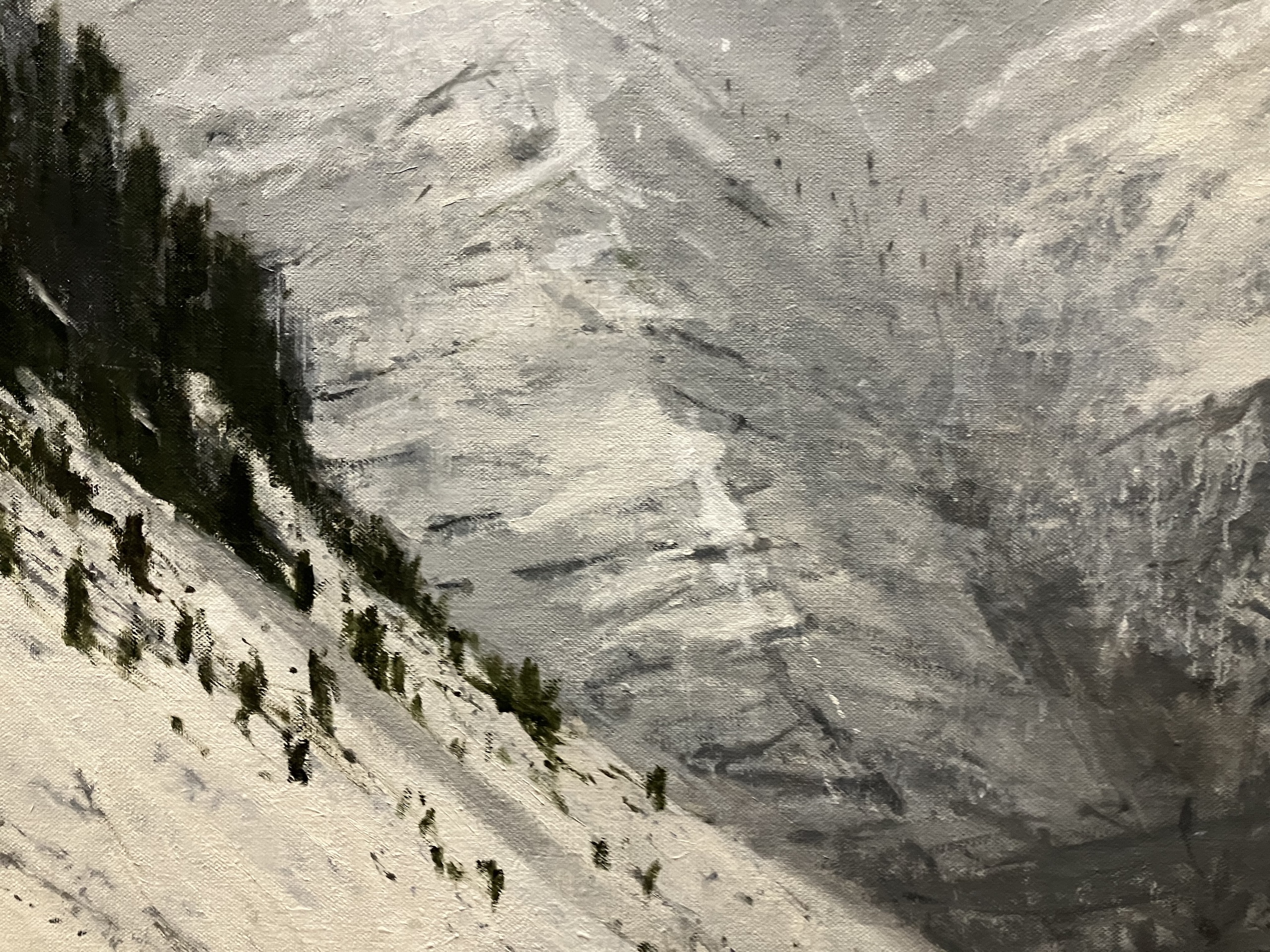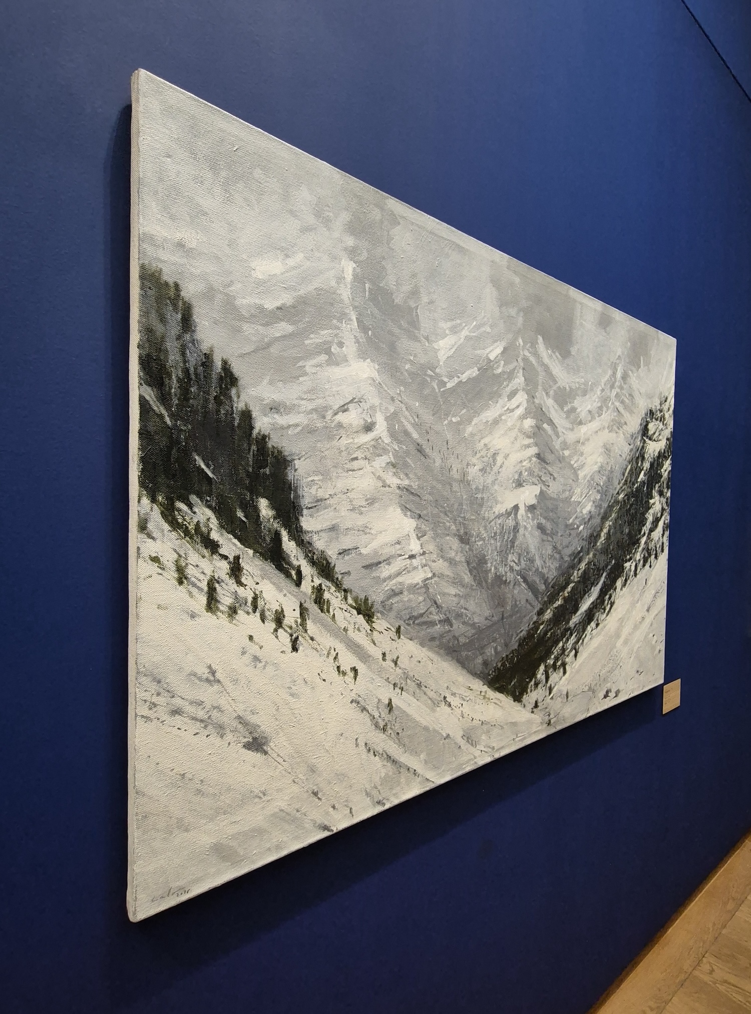Calo Carratalà shows us a snow-covered valley leading to a chain of three mountains. The choice of a large format for this painting allows the viewer to marvel at the immensity of the landscape.