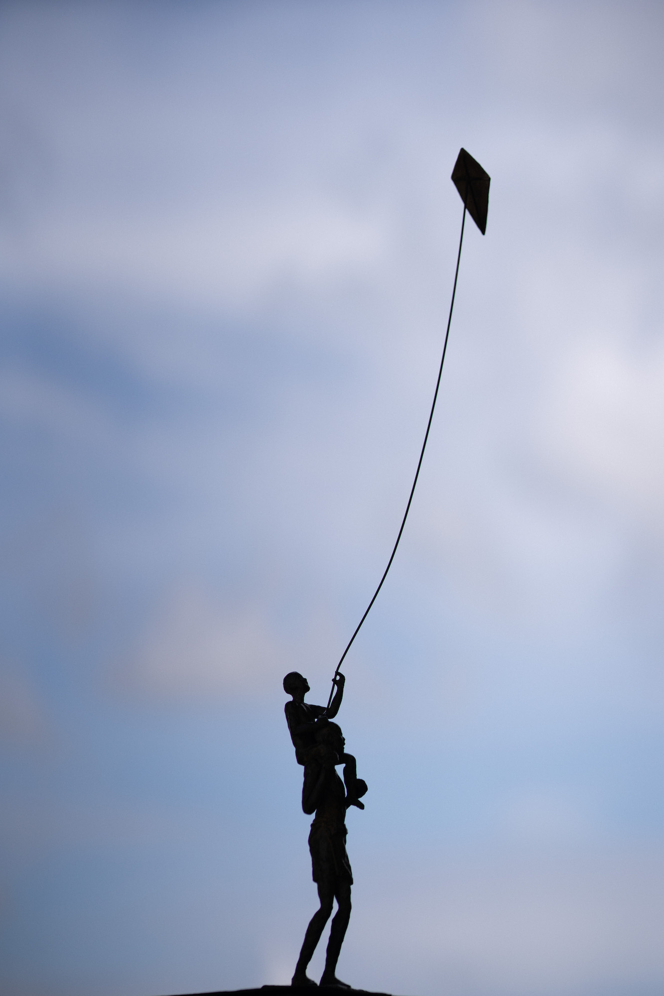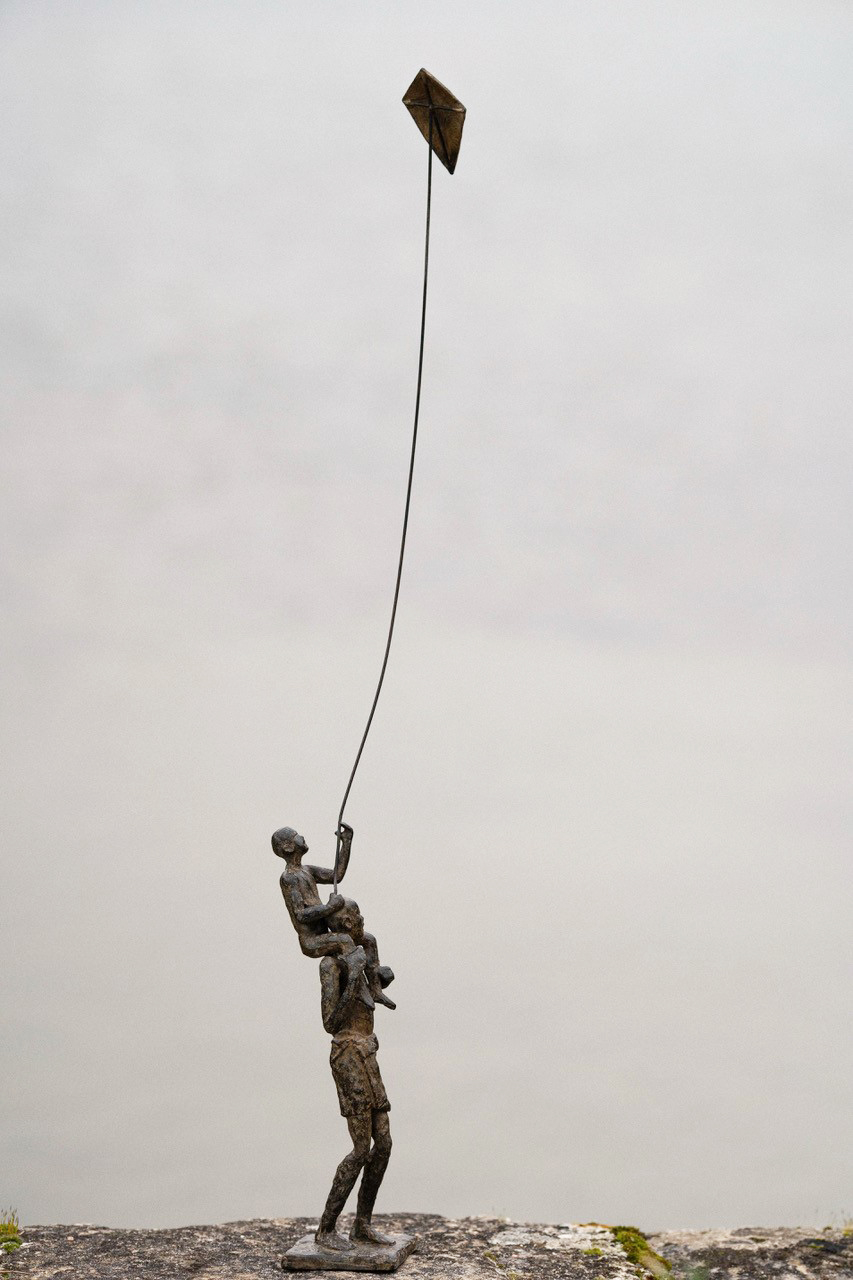 Voile d’enfance VI (Childhood’s Sail VI) is an artwork by French contemporary sculptor Marine de Soos. This bronze sculpture is from the “Figure” series. This aesthetically delicate and light figurative sculpture represents a kid flying a kite with his father. The artist gets her inspiration from real or imaginary scenes.