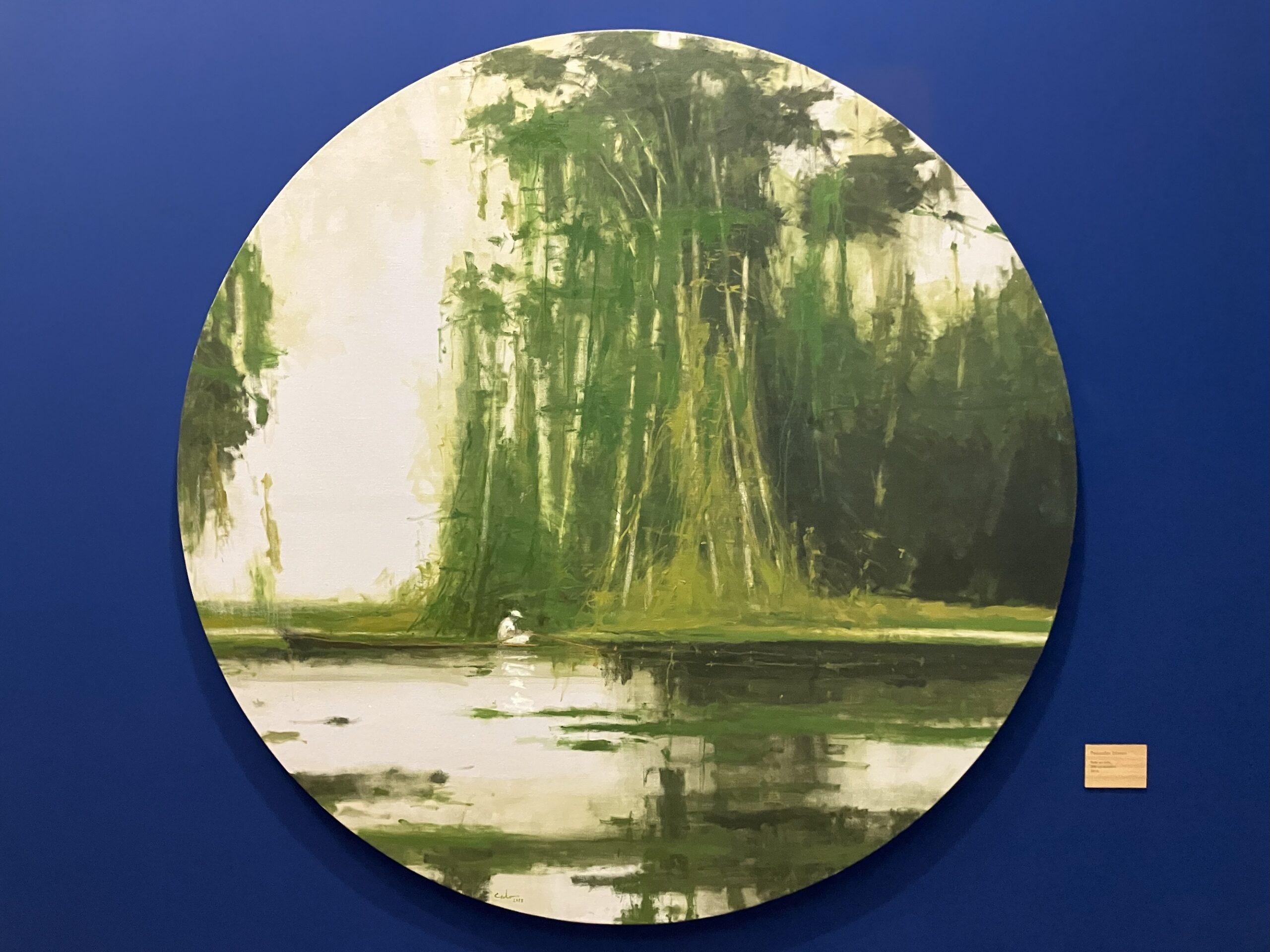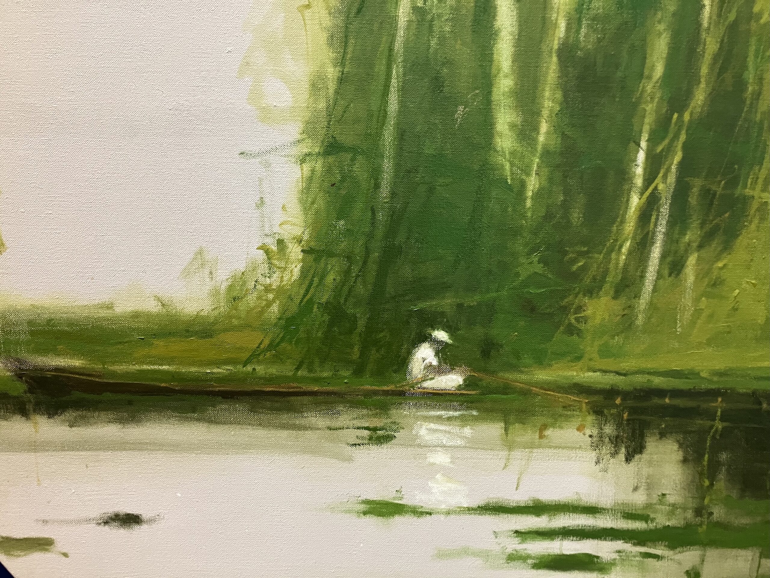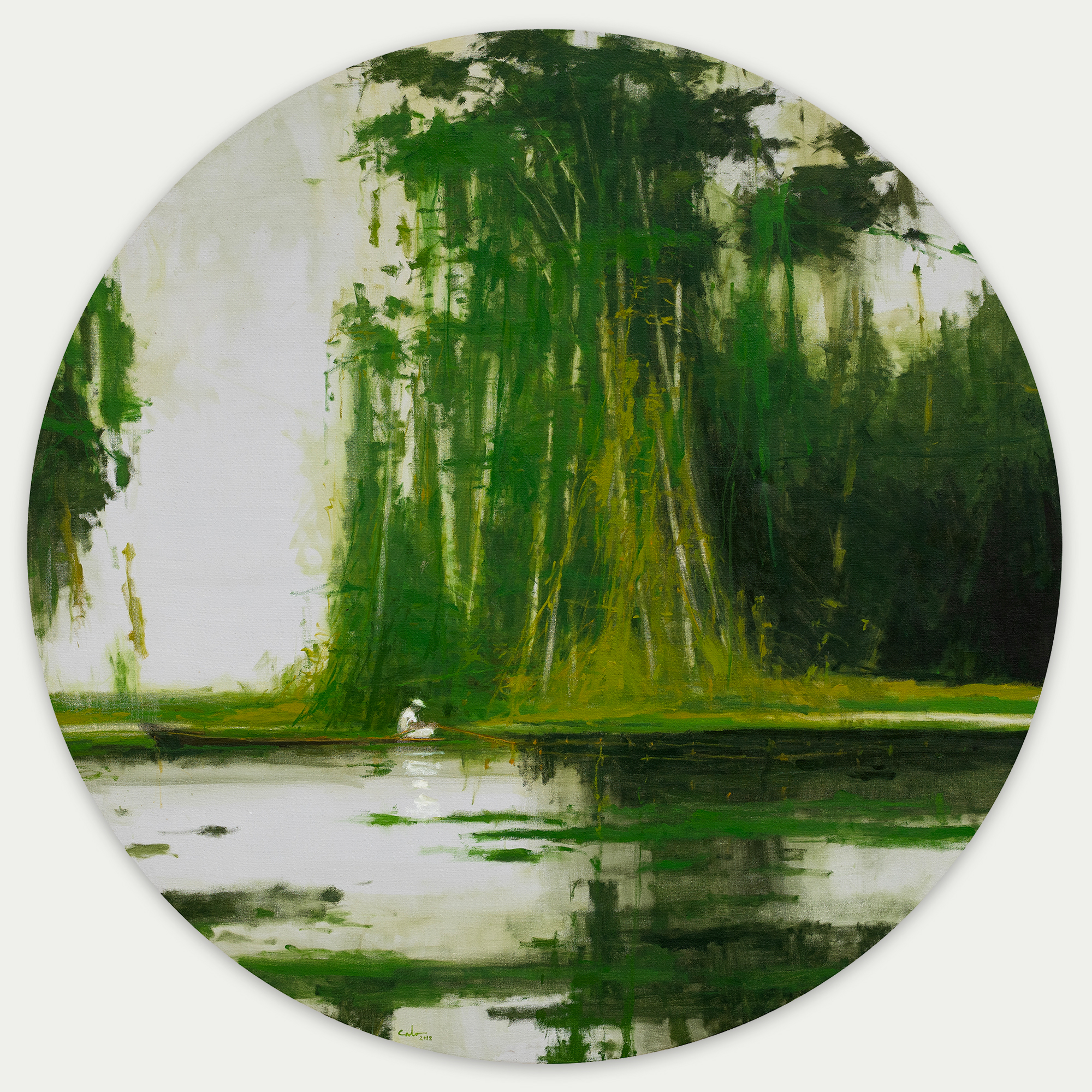 White fisherman is a painting on canvas by contemporary Spanish artist Calo Carratalá from the “Jungle” series. In this artwork, the artist depicts a fisherman dressed in white and surrounded by a lush jungle landscape.