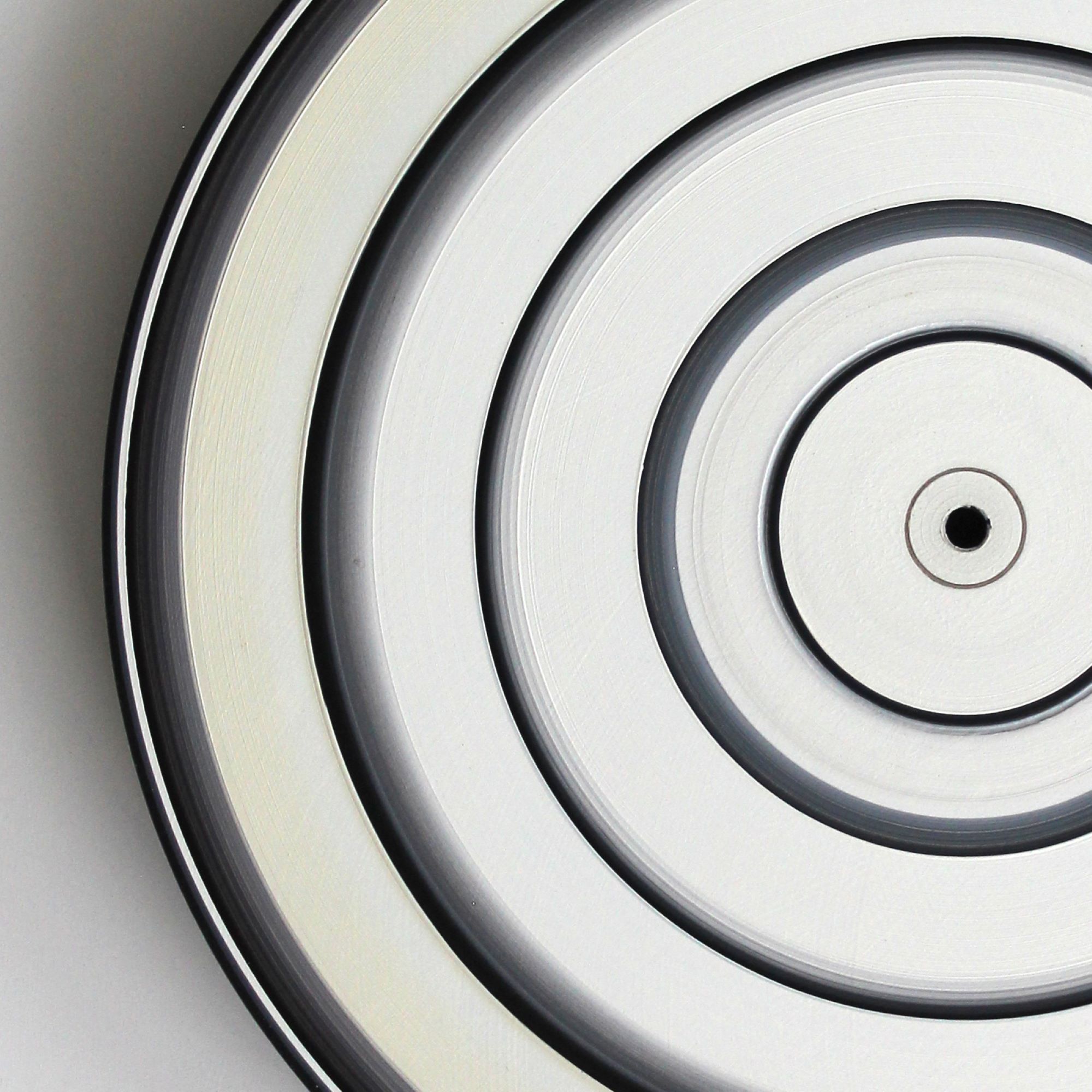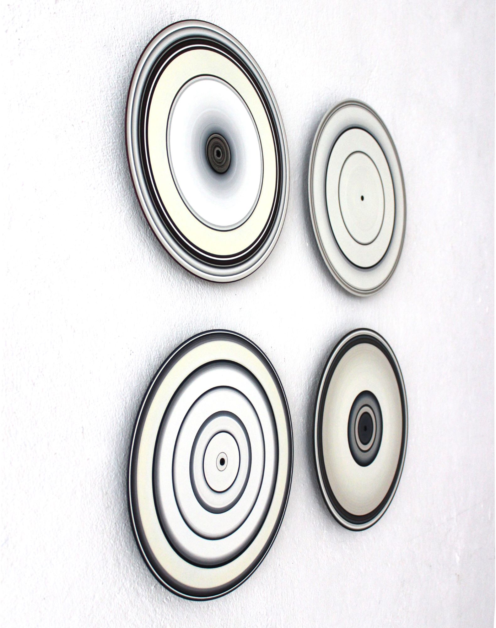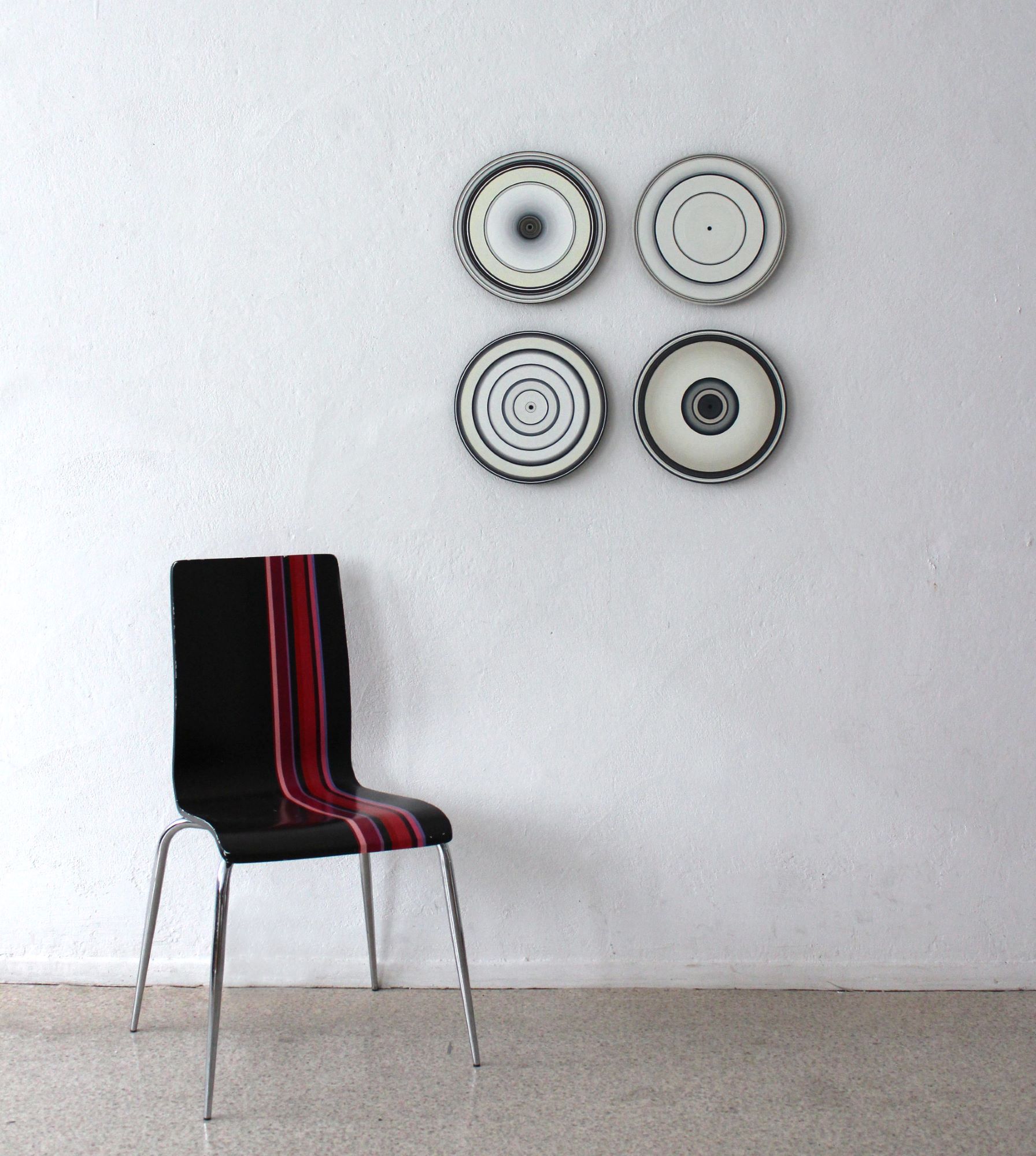 In this last series Sound and Vision, the line remains the only motif of the compositions, but it is illustrated on a new medium which is none other than a vinyl disk. In painting on a turntable, the artist transformed these acoustic data carriers into visual aids: as if the musical pieces are replayed with a brush, in a sort of transformation of sound into image. Individually made in an enduring search for a balance between line, colour and rhythm, these paintings make up an alphabet from which the artist draws on to create different installations and collections.
