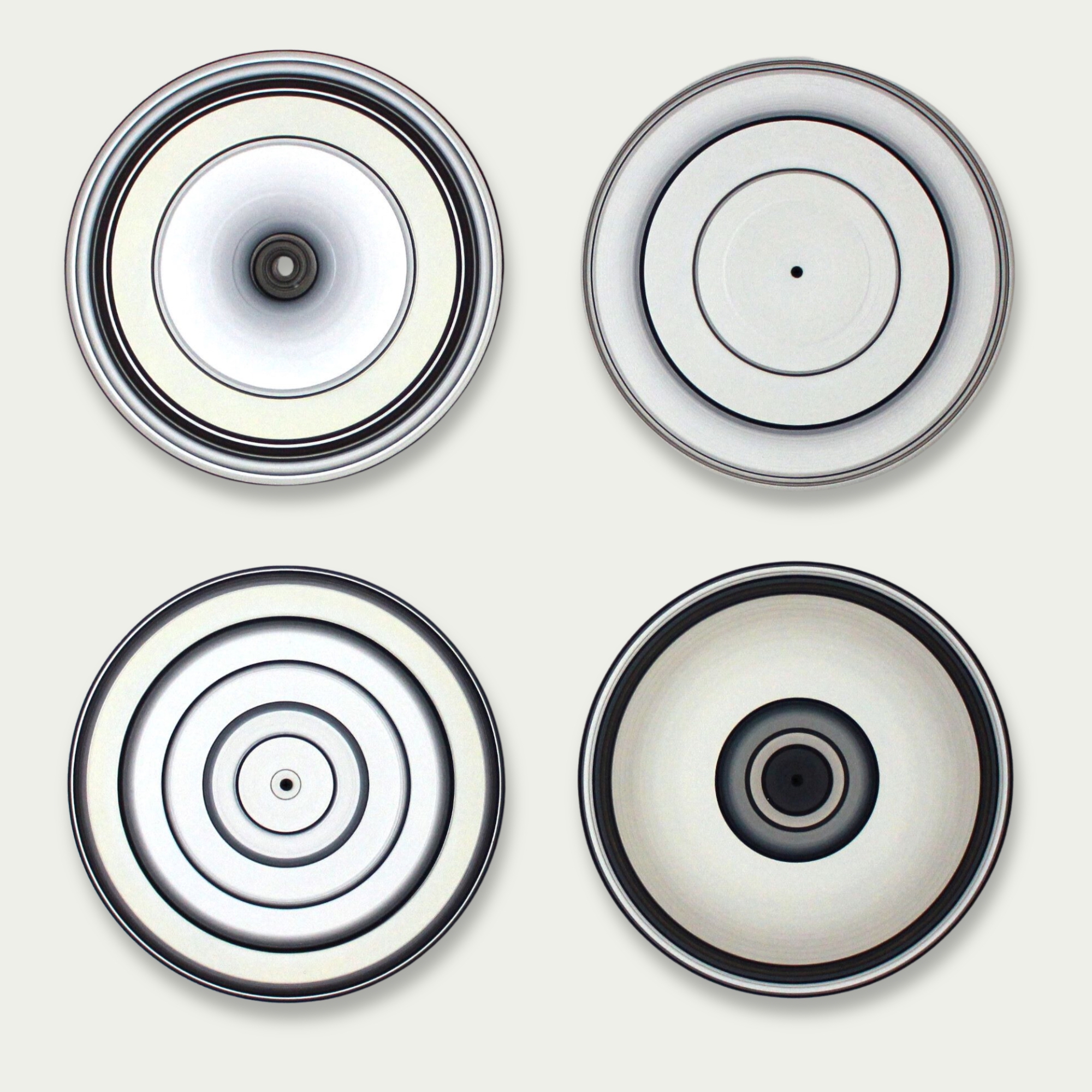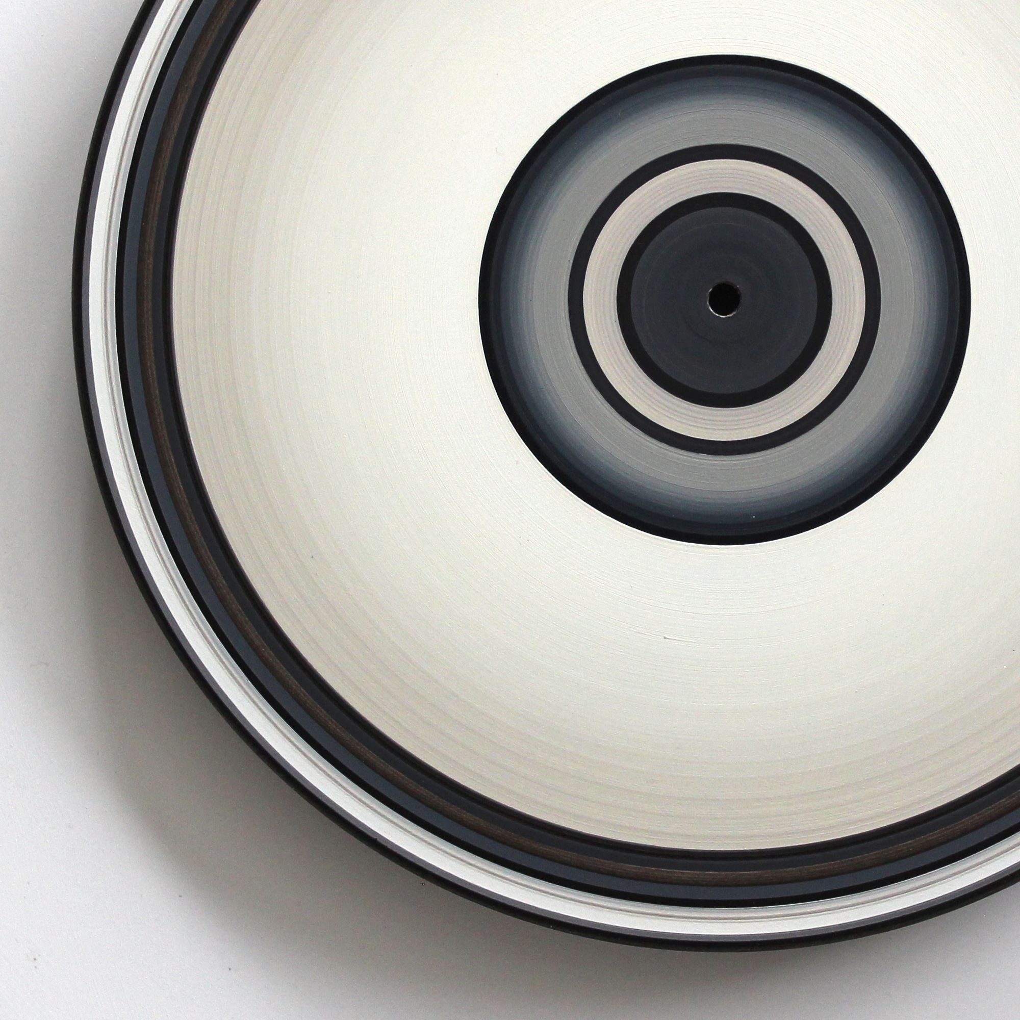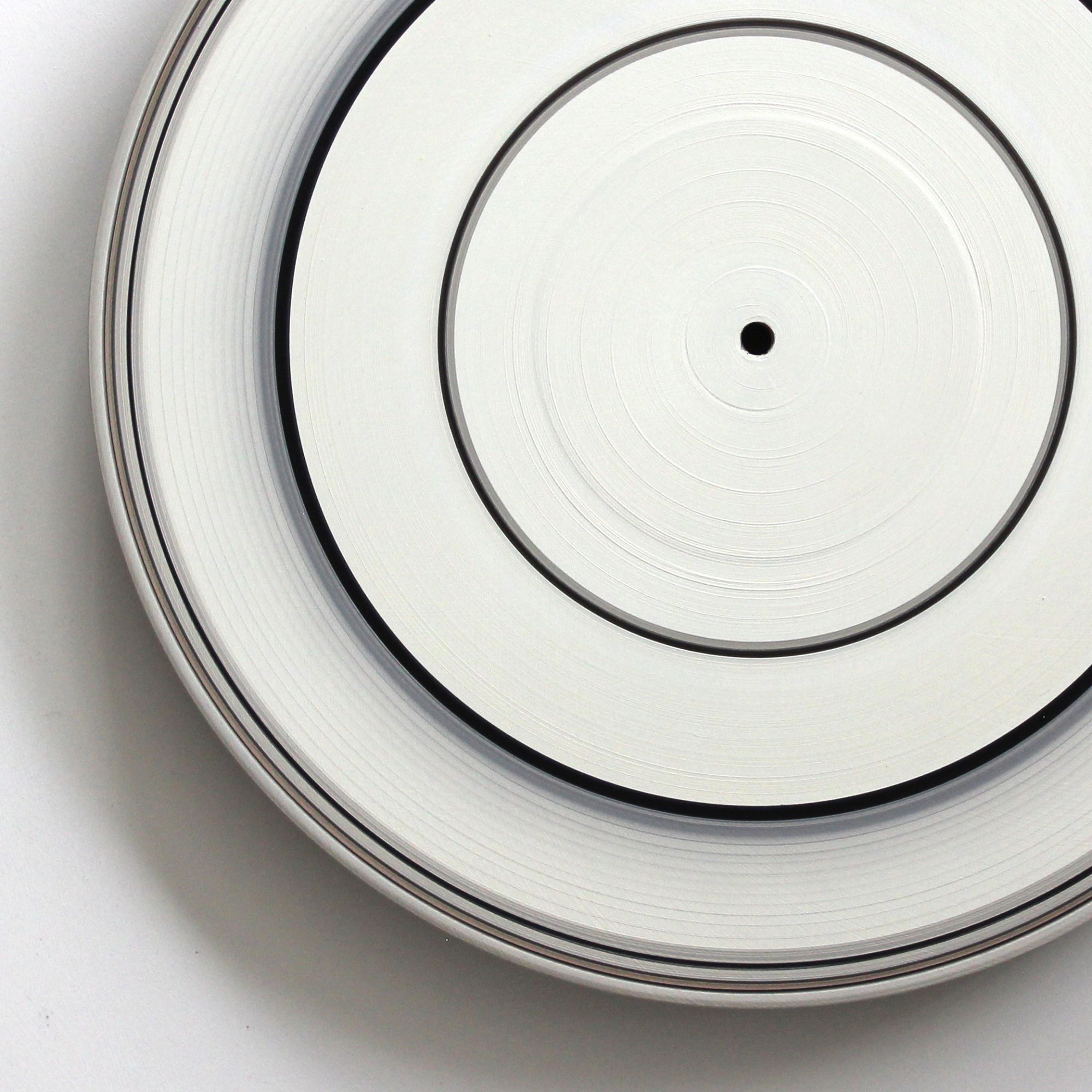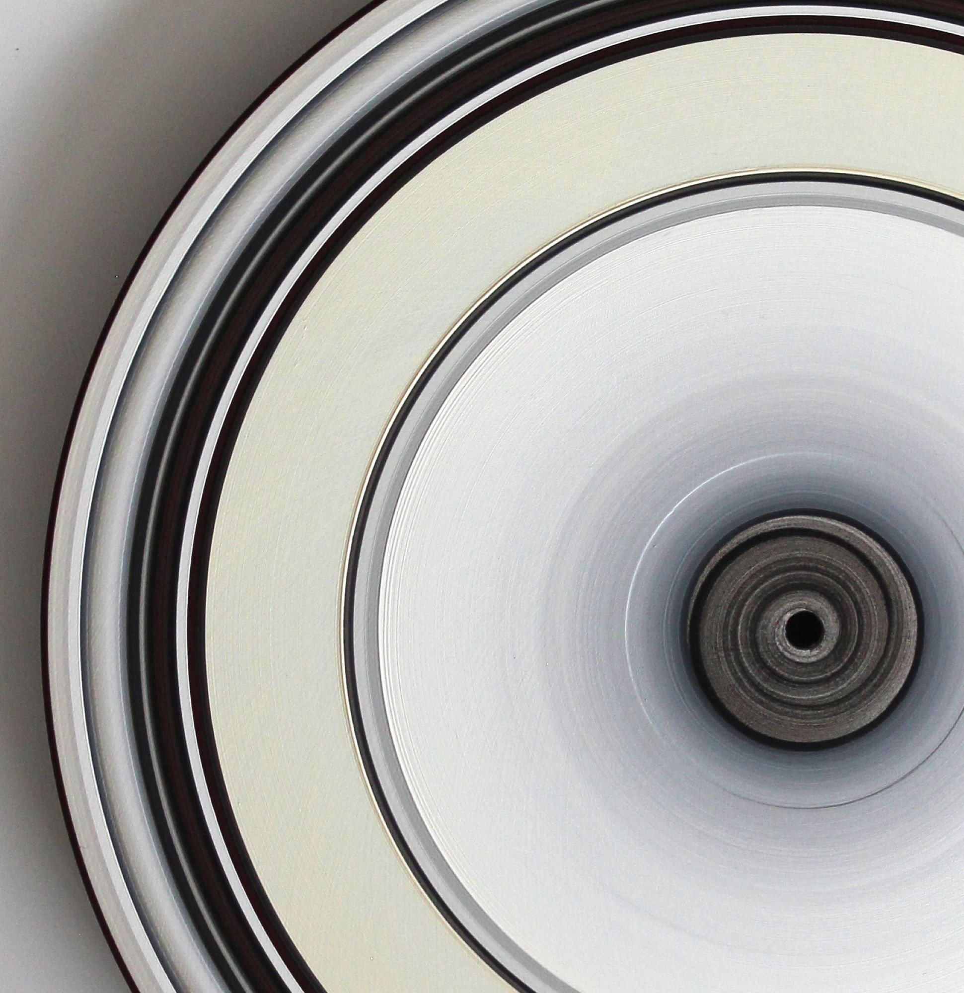 In this last series Sound and Vision, the line remains the only motif of the compositions, but it is illustrated on a new medium which is none other than a vinyl disk. In painting on a turntable, the artist transformed these acoustic data carriers into visual aids: as if the musical pieces are replayed with a brush, in a sort of transformation of sound into image. Individually made in an enduring search for a balance between line, colour and rhythm, these paintings make up an alphabet from which the artist draws on to create different installations and collections.