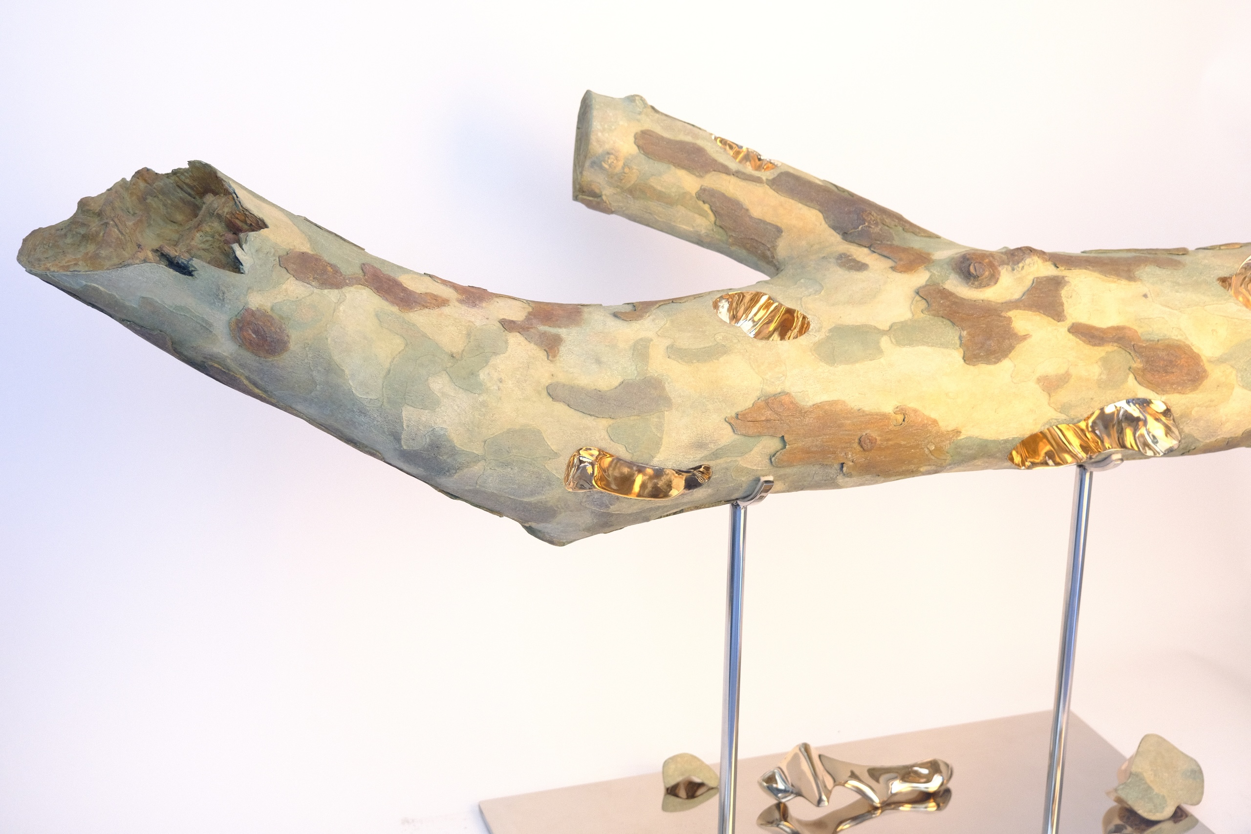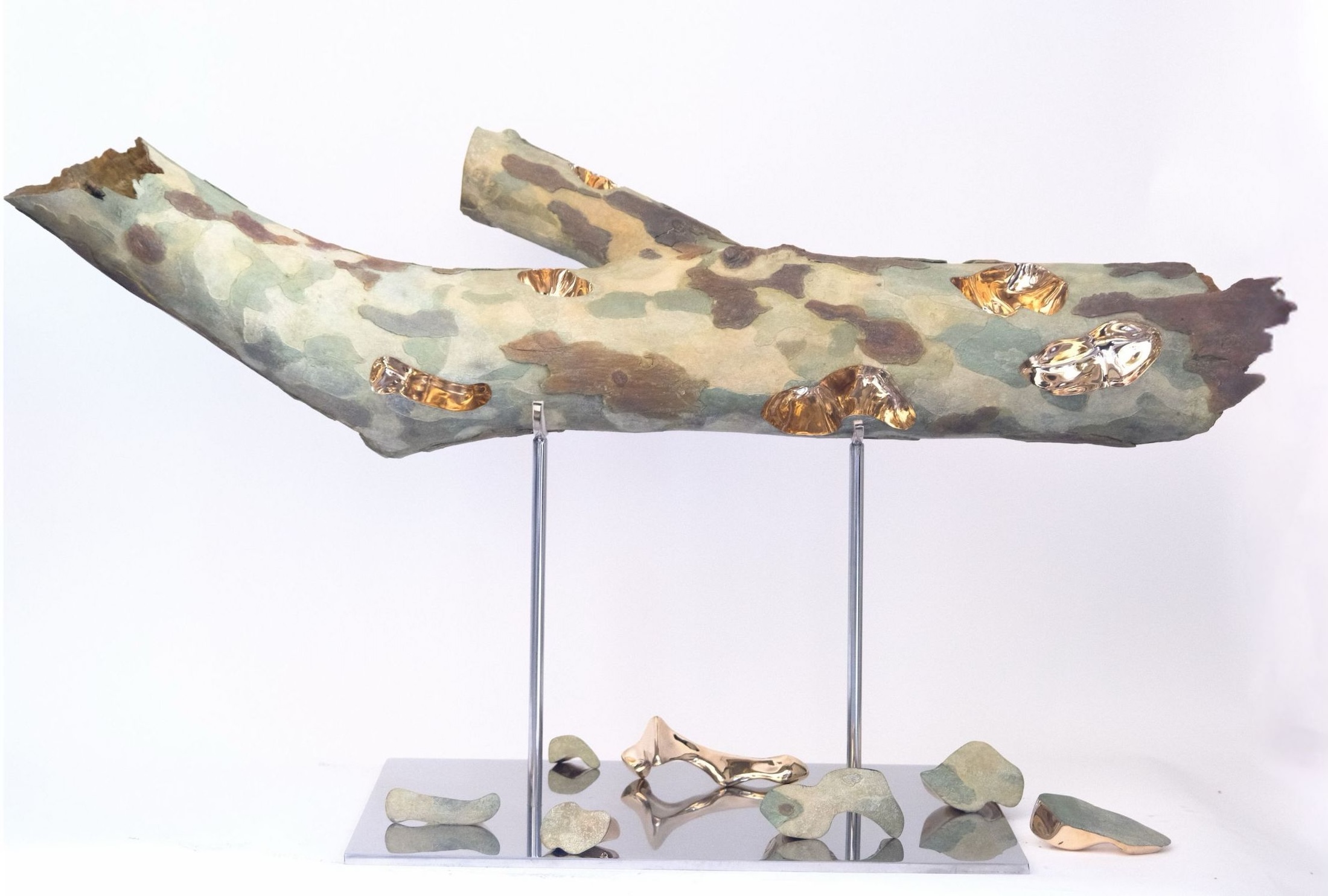 This bronze sculpture represents a cut plane tree branch. The sculpture is made entirely of bronze, with a patina to imitate the bark of the tree, and some hollowed and polished surfaces to create a golden effect. The artis has produced a really realistic imitation of tree bark. The textures are obtained in the casting process and the colours through different patinas. Romain Langlois has denatured this banal object and has bestowed upon it a new and valuable nature that both intrigues us and transforms our impression of it.