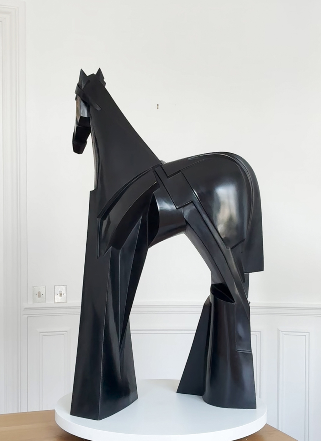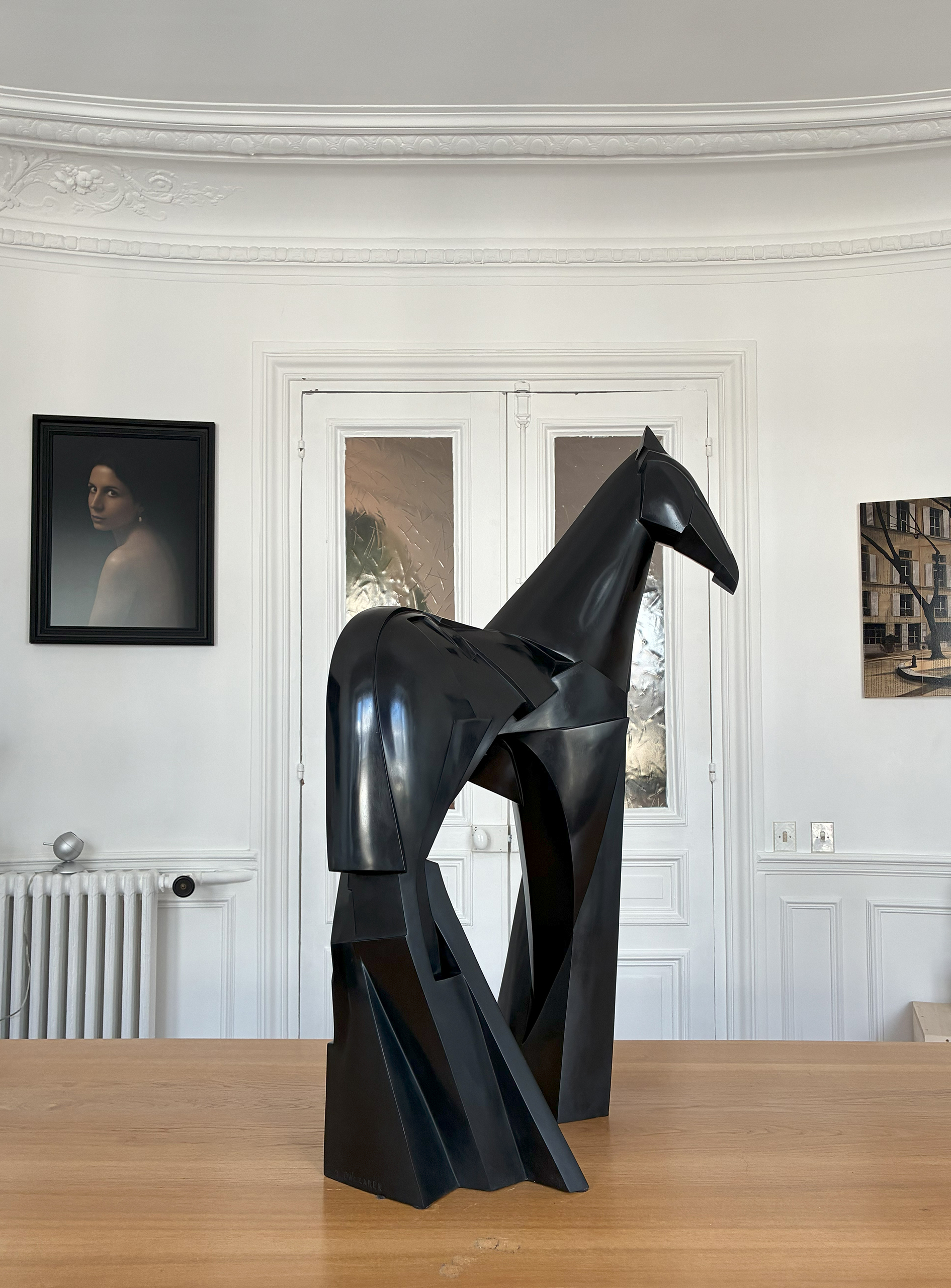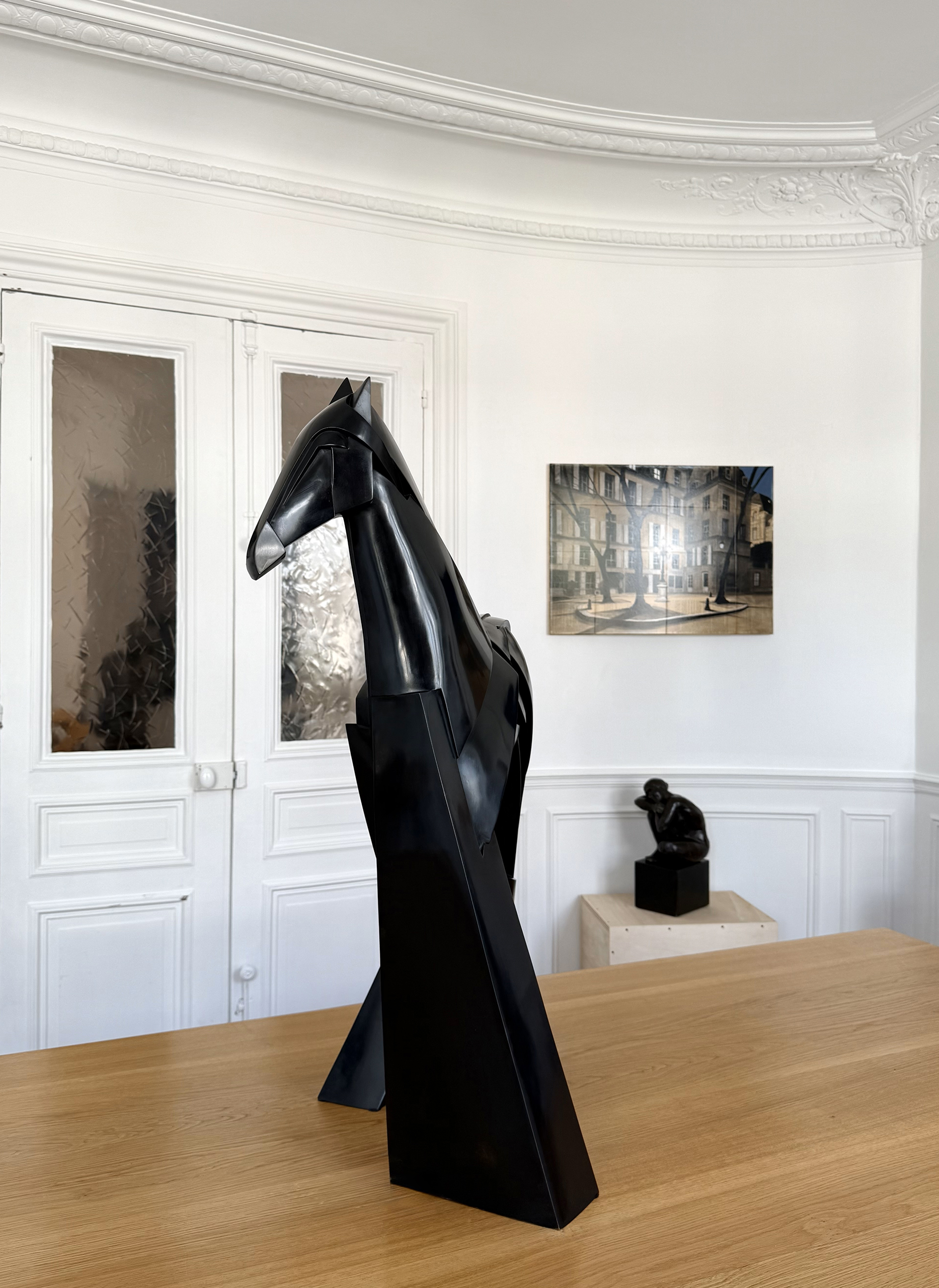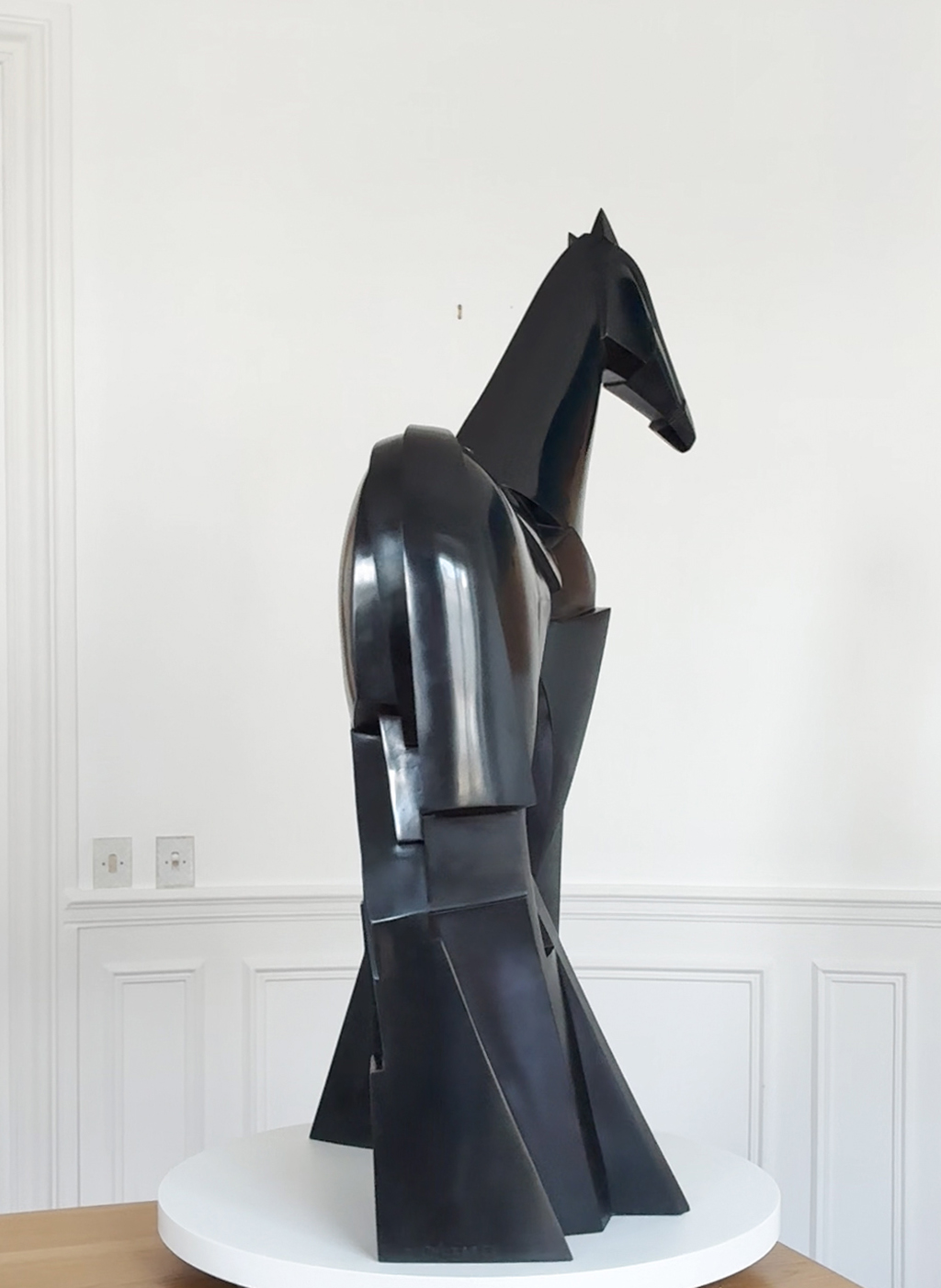 This horse in bronze takes shape through a series of lines, edges and curves. The animal’s characteristics are recognizable : its head, its tail and its legs. But the peculiarity of the artist’s interpretation comes to the fore in the clarity of the shape, the sharpness of the lines, the sculpture’s geometric aspect. Enough elements to render this horse a unique piece, brimming with emotion.