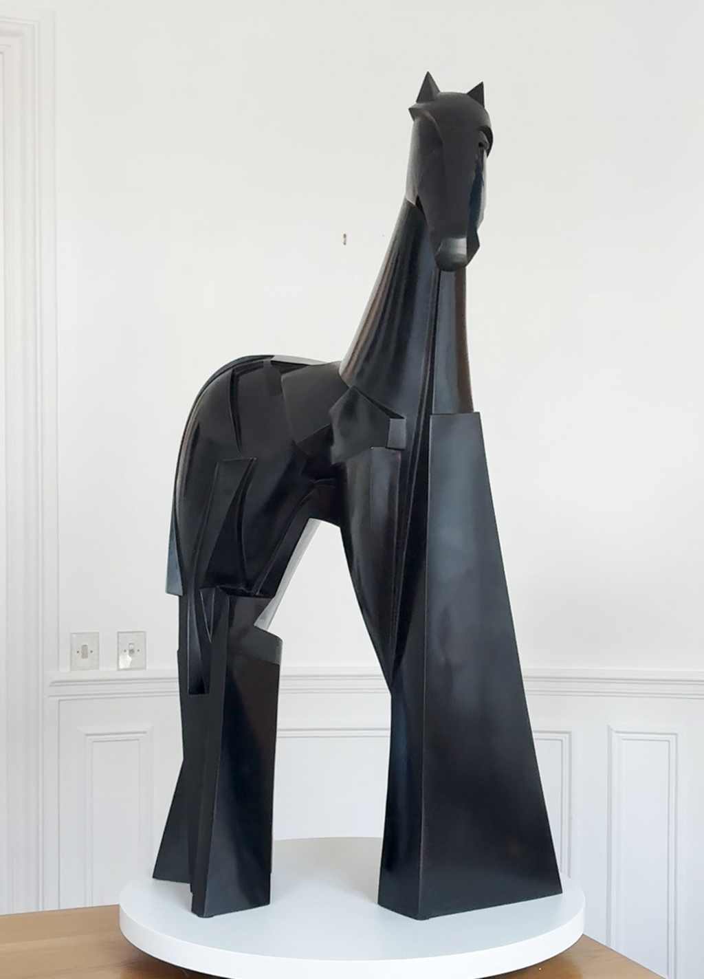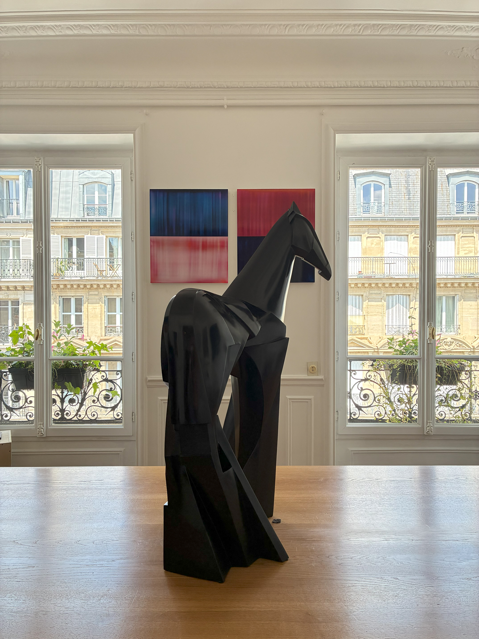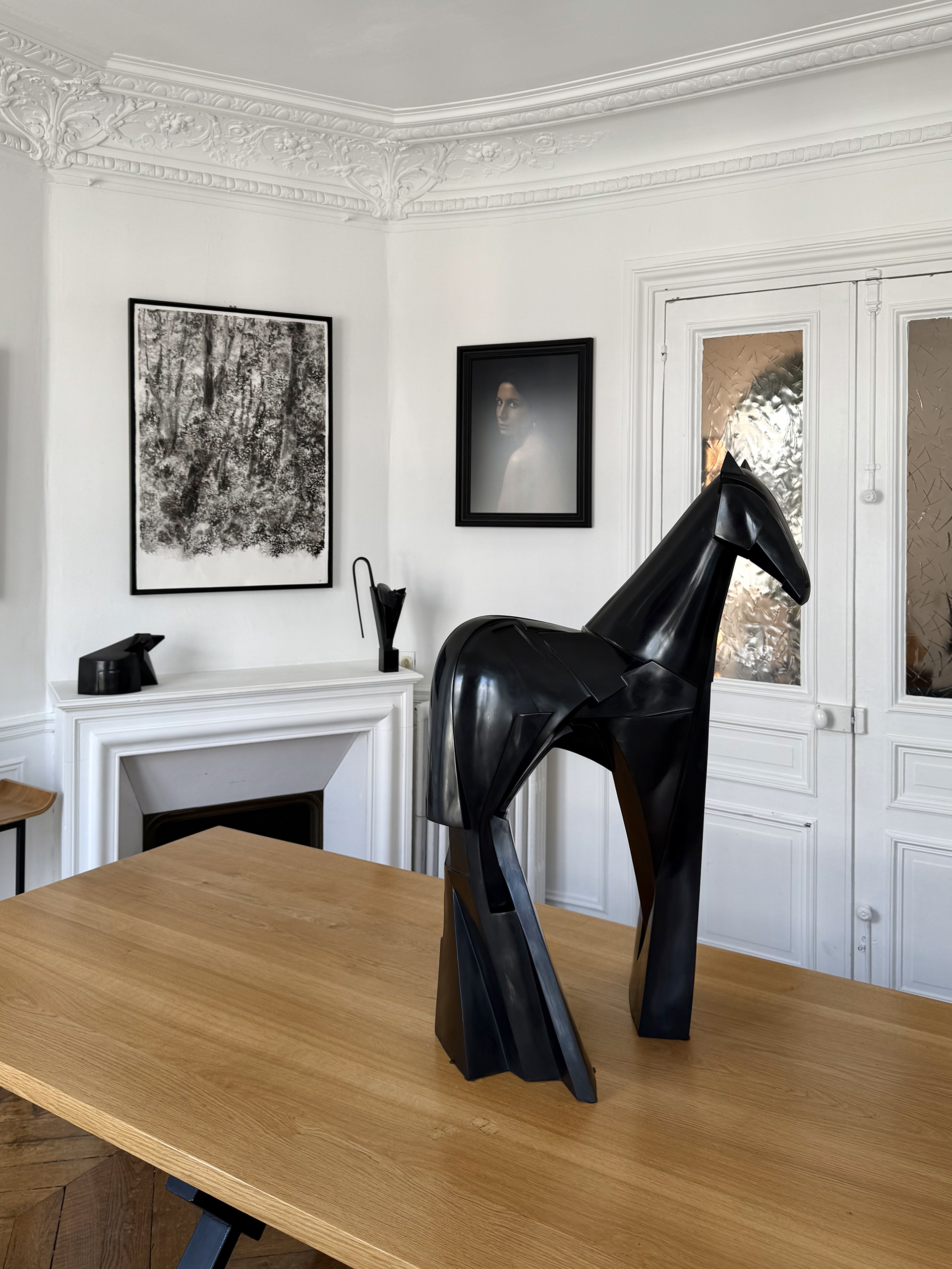 This horse in bronze takes shape through a series of lines, edges and curves. The animal’s characteristics are recognizable : its head, its tail and its legs. But the peculiarity of the artist’s interpretation comes to the fore in the clarity of the shape, the sharpness of the lines, the sculpture’s geometric aspect. Enough elements to render this horse a unique piece, brimming with emotion.