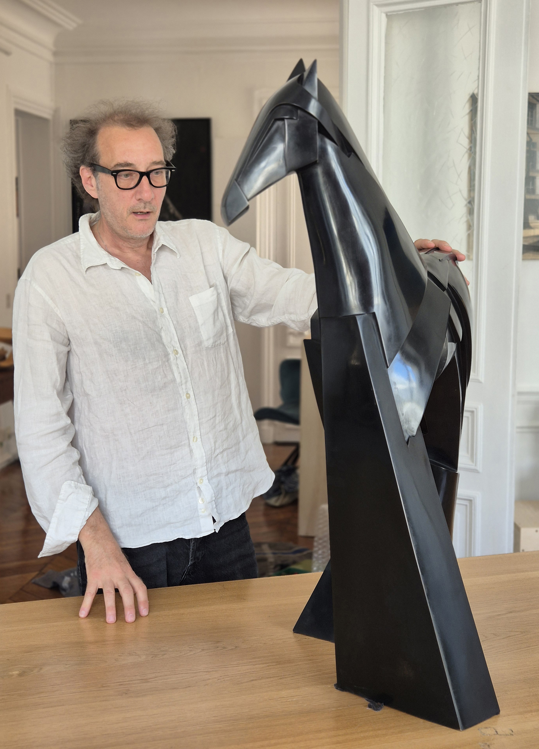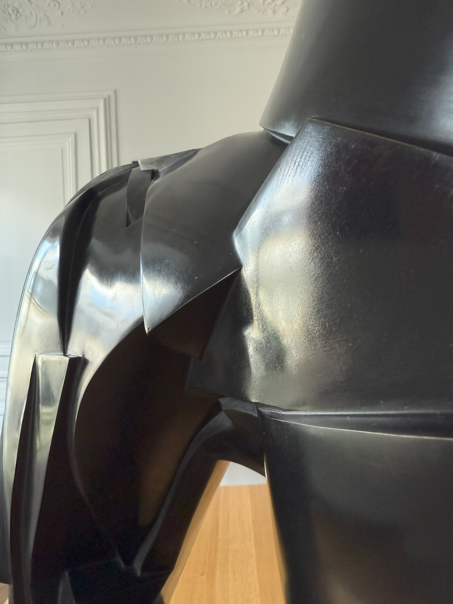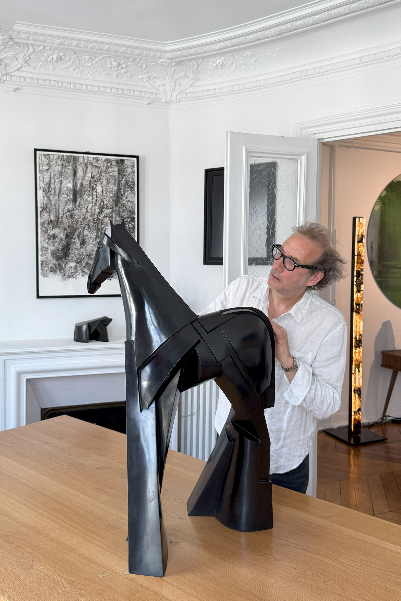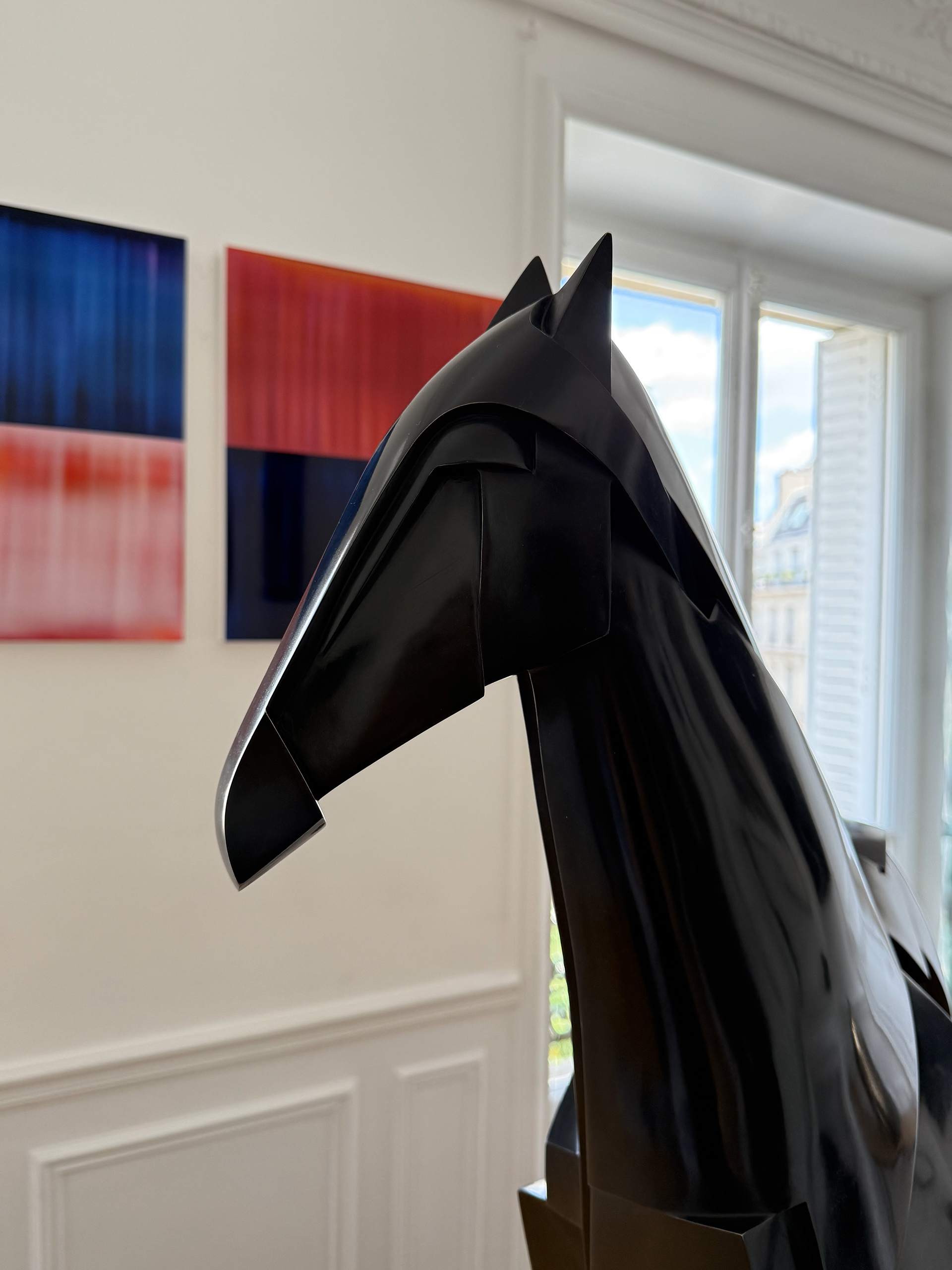 This horse in bronze takes shape through a series of lines, edges and curves. The animal’s characteristics are recognizable : its head, its tail and its legs. But the peculiarity of the artist’s interpretation comes to the fore in the clarity of the shape, the sharpness of the lines, the sculpture’s geometric aspect. Enough elements to render this horse a unique piece, brimming with emotion.