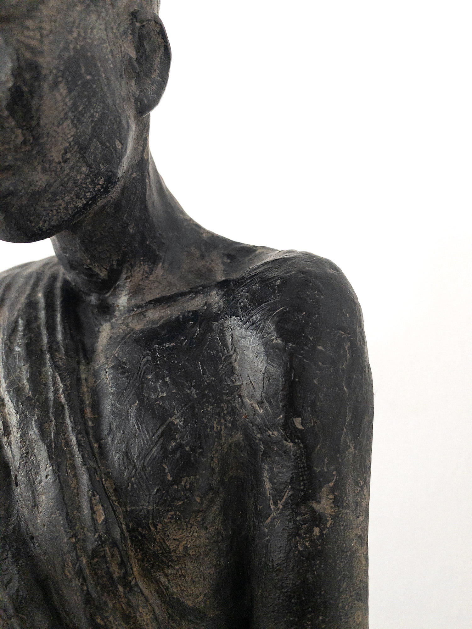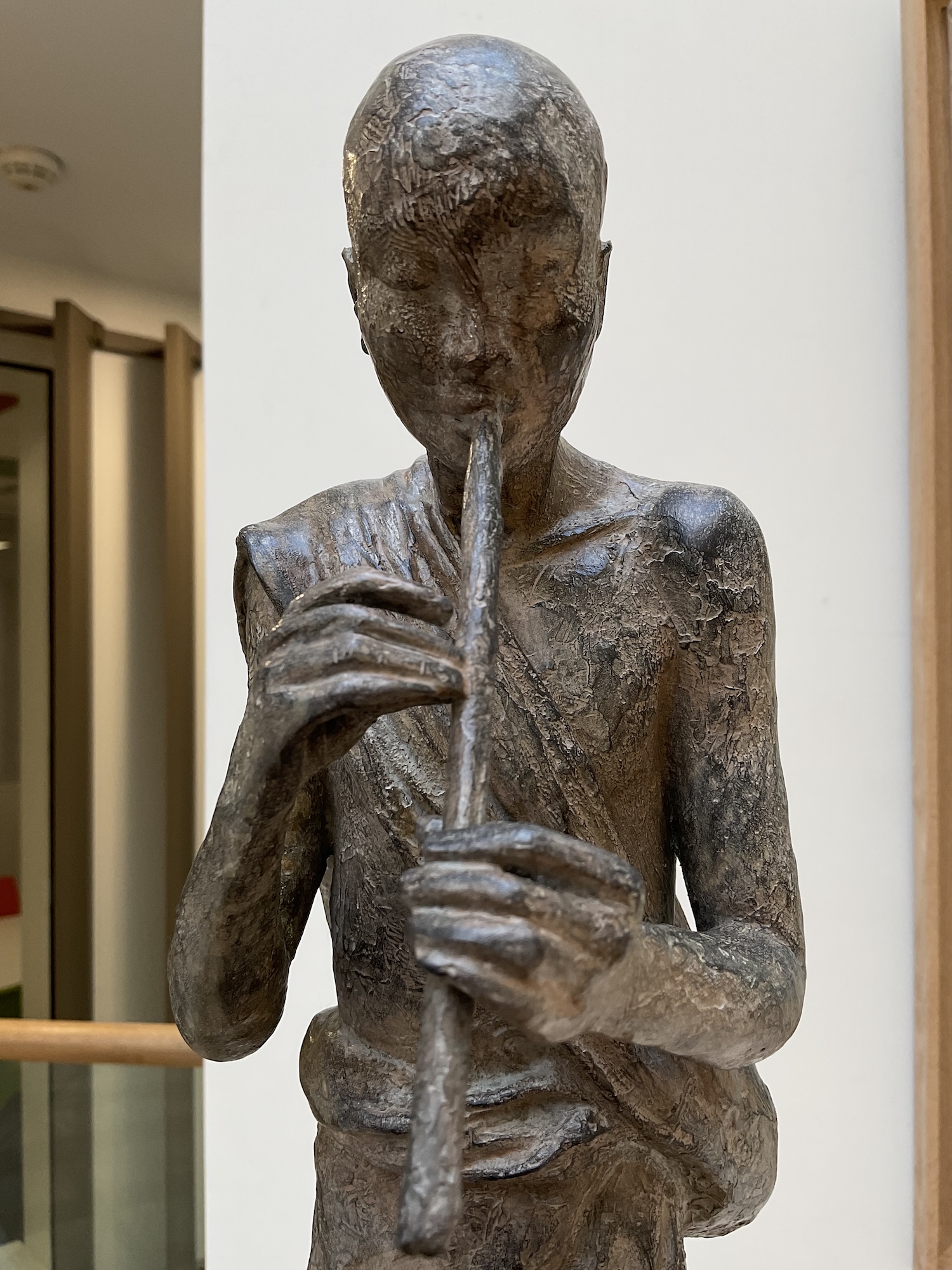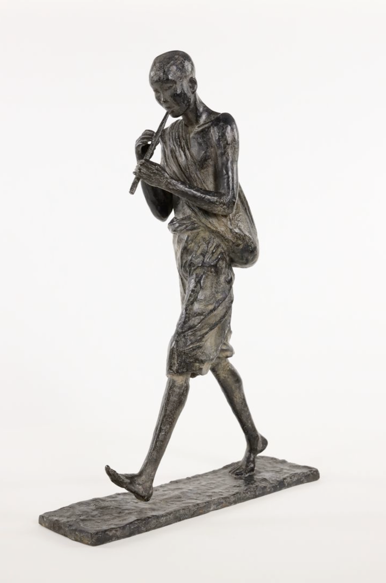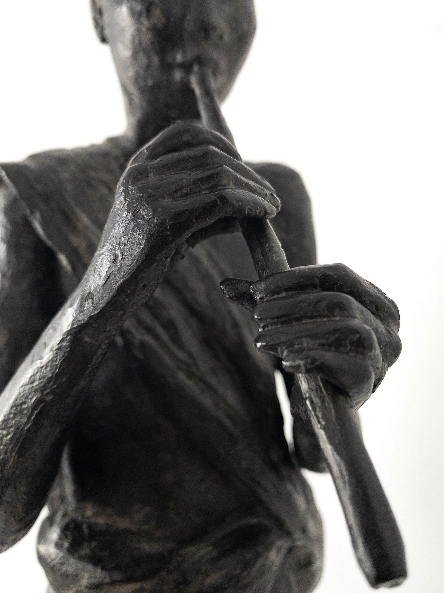 Young Flute Player is an artwork by French contemporary sculptor Marine de Soos. This bronze sculpture is from the “Figures” series. This figurative artwork represents a man, walking barefoot, simply dressed, playing the flute.