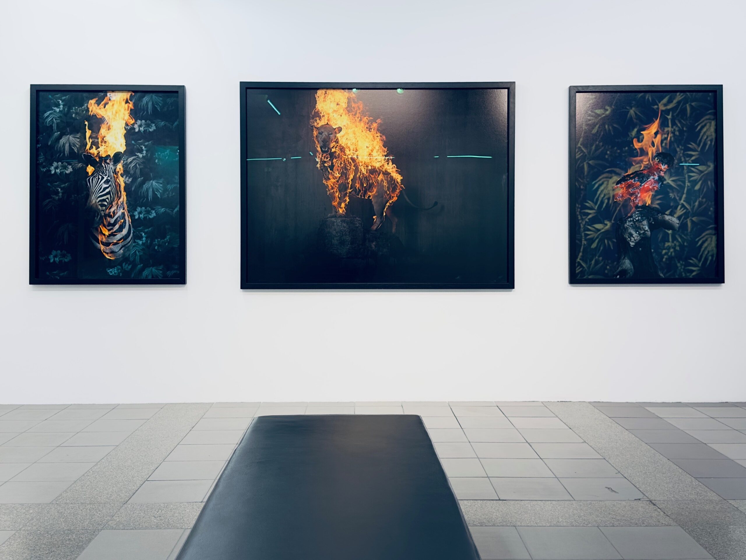These photographs are areas of cultural and mythological reference through which Christian Houge creates. Immortalising the destructive fire, he celebrates the animal’s release from the condemned to a state of permanent and eternal degradation. This scene, disturbing as it is frightening, represents a passive triumph for the animals who gradually die out on a backdrop of a luxurious nature reproduced by Victorian tapestries. The latter were chosen by the photographer to embody the human century-old imperialism over nature and their fellow man.