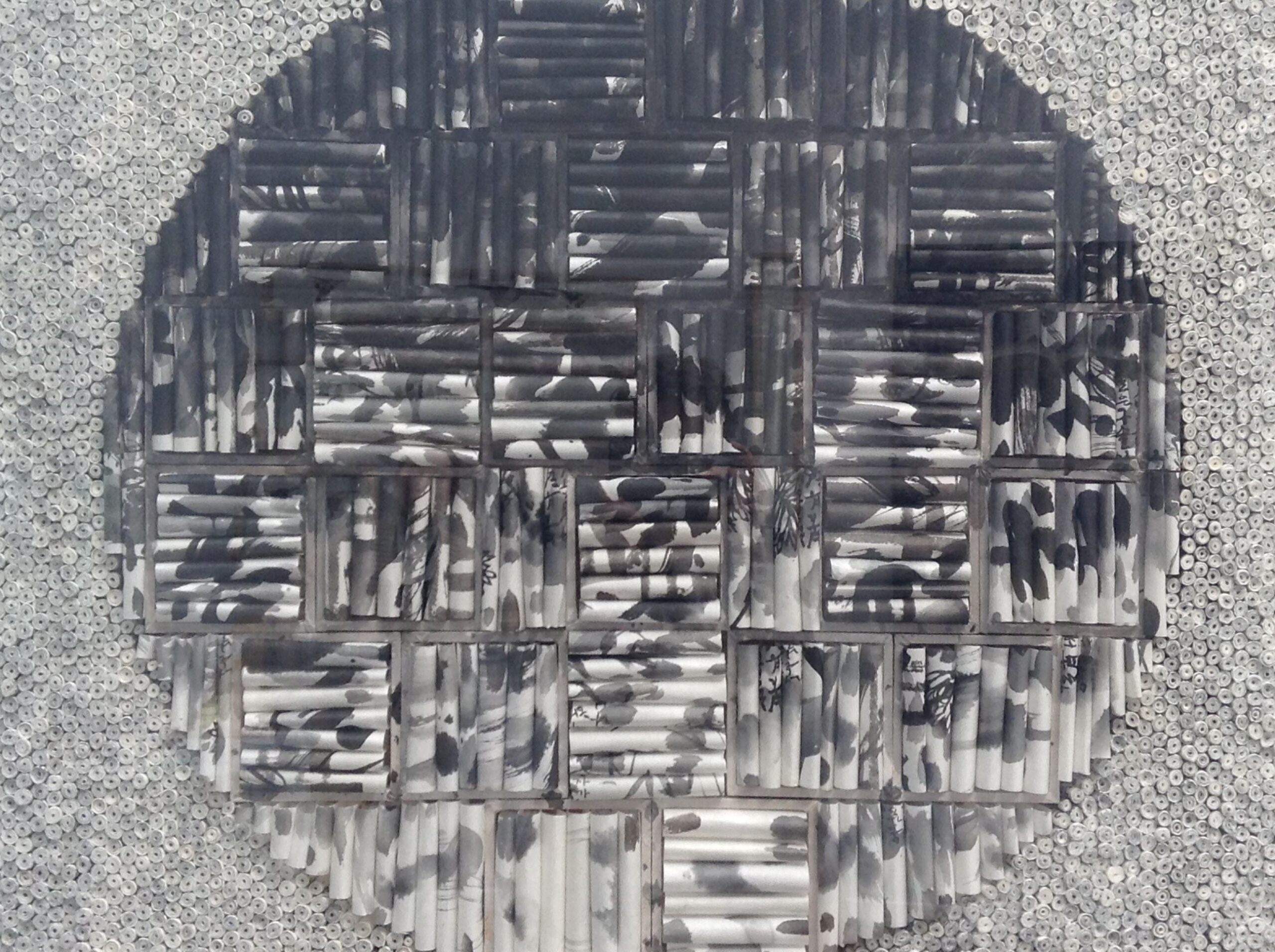 Two artists from Seoul, coming from two different galleries, used a similar procedure that was quite astonishing. Ilhwa KIM cut out, hand painted and folded thousands of Korean Blackberry leaves to create a piece in 3D. The work, the colours and the shapes all change depending on where one is standing. Lucio LIM used nearly the same technique to make geometric compositions in black and white using China ink.
