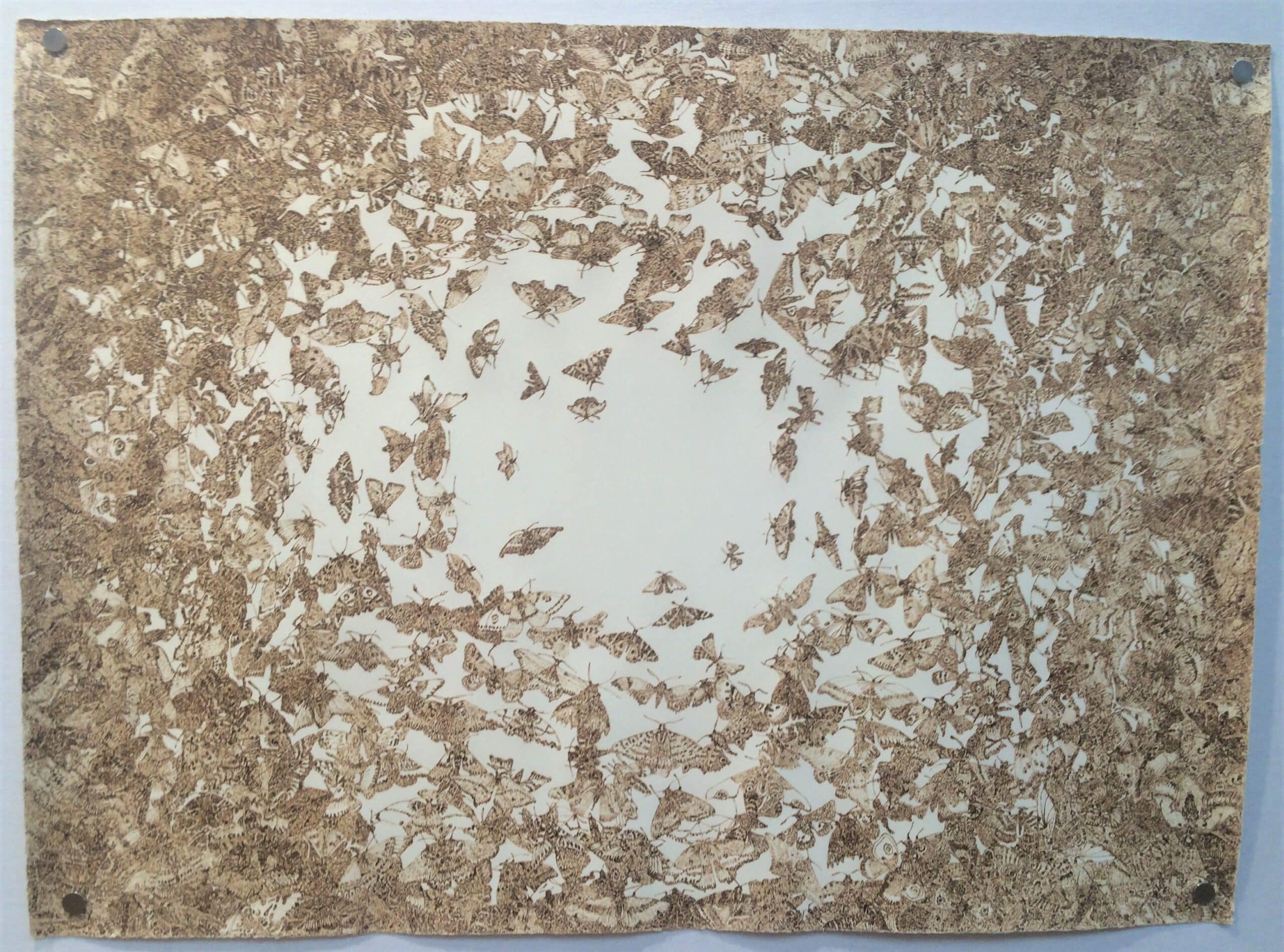 Marianne Lang’s work boasts an original process. Indeed, she uses pyrography with remarkable skill in the compositions of her butterflies