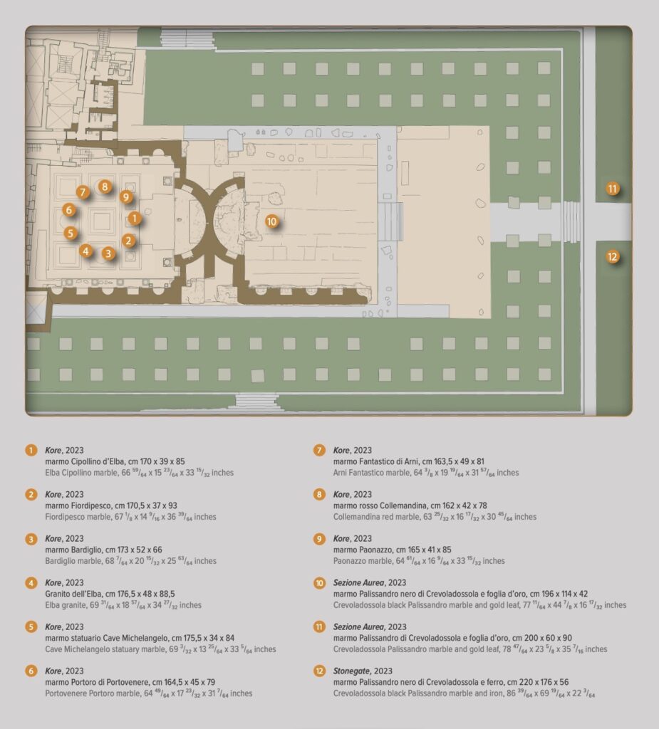 In the first chamber, nine human-sized sculptures will be arranged in a circle, all of them with the same form, but each one cut from a different marble: Cipollino, Portoro, Baradiglio, the Carrara marble, etc. These materials which once graced columns, inlaid floors, and walls, now return as sculptures, creating a material and temporal continuity that unites the past, present, and future.